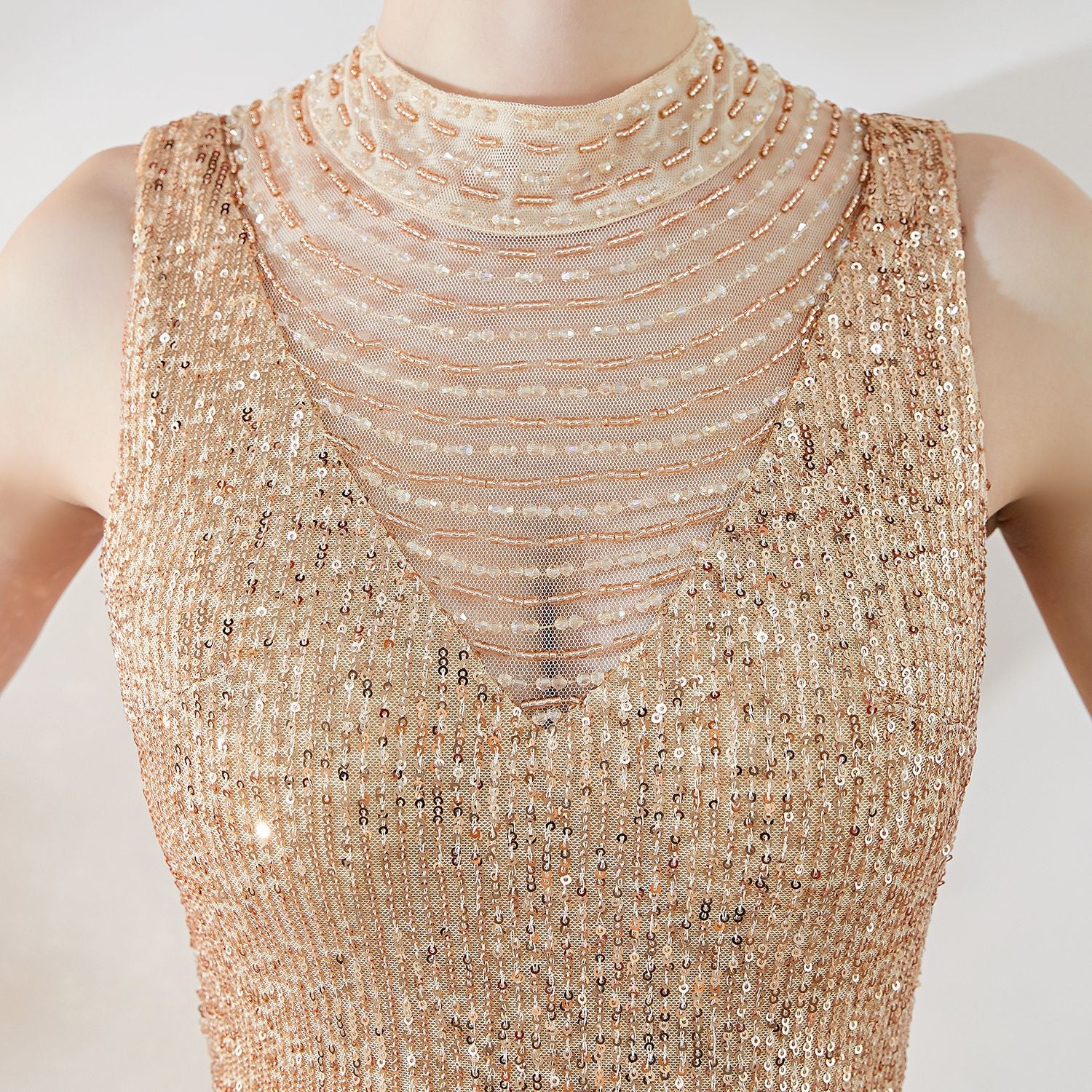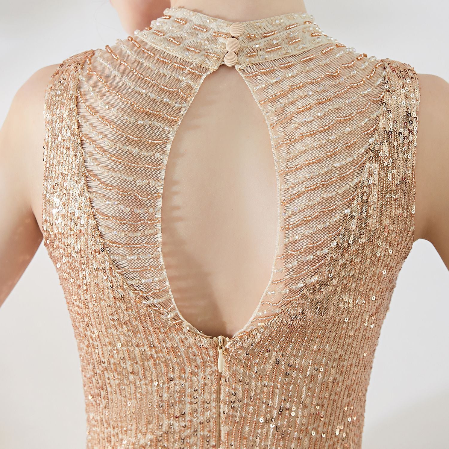 A sequined fishtail maxi drapes slim and poised. It features a crew neck and cutout accents with sequin embellishment.