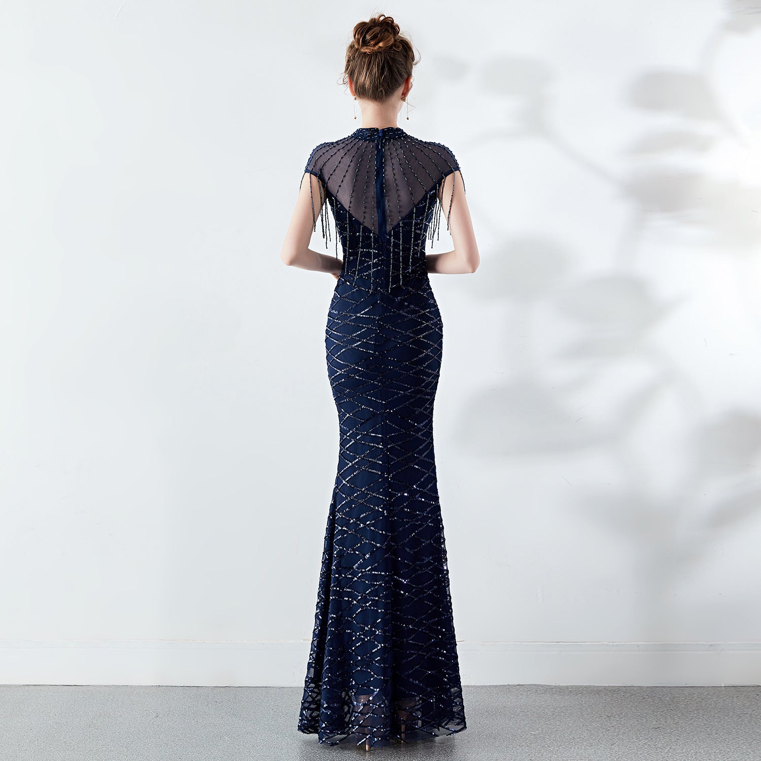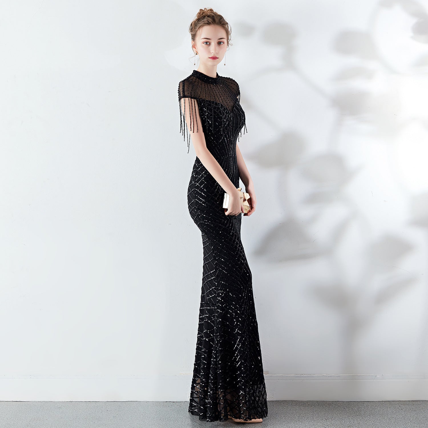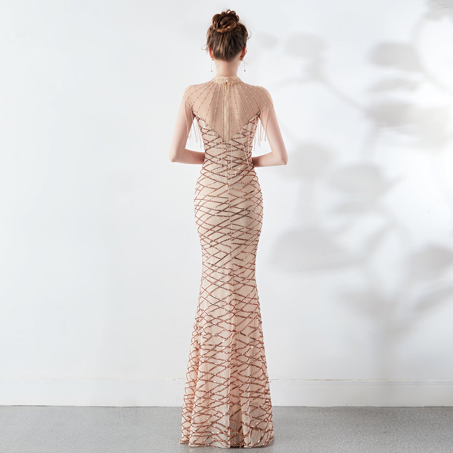 A sequined fishtail maxi with a slim silhouette. The mock neck, discreet back zipper, and fringe along the hem feature lace/tulle accents.