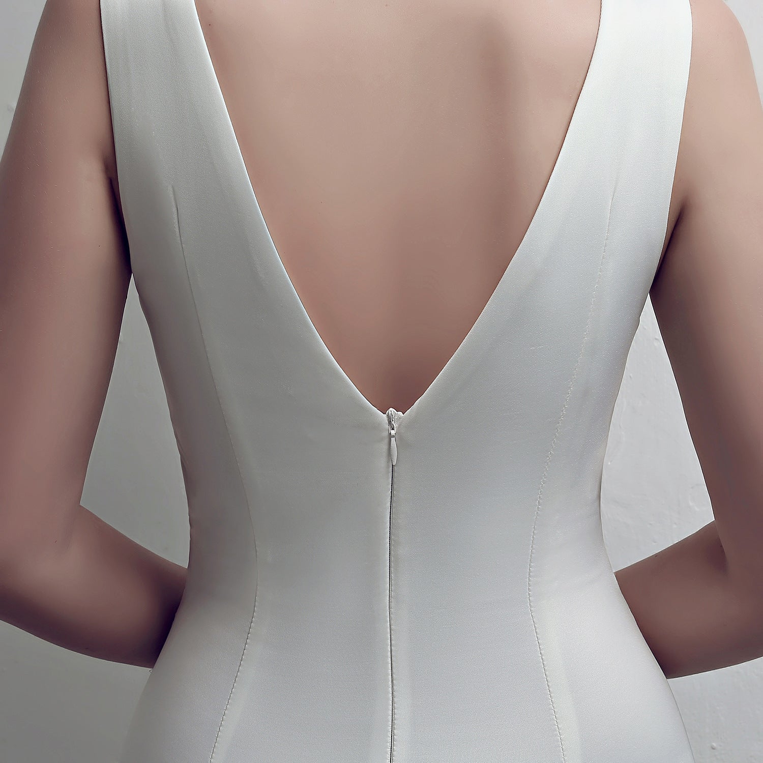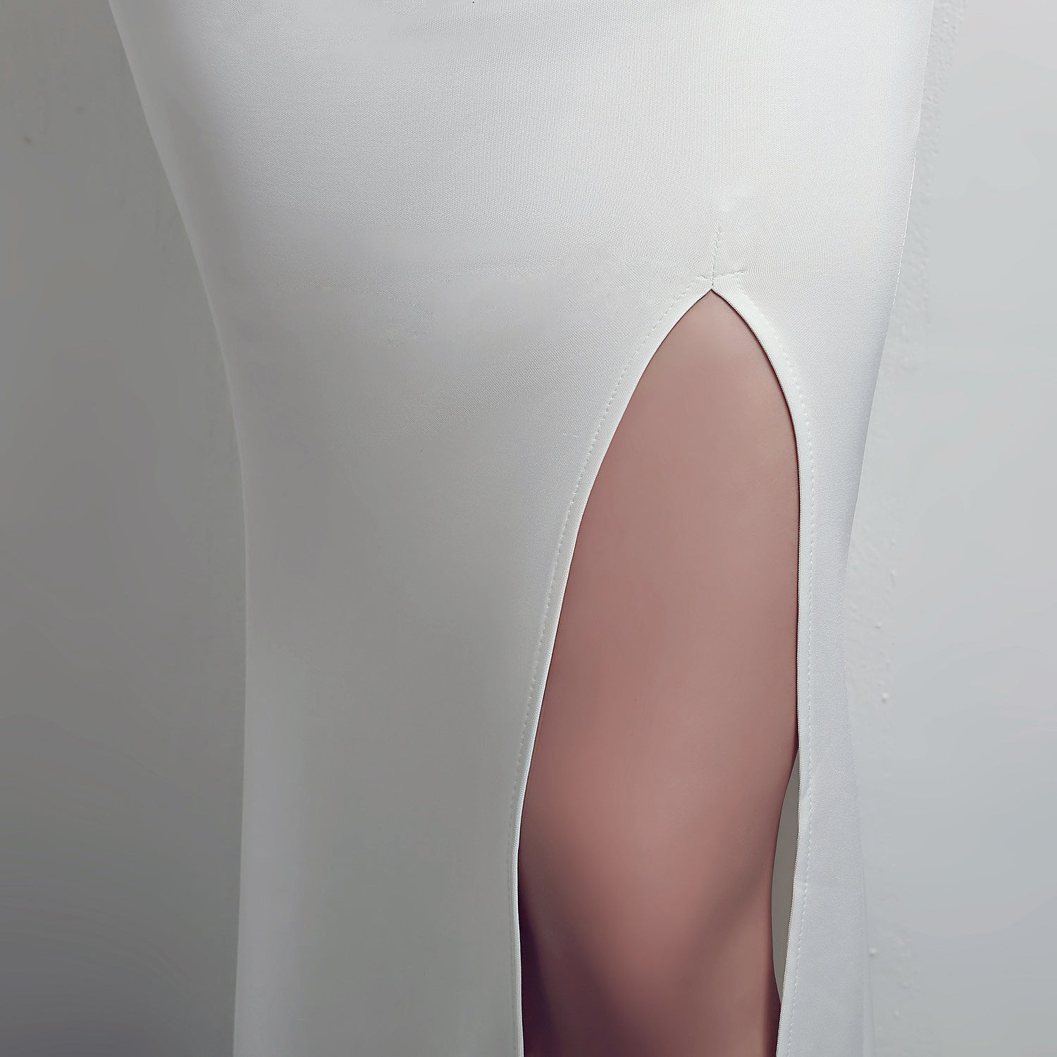 An evening maxi with a slim, figure-skimming silhouette. A V-neck with rhinestone detailing and cutouts complements a dramatic fishtail hem and high split.