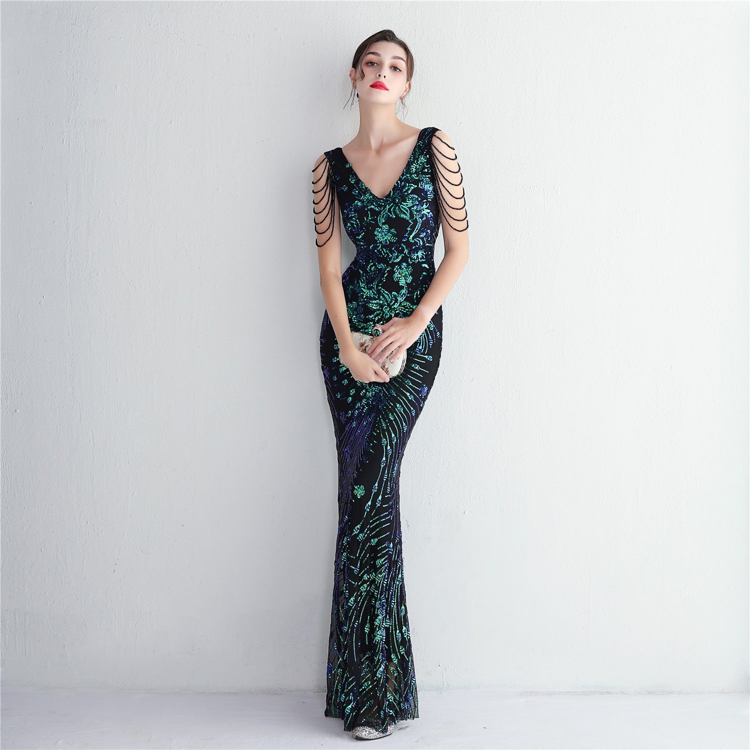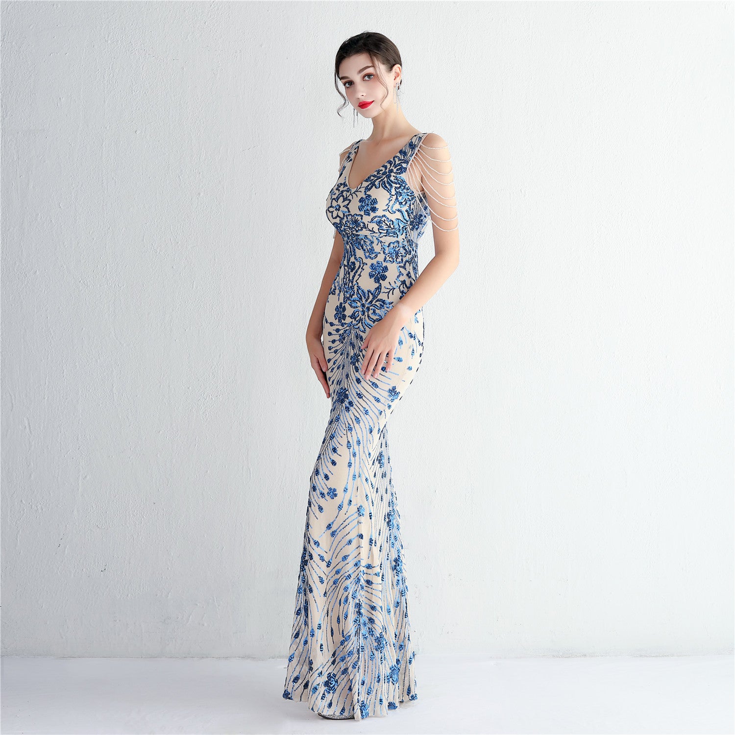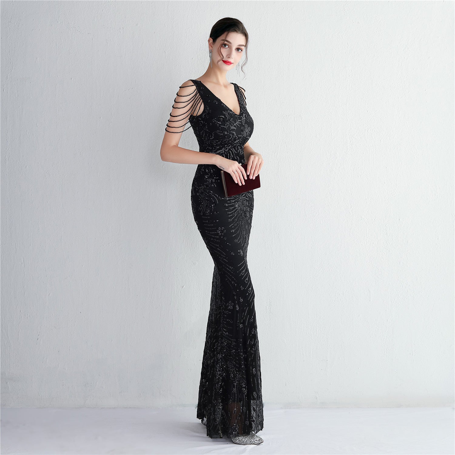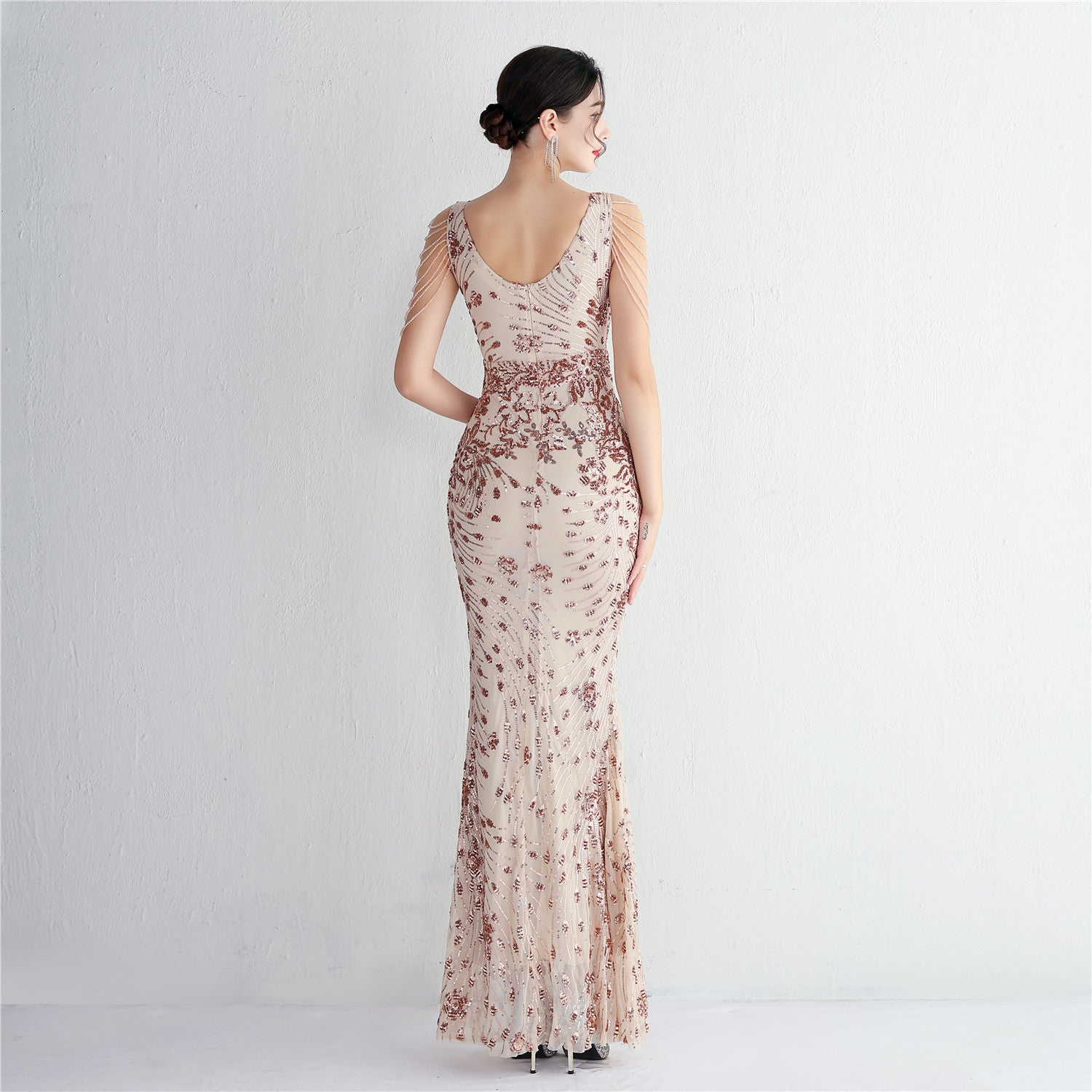 A sequined maxi with a slim silhouette. The V-neckline frames the sequins, and a hidden back zipper keeps the line clean.