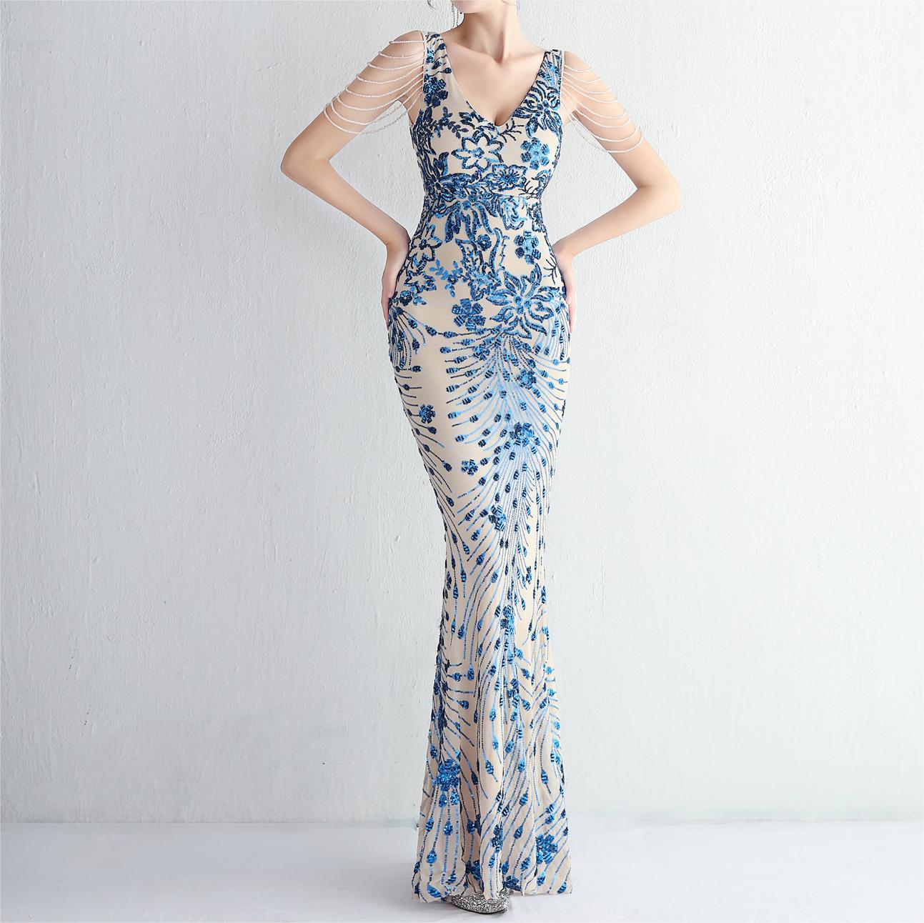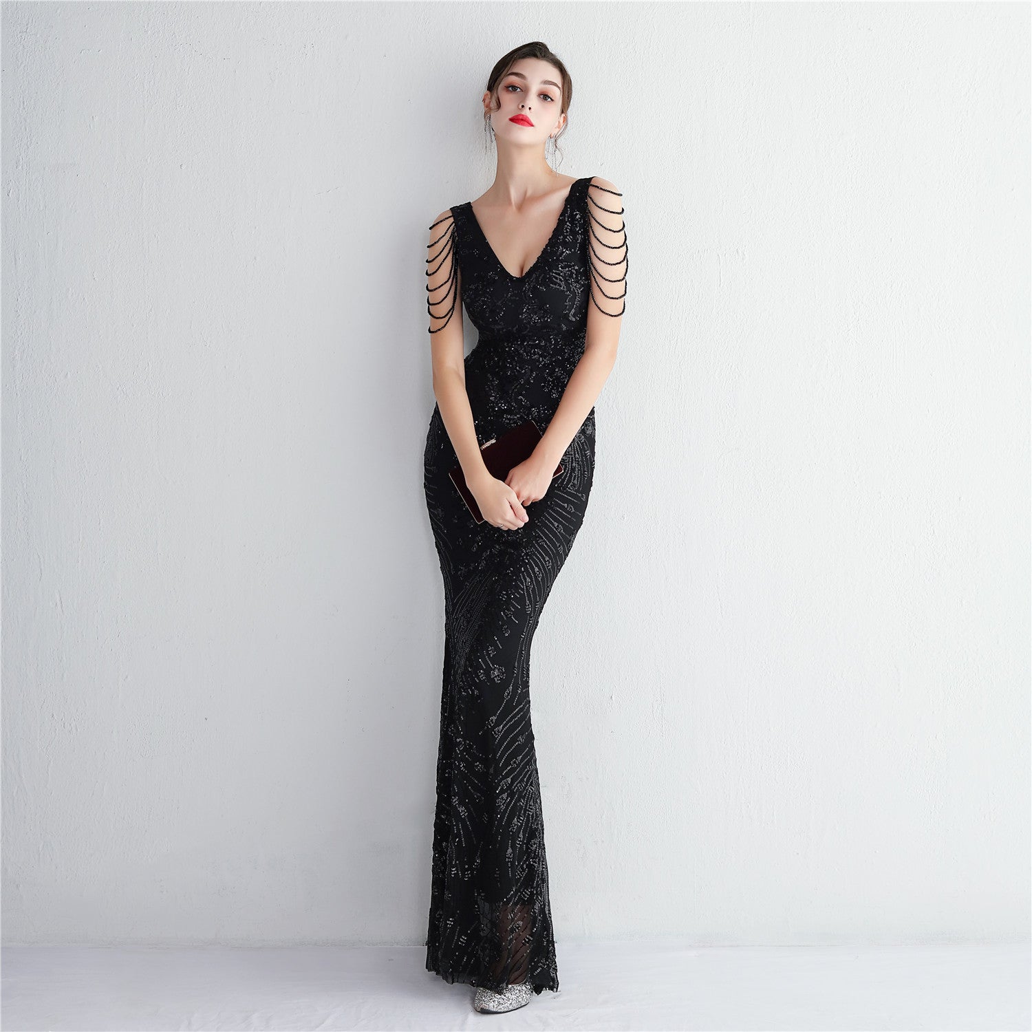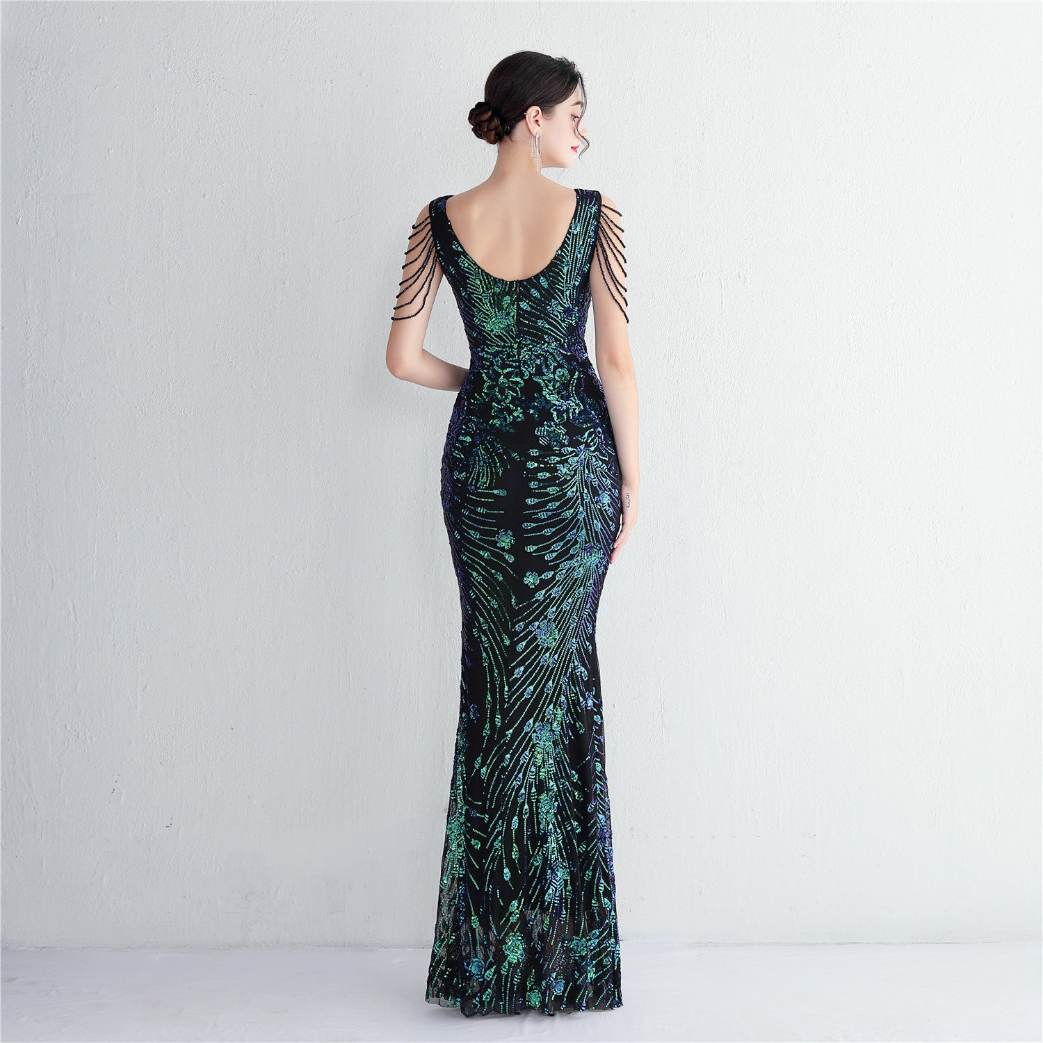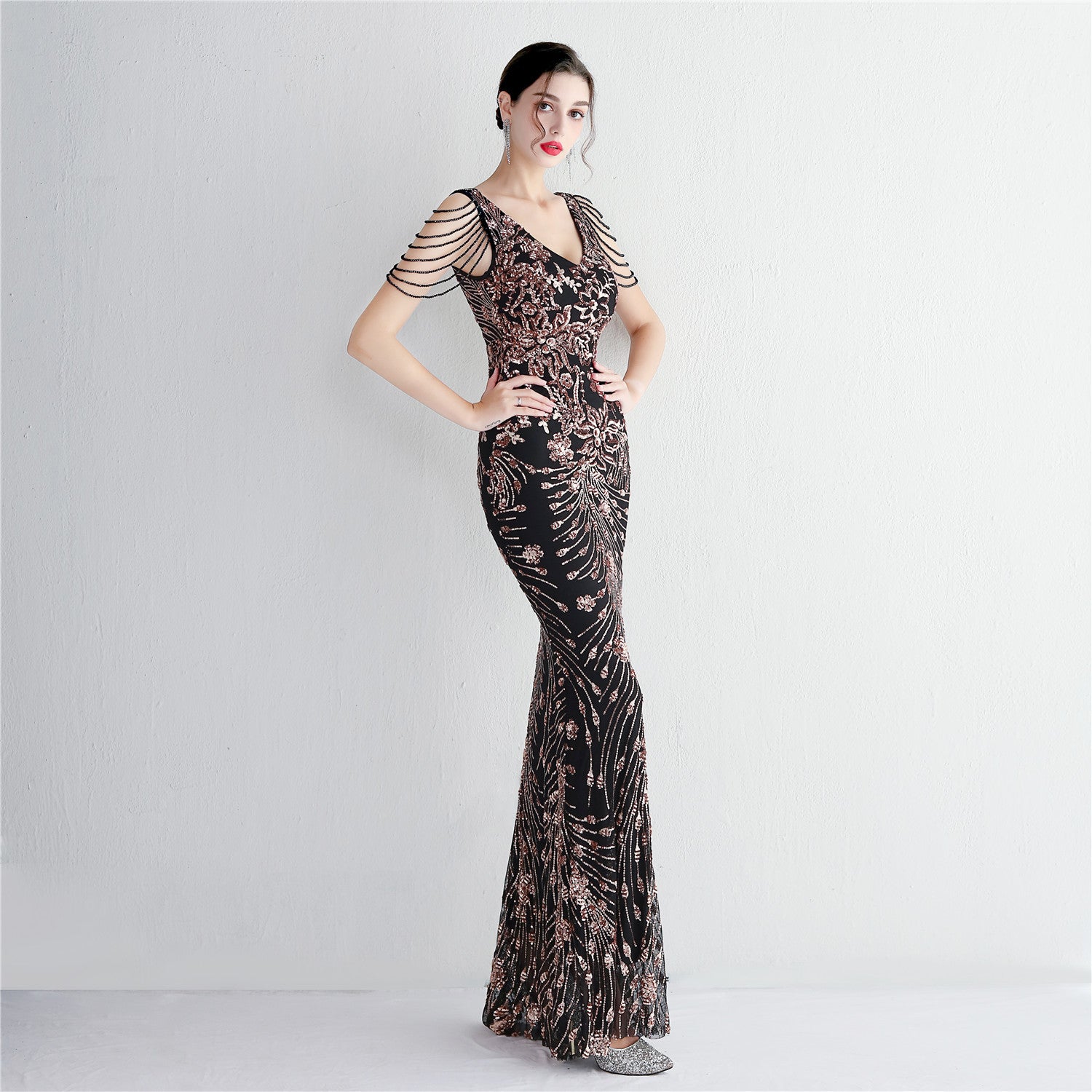 A sequined maxi with a slim silhouette. The V-neckline frames the sequins, and a hidden back zipper keeps the line clean.