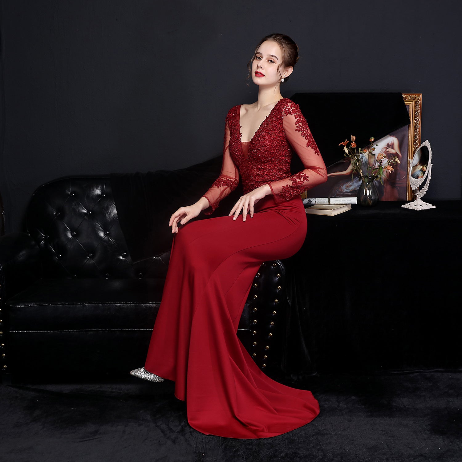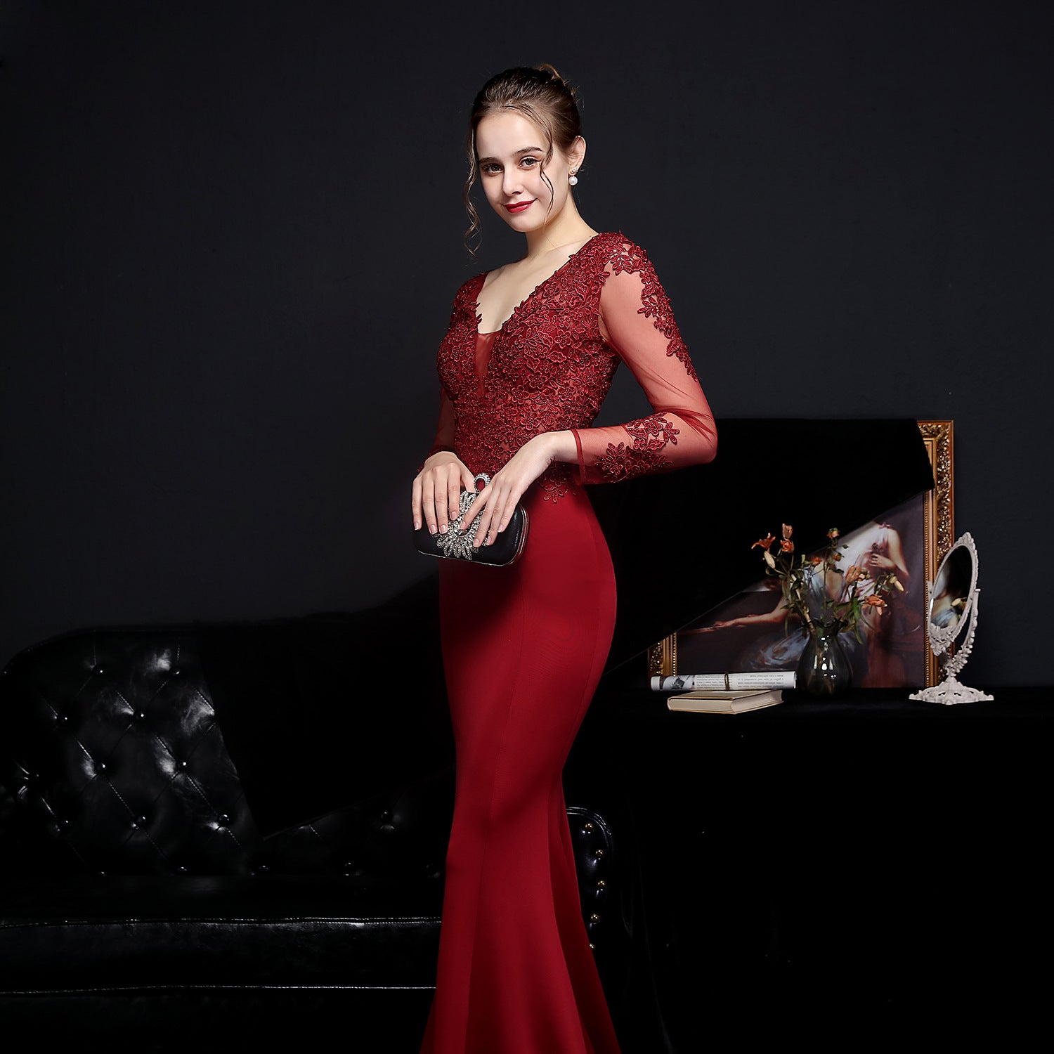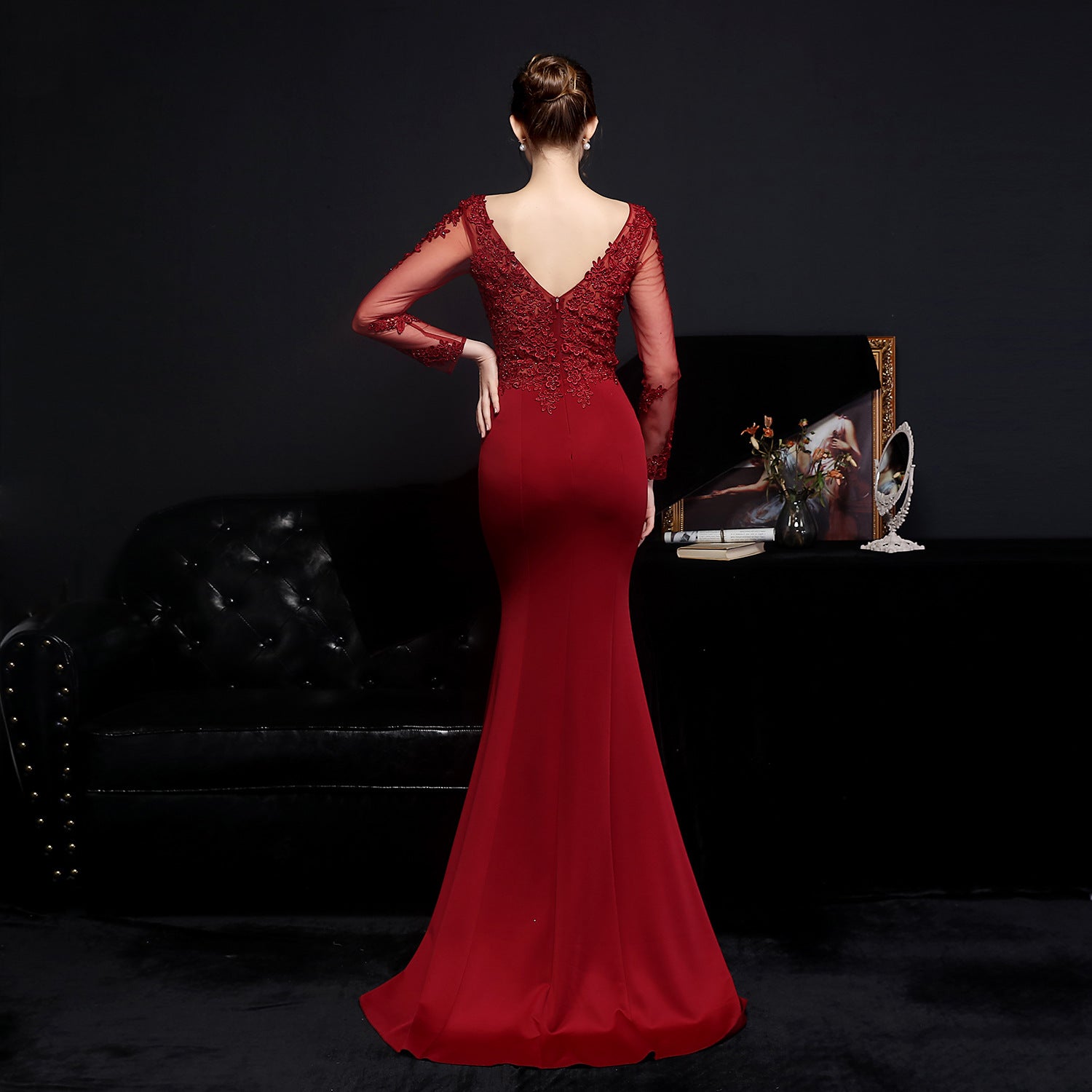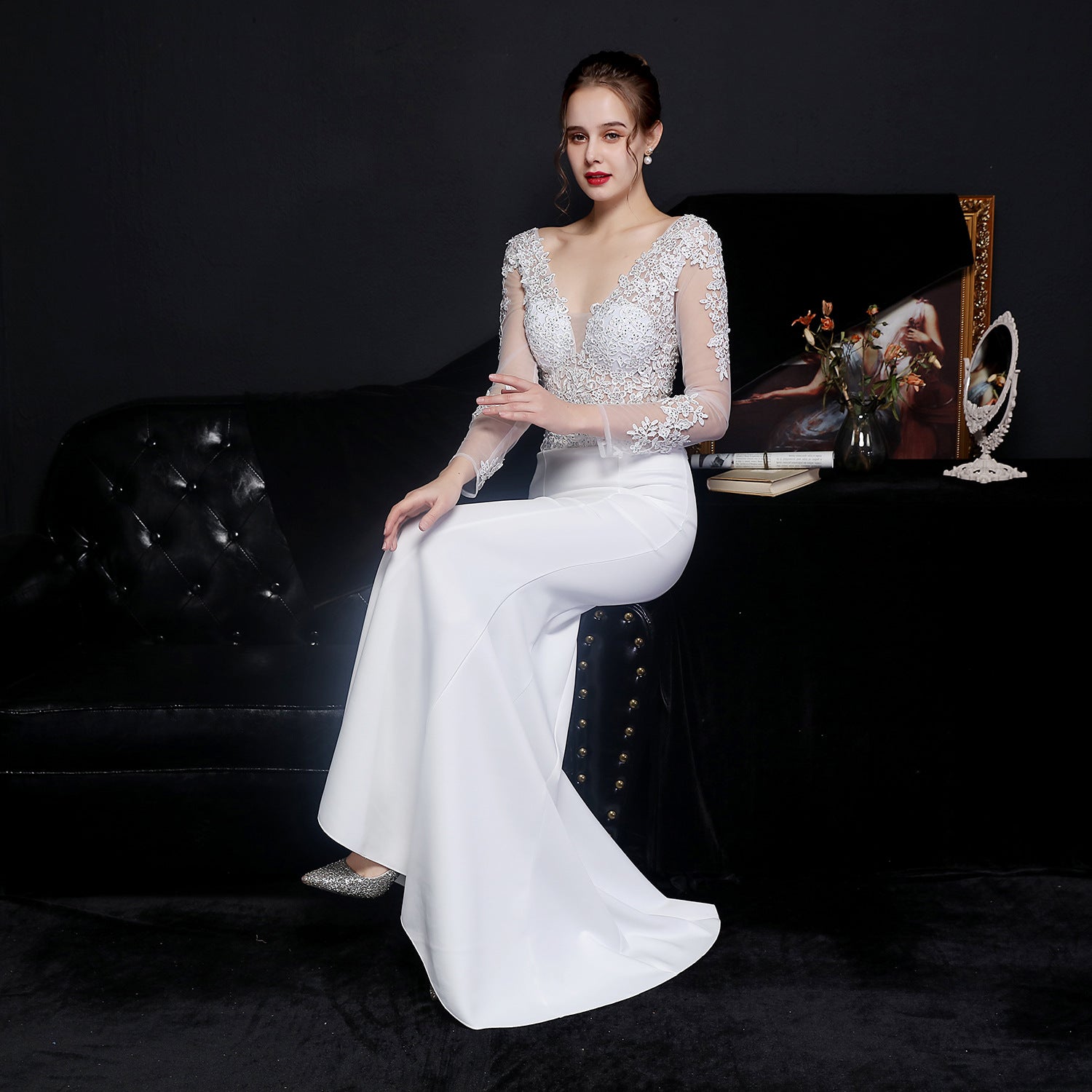 The dress features a fitted bodice that flows into a dramatic fishtail skirt. Lace and rhinestone embellishments highlight its refined silhouette, with long sleeves completing the look.