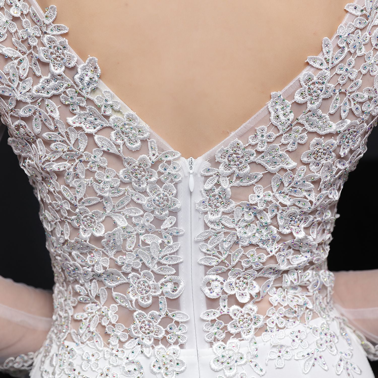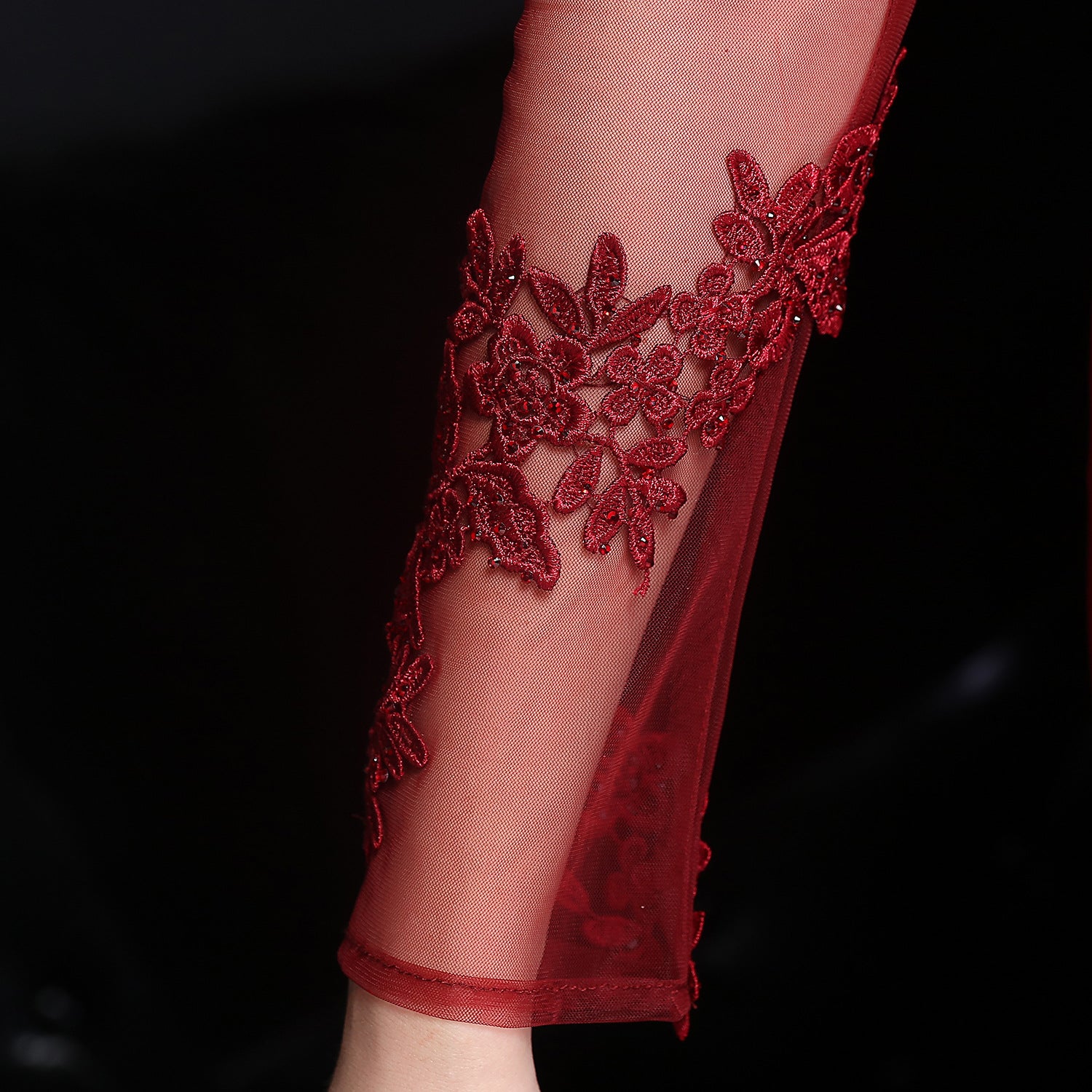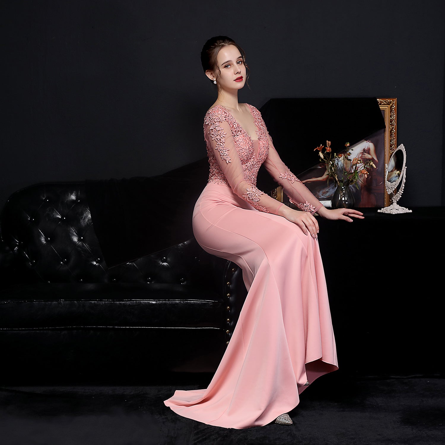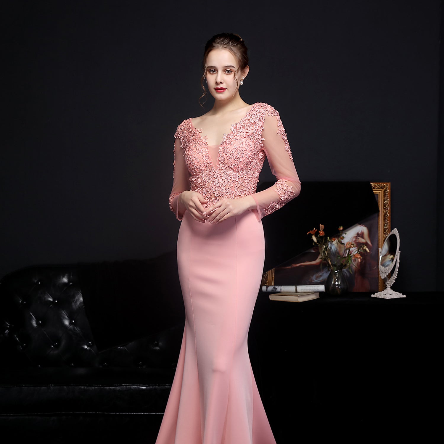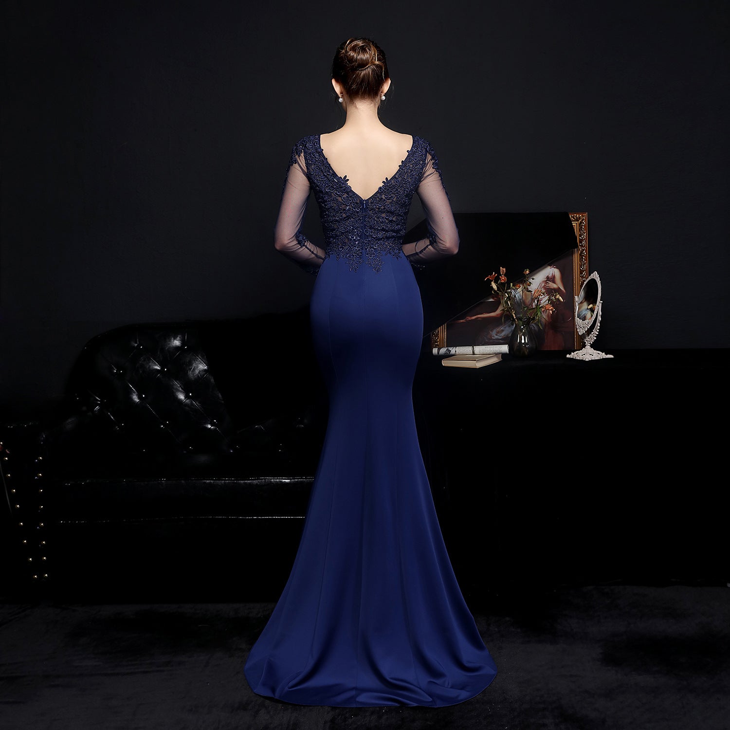 The dress features a fitted bodice that flows into a dramatic fishtail skirt. Lace and rhinestone embellishments highlight its refined silhouette, with long sleeves completing the look.