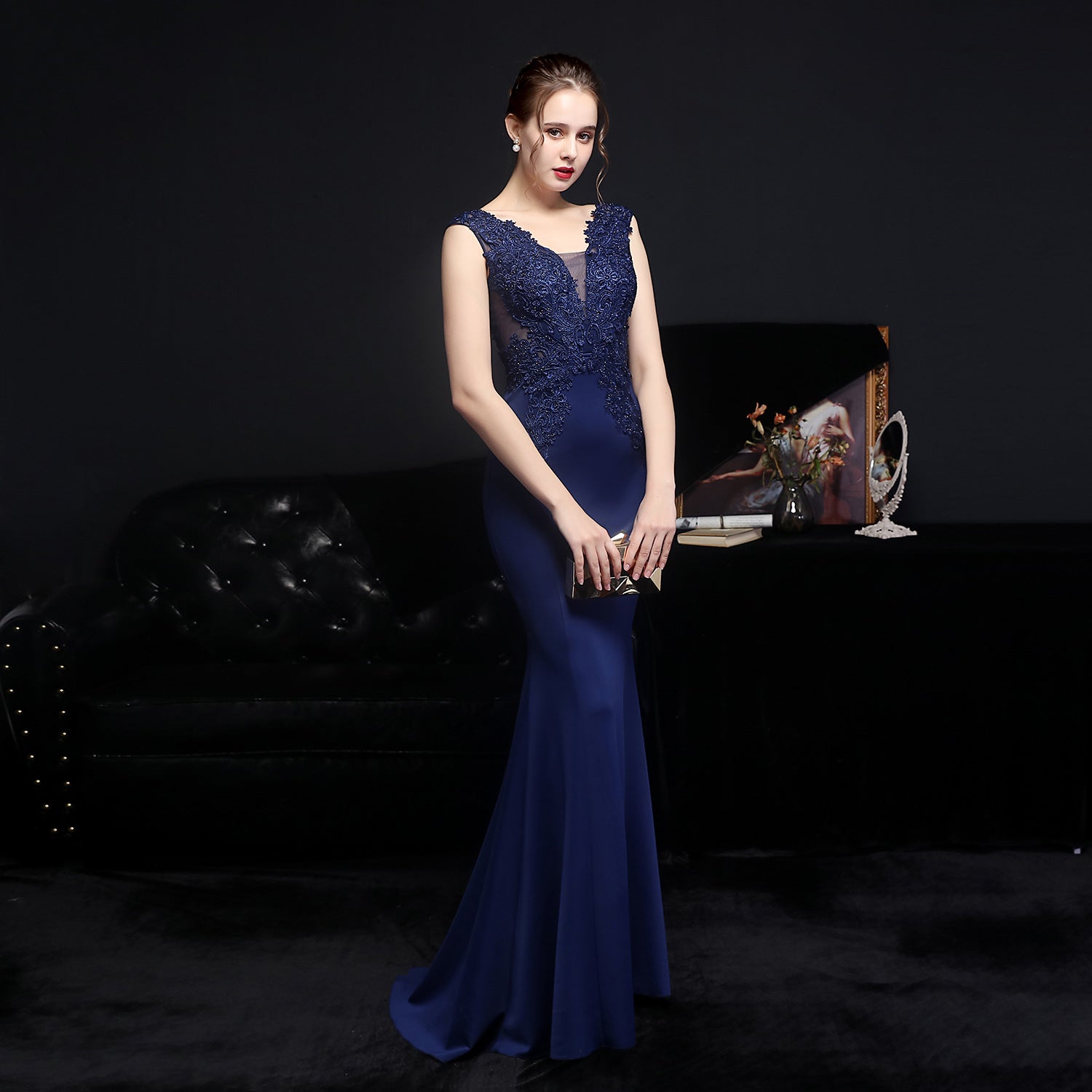 The Diamond Embroidered Fishtail Maxi Dress presents a sleek, floor-skimming silhouette. A V-neckline guides the eye to diamond embroidery at the bodice, while the sleeveless, slim cut flows into a dramatic fishtail skirt.