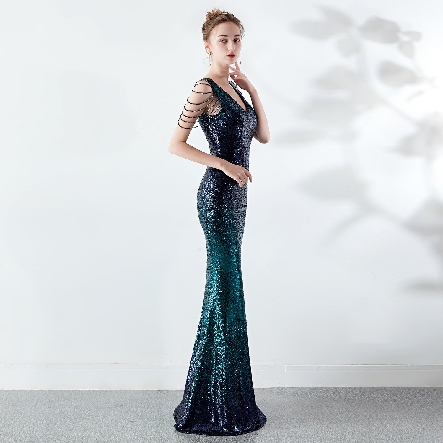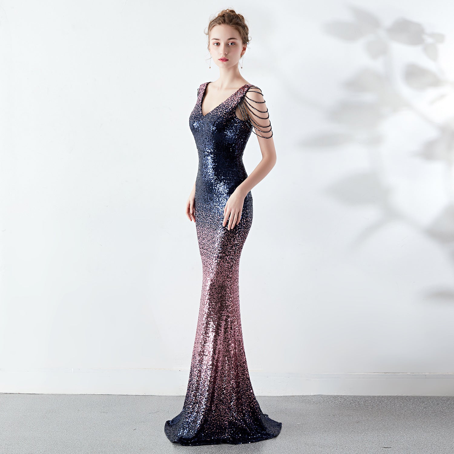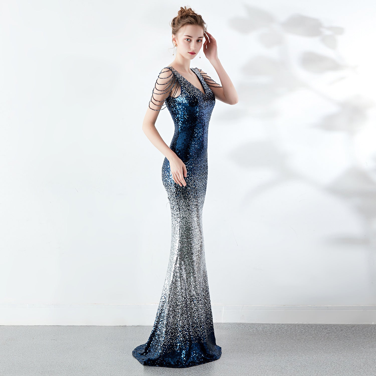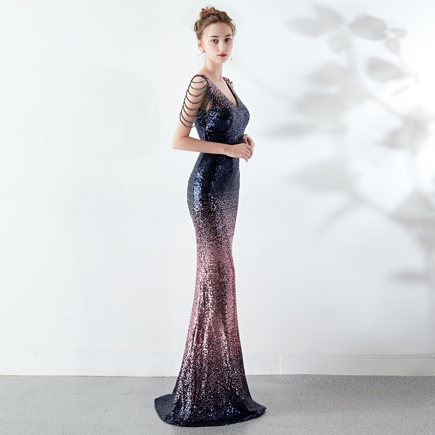 A slender evening dress with a clean, modern line. A rhinestone chain embellishment sits at the neckline, with an ombre fade along the length.