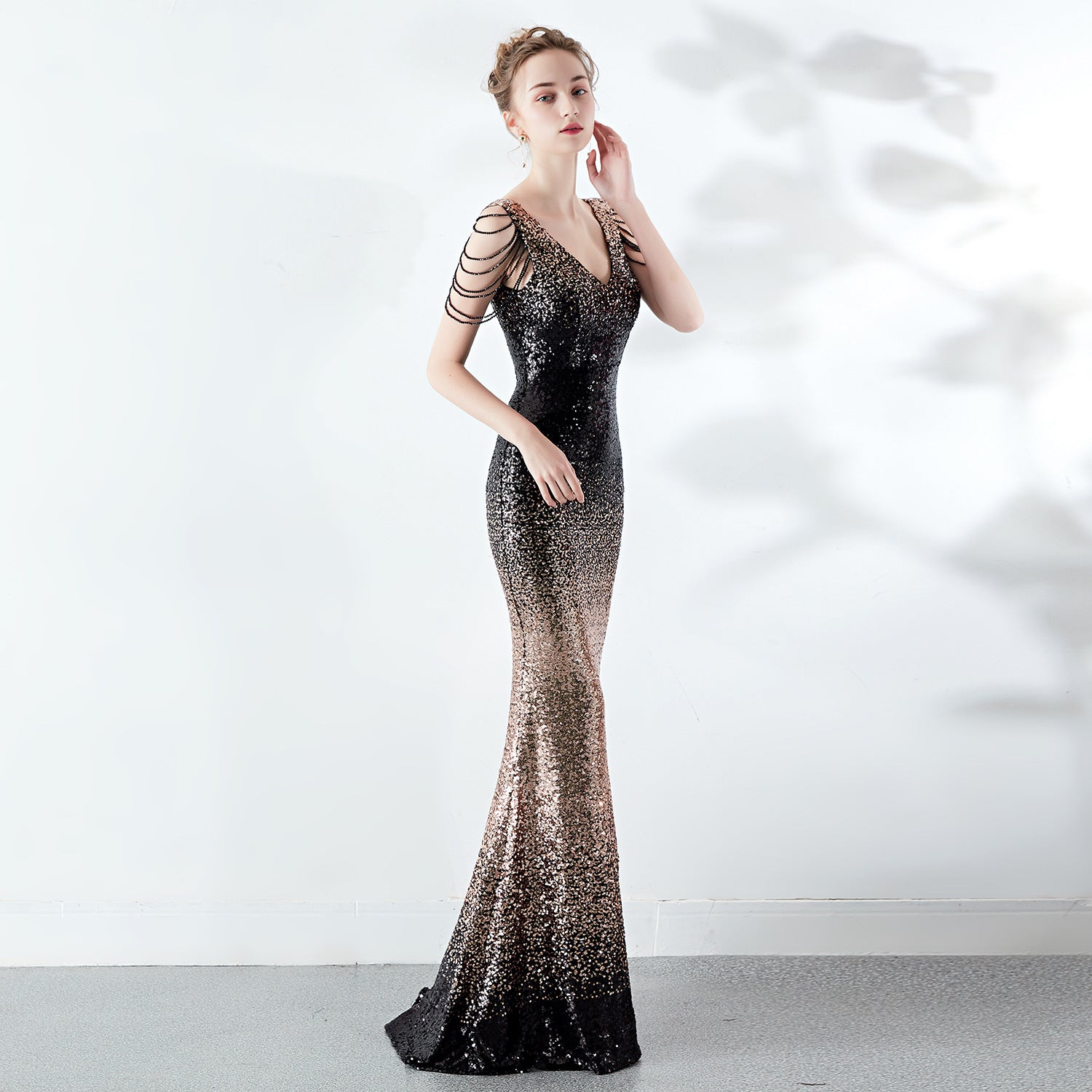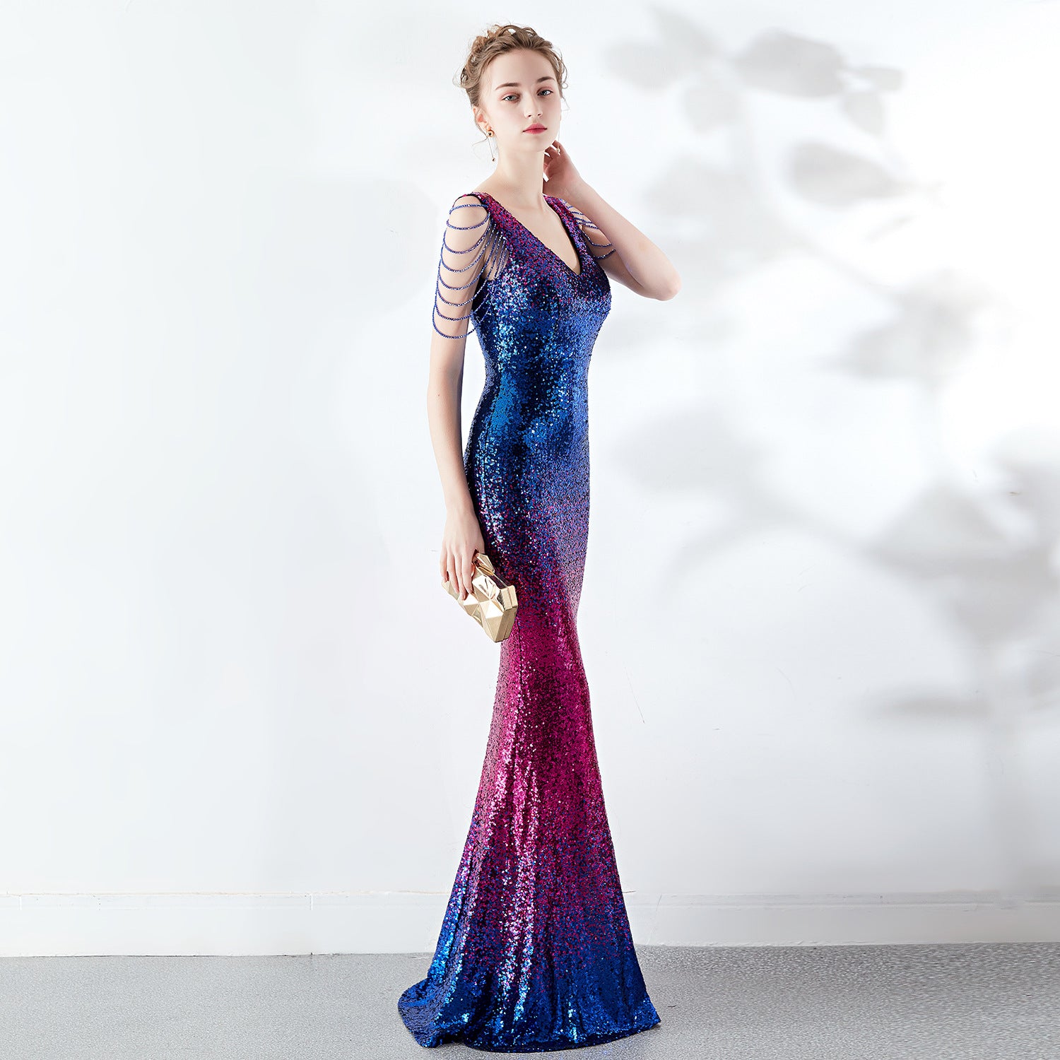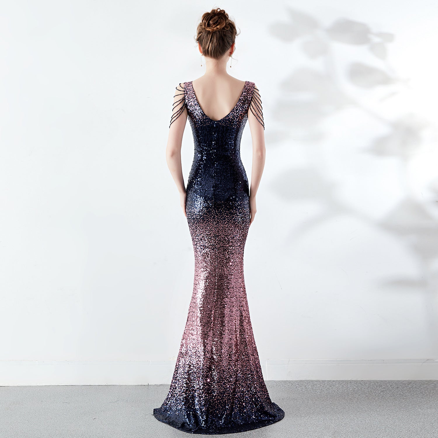 A slender evening dress with a clean, modern line. A rhinestone chain embellishment sits at the neckline, with an ombre fade along the length.