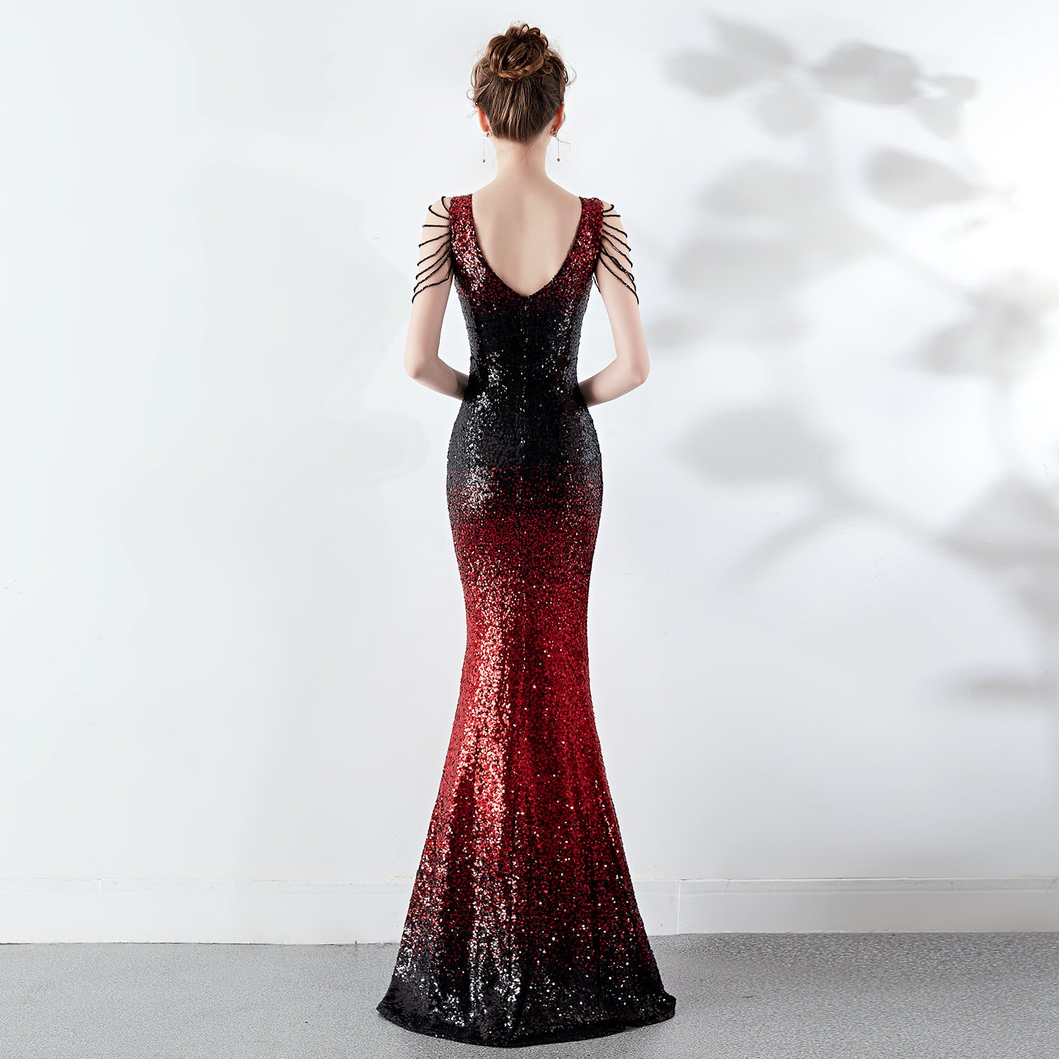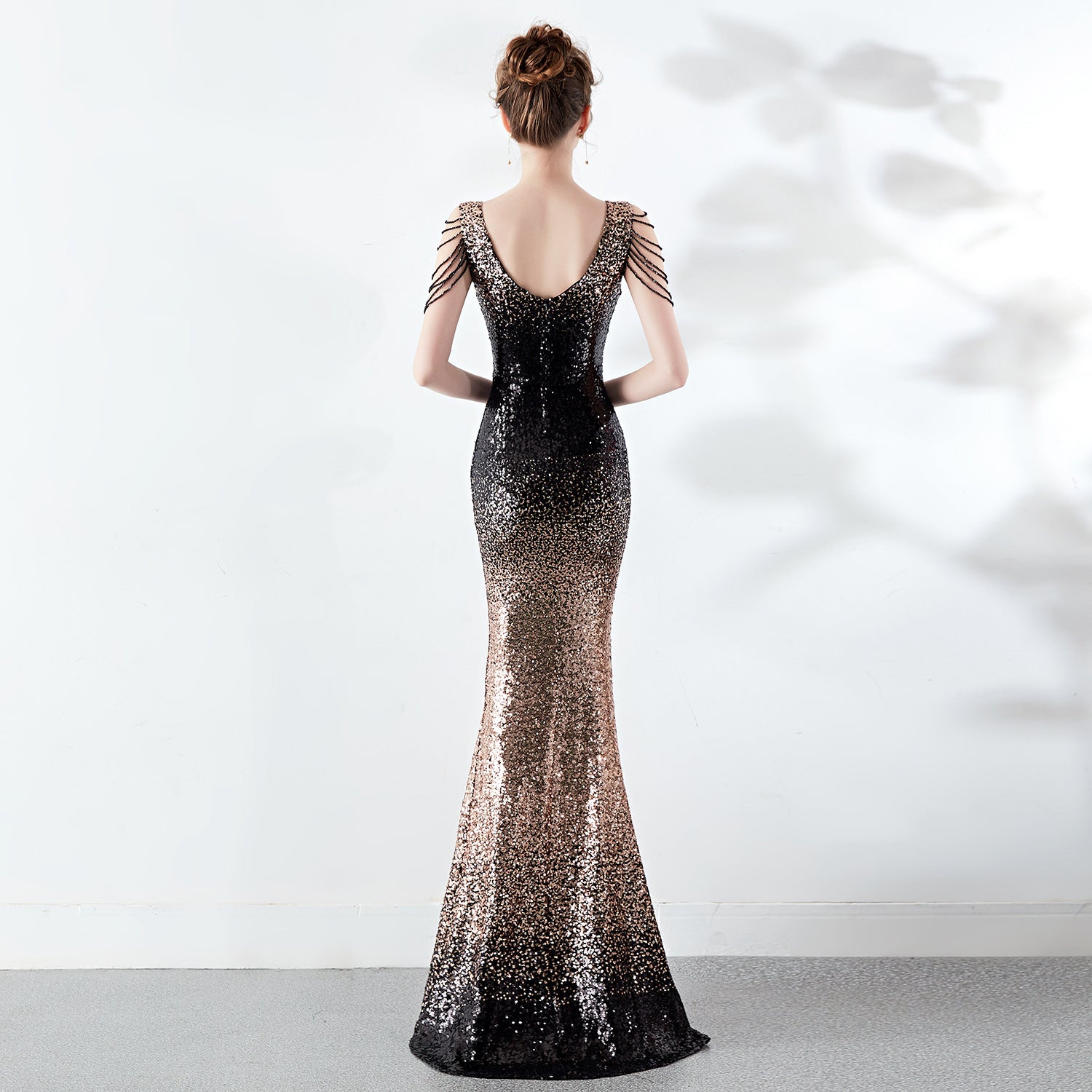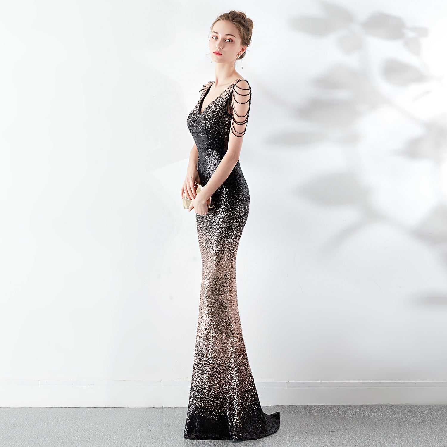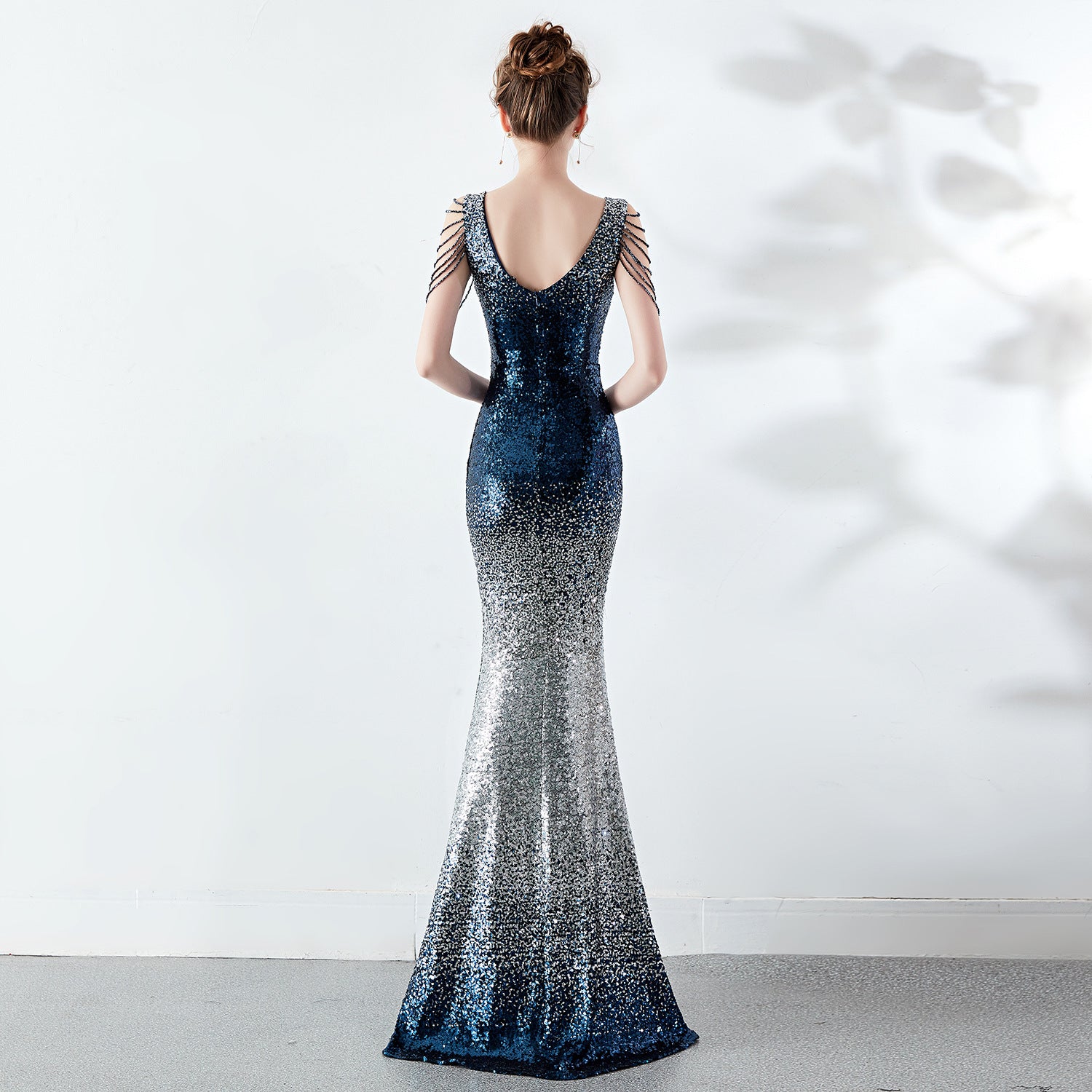 A slender evening dress with a clean, modern line. A rhinestone chain embellishment sits at the neckline, with an ombre fade along the length.