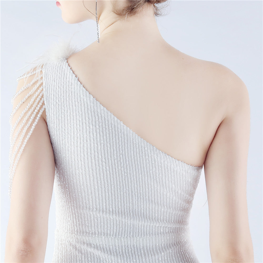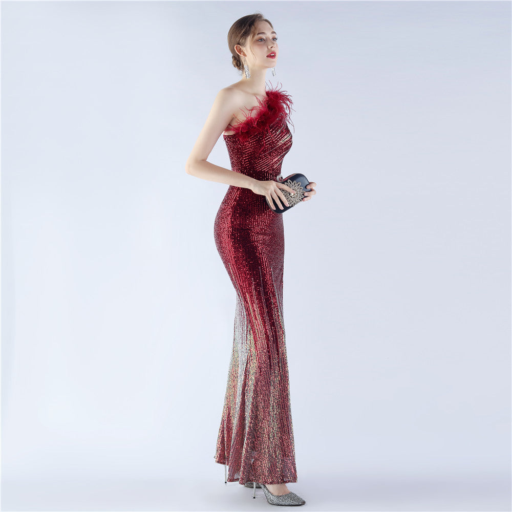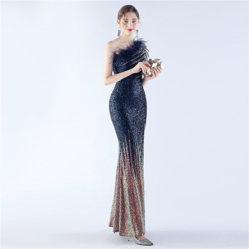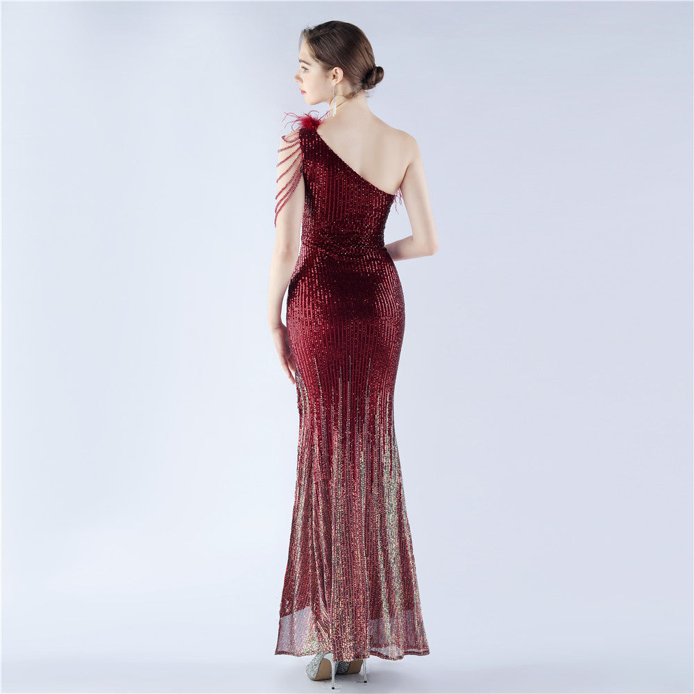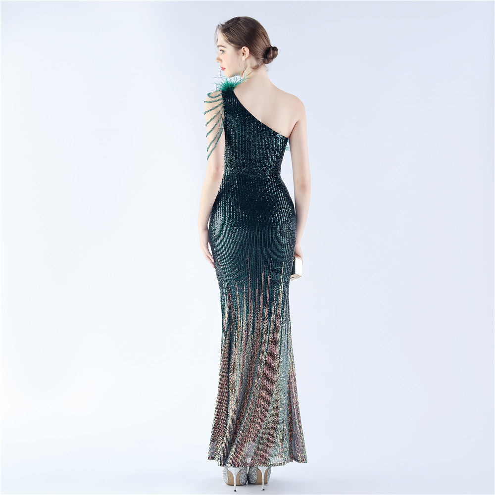 A one-shoulder maxi dress with a sculpted fishtail silhouette. Ombre sequin embellishment pairs with feather accents and a hidden zipper.