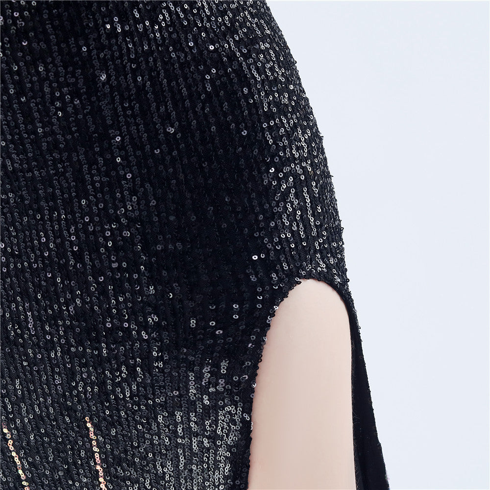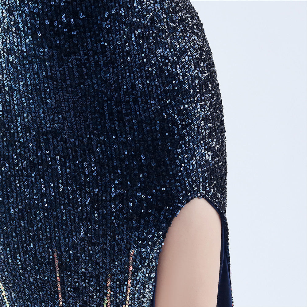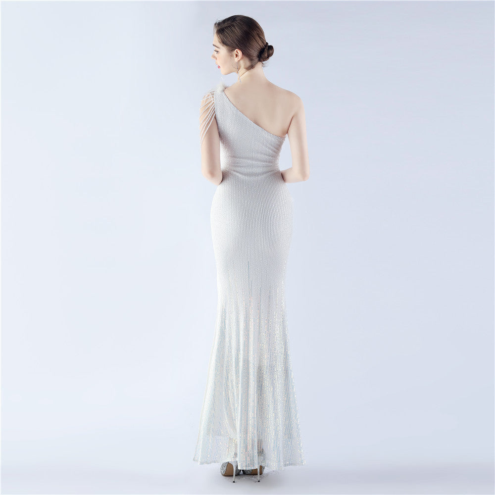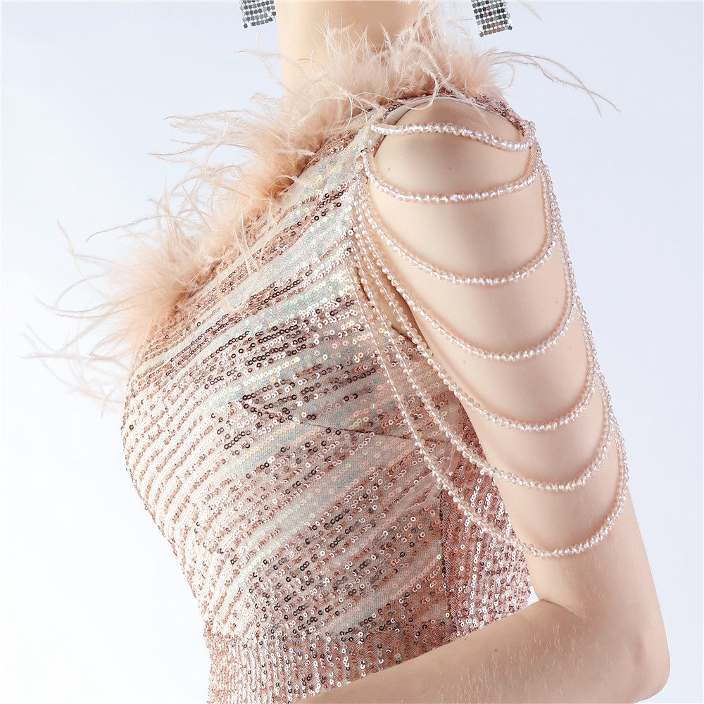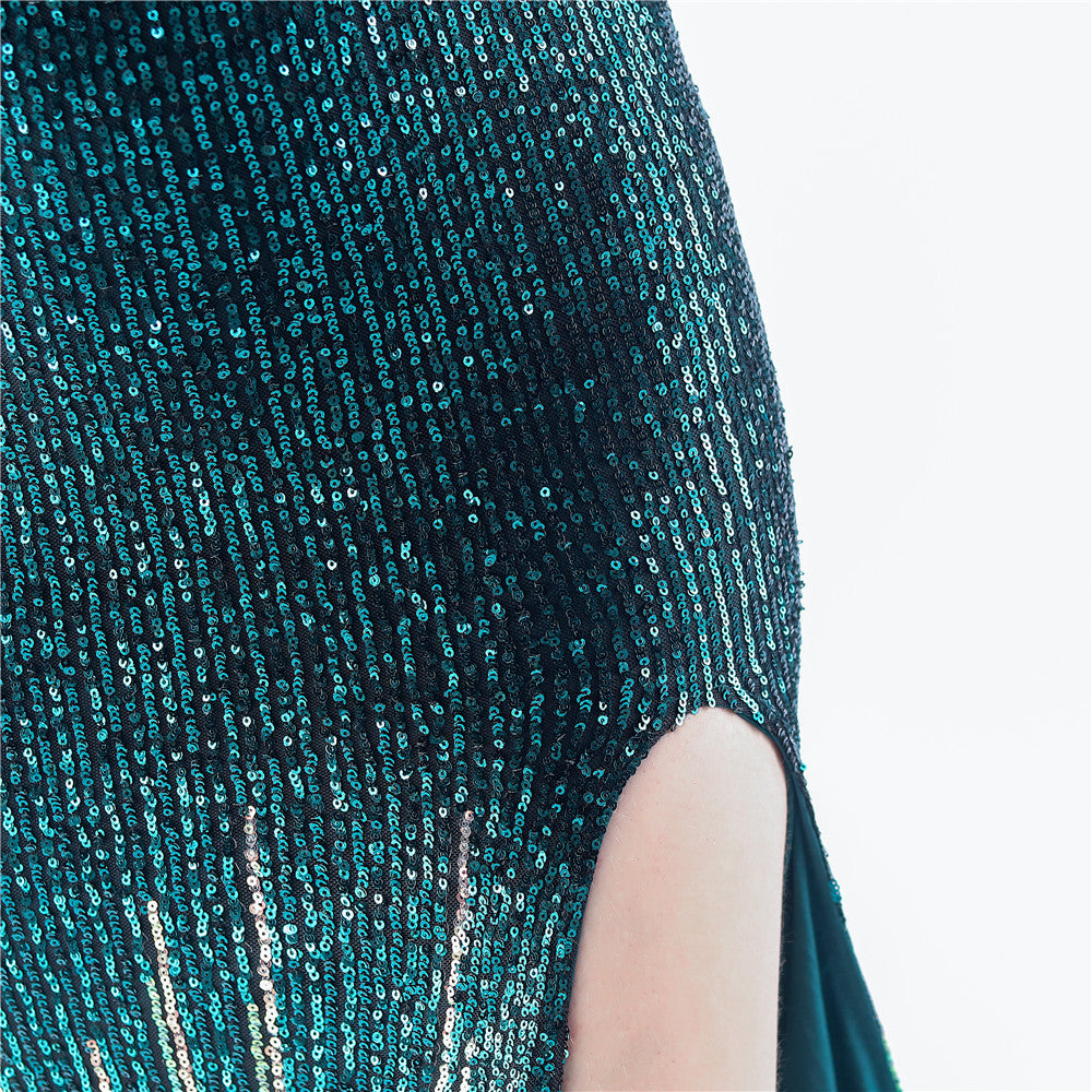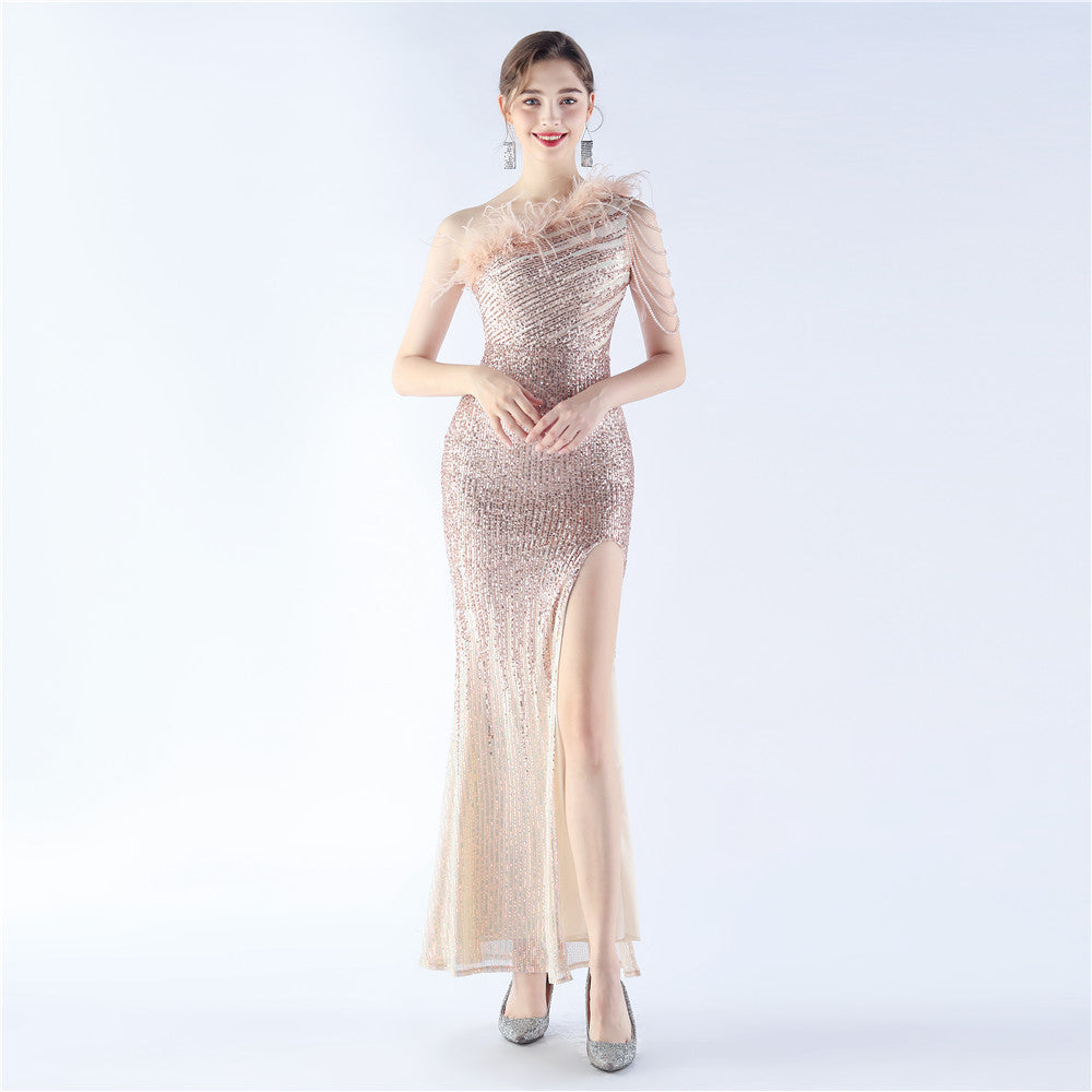 A one-shoulder maxi dress with a sculpted fishtail silhouette. Ombre sequin embellishment pairs with feather accents and a hidden zipper.
