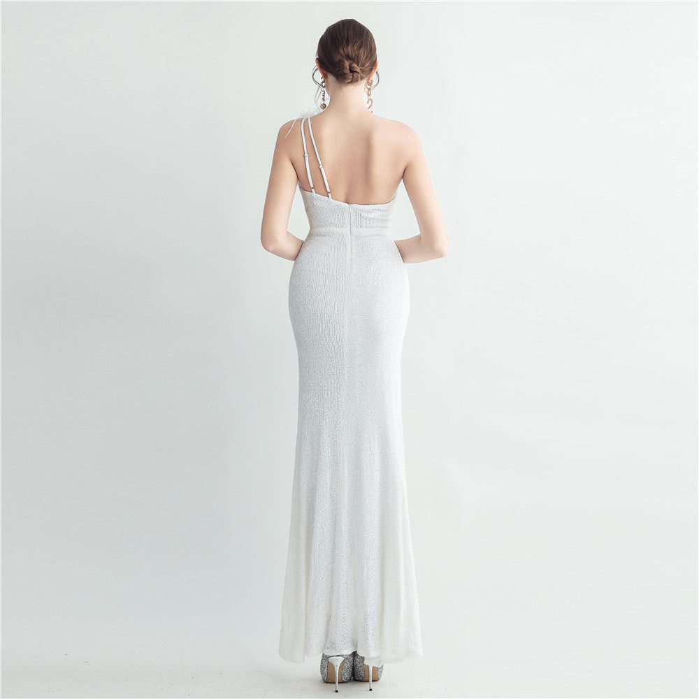 The dress presents a slim, form-skimming maxi silhouette. A one-shoulder neckline with sequin and feather embellishment creates an asymmetric, elegant finish.