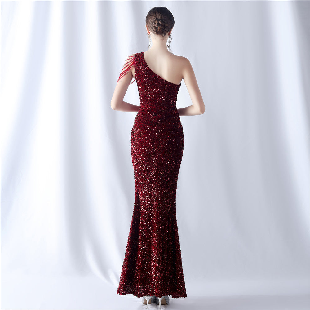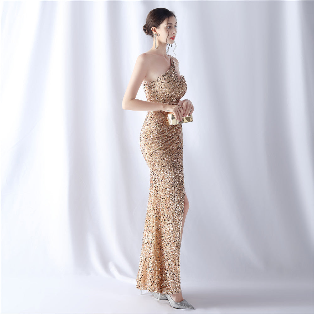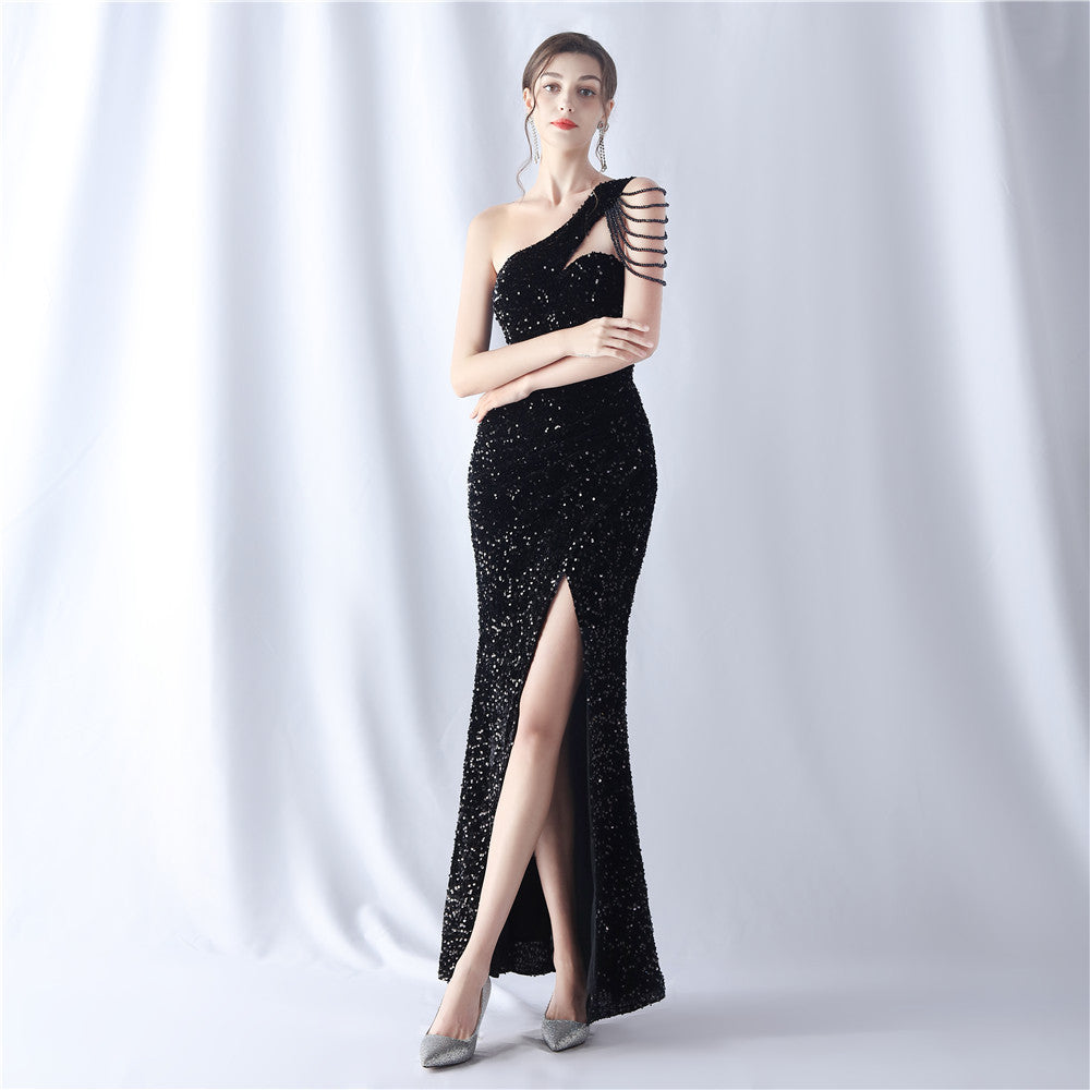 A one-shoulder maxi with a slim silhouette. Beading and sequins emphasize the neckline, with a front split finishing the line.