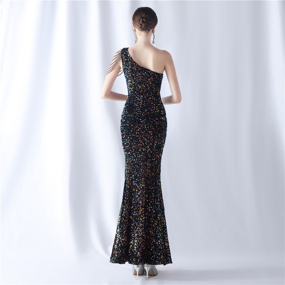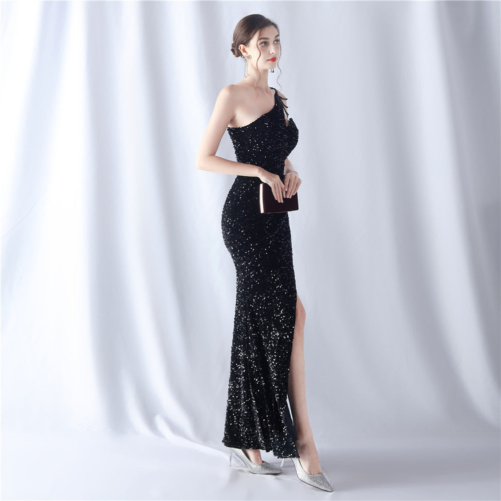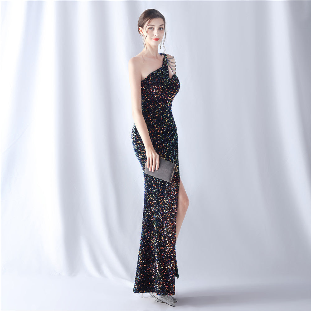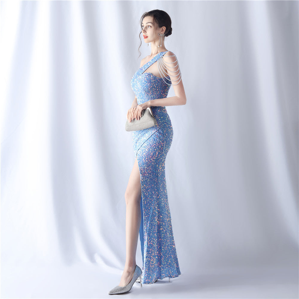 A one-shoulder maxi with a slim silhouette. Beading and sequins emphasize the neckline, with a front split finishing the line.