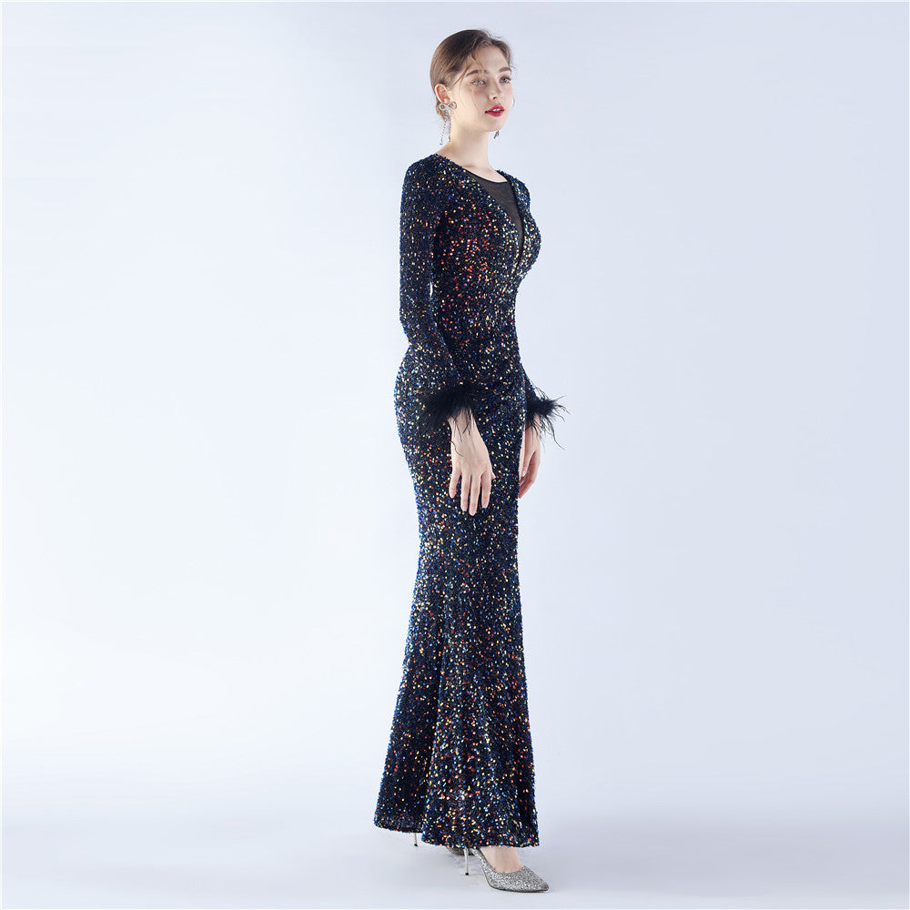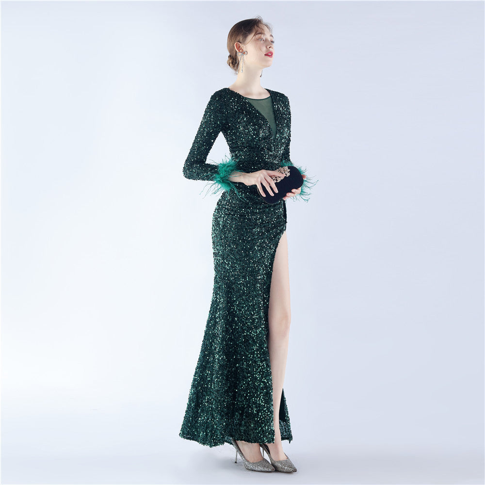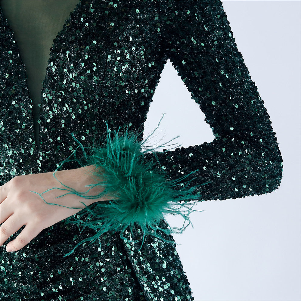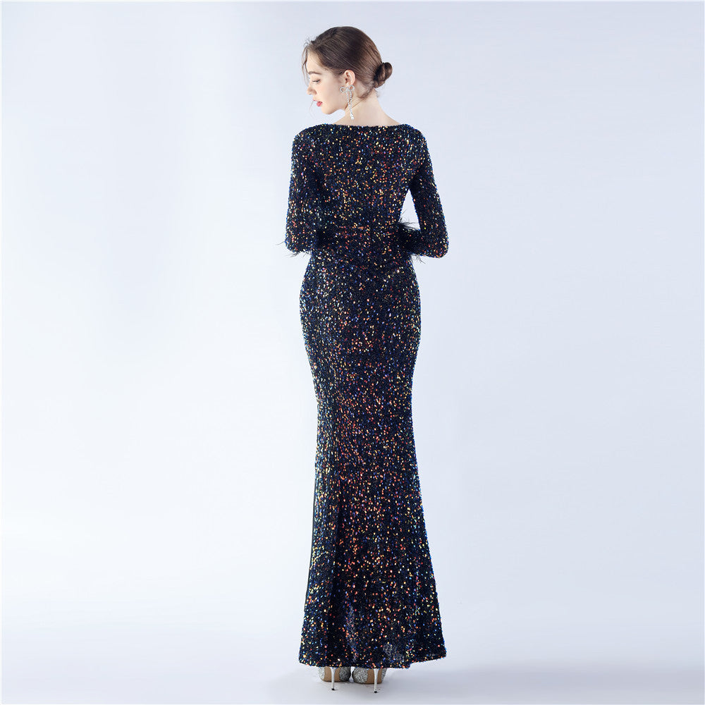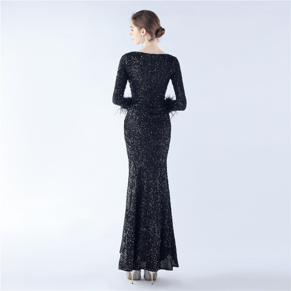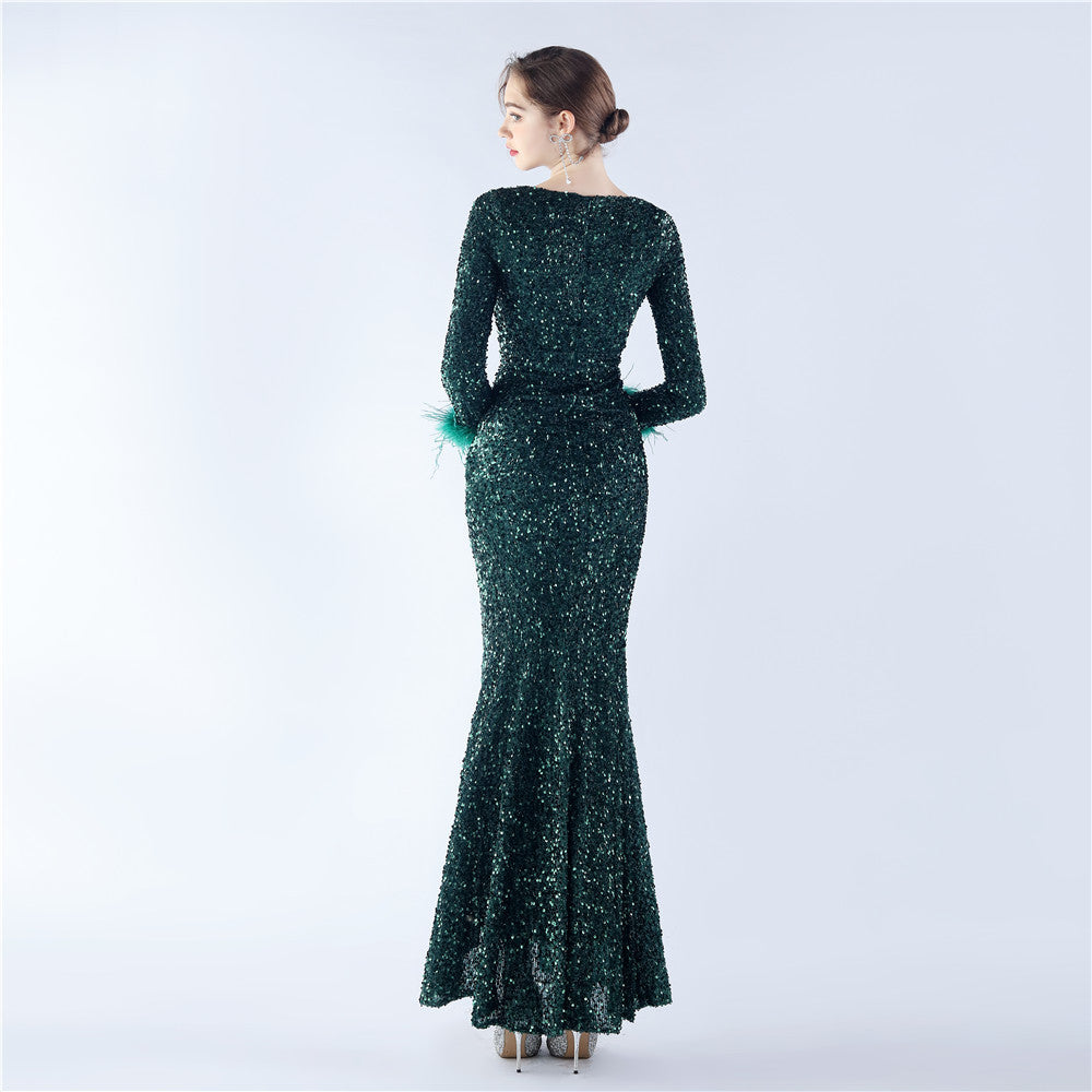 This maxi dress offers a slim, body-skimming silhouette. A V-neckline with feather detailing and sequin accents pairs with a hidden back zipper.