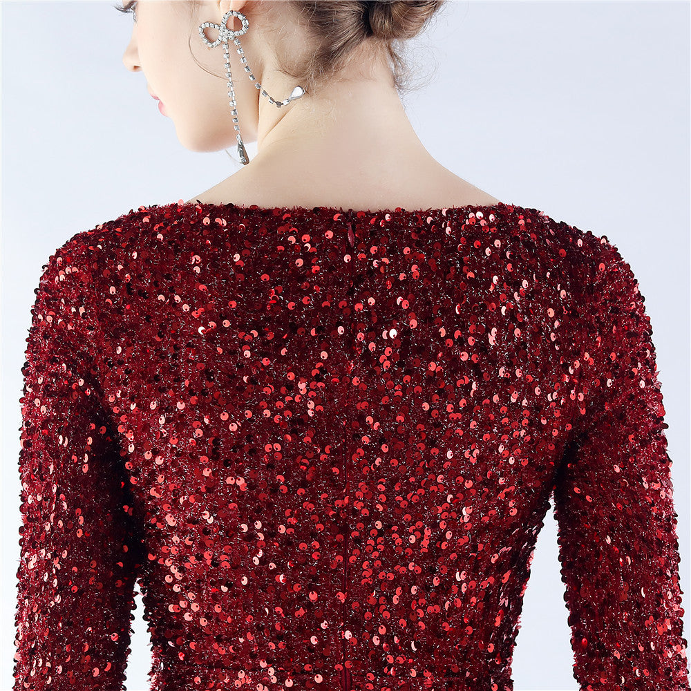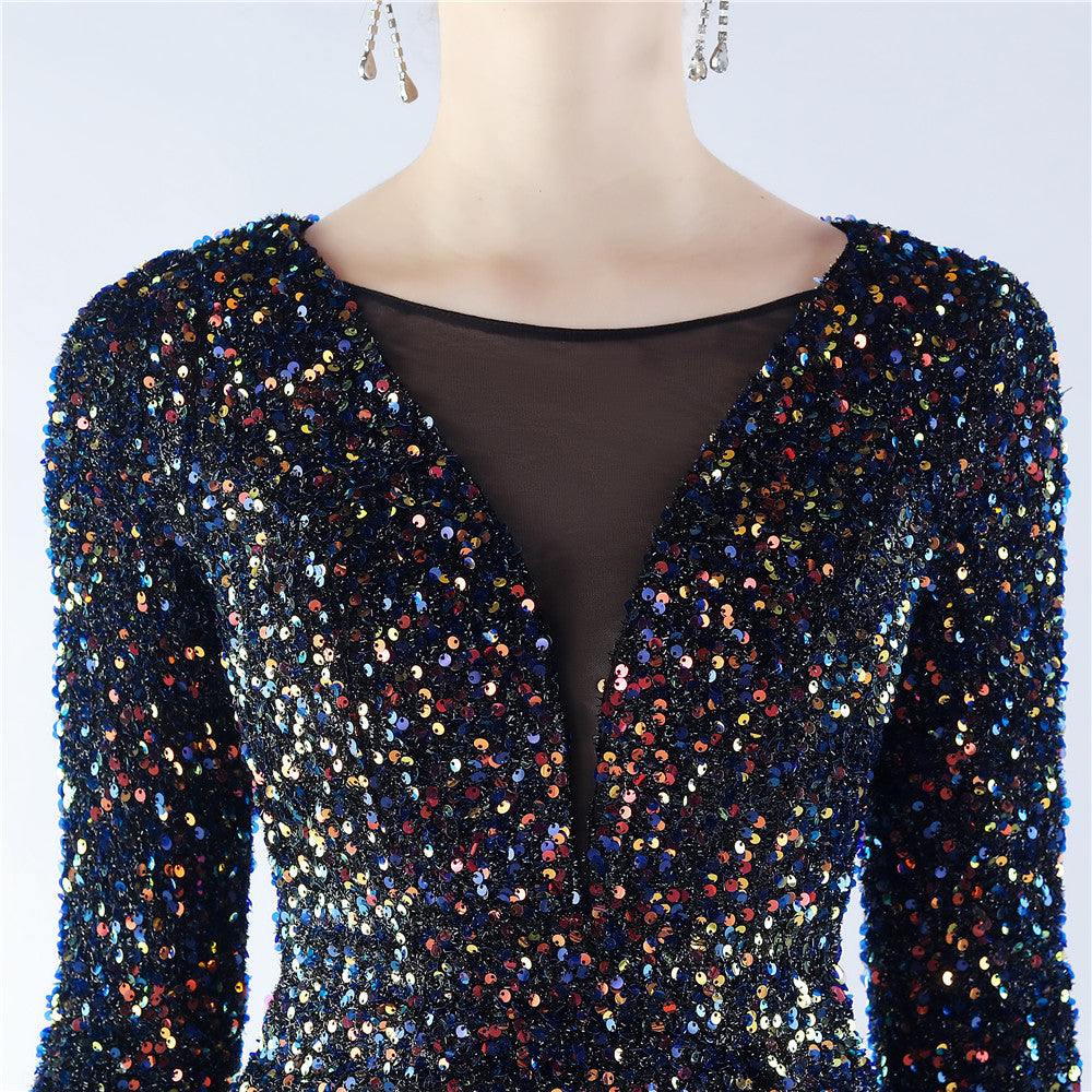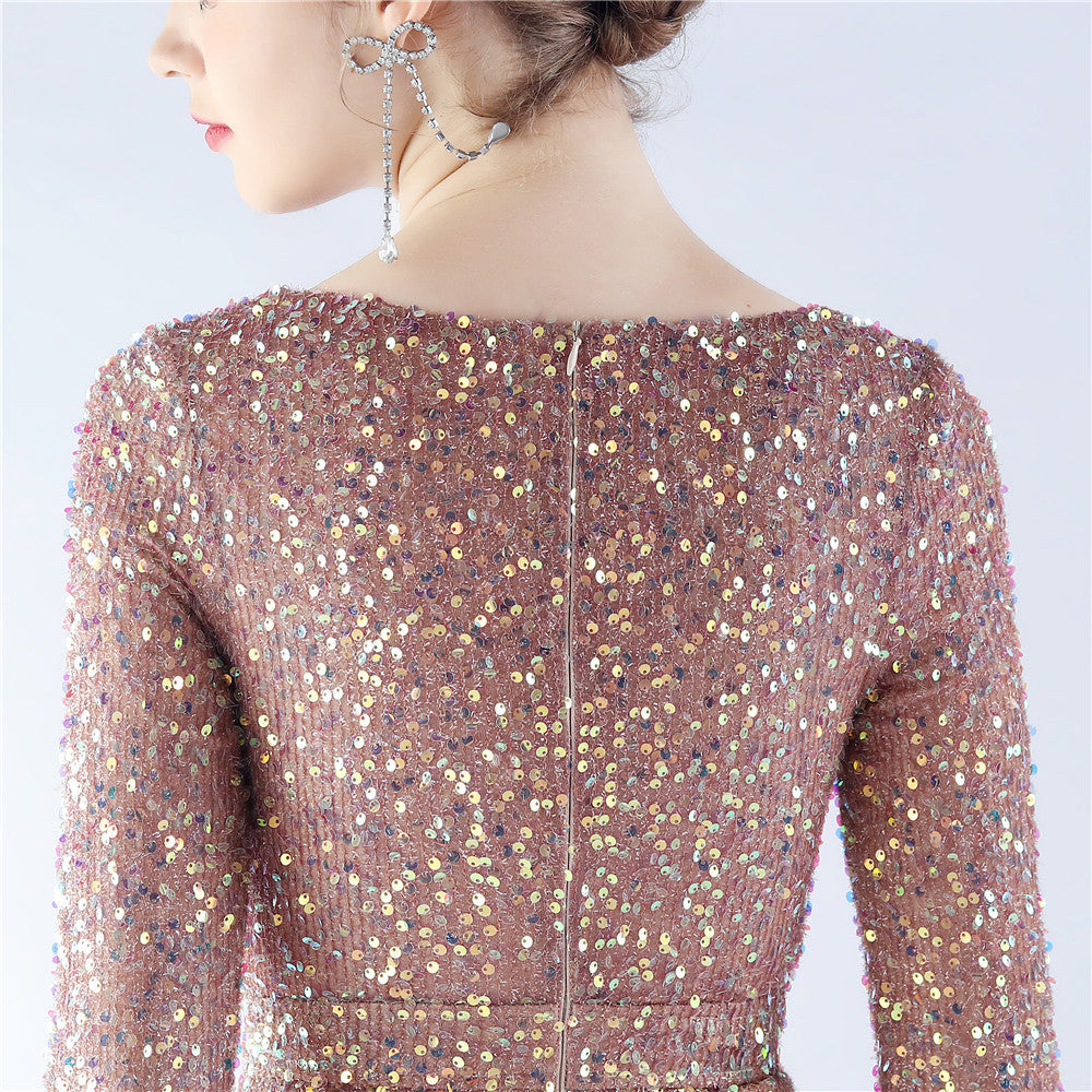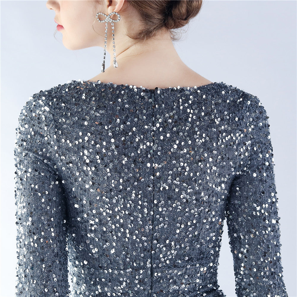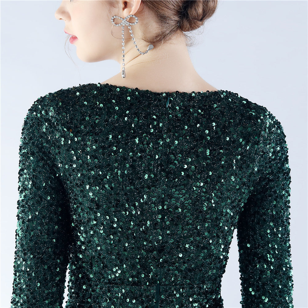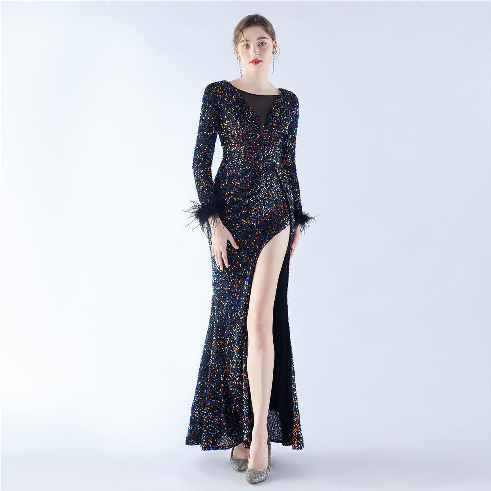 This maxi dress offers a slim, body-skimming silhouette. A V-neckline with feather detailing and sequin accents pairs with a hidden back zipper.