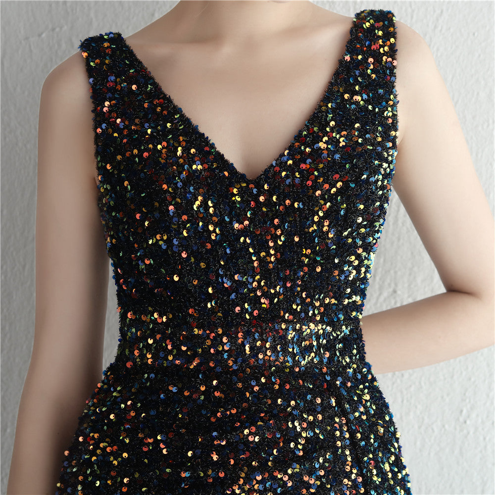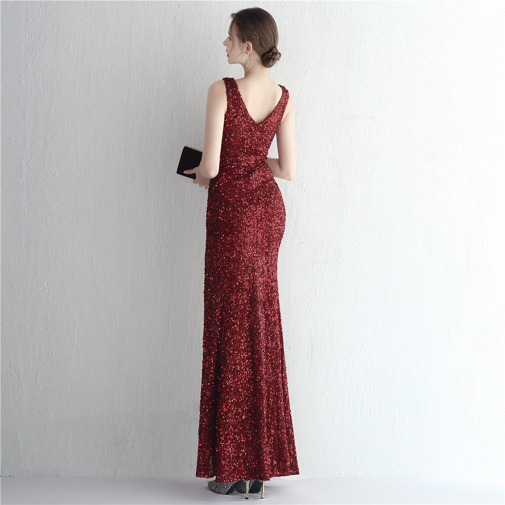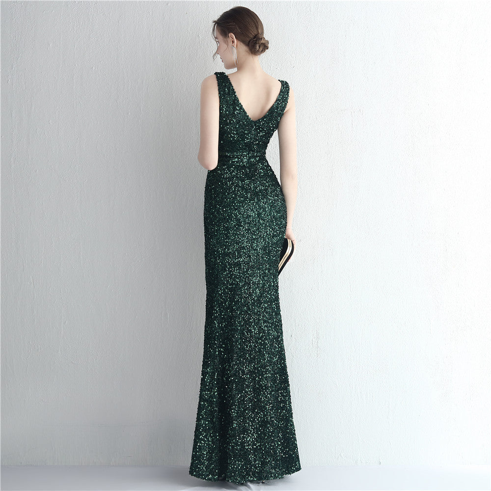 The dress presents a slim, elongated silhouette with a fishtail hem. A V-neckline and allover sequins frame the form with restrained shine.
