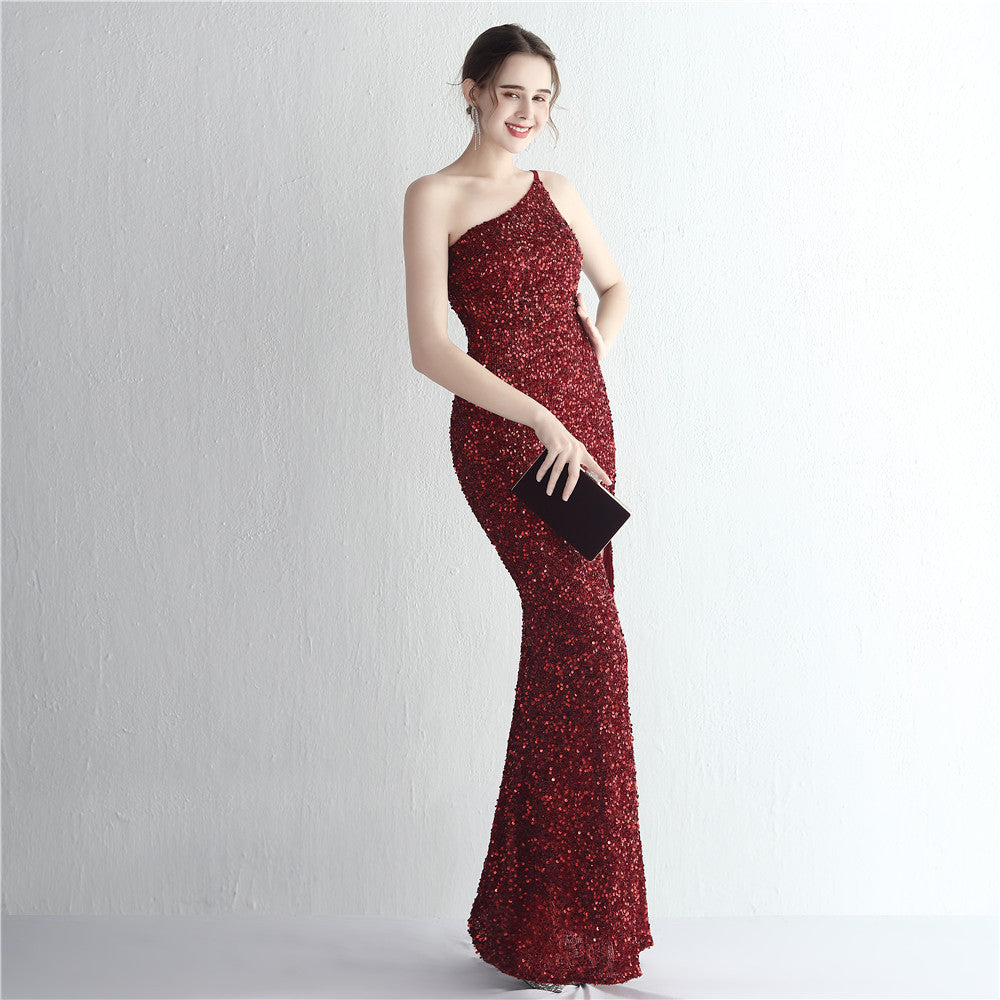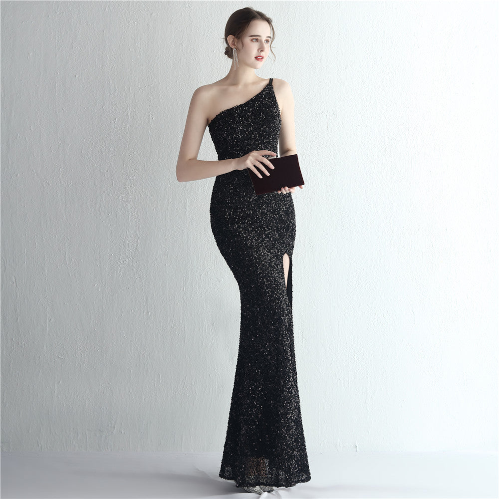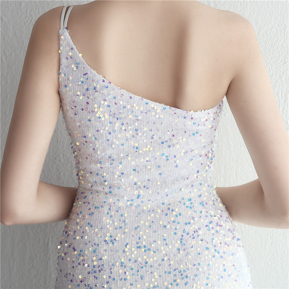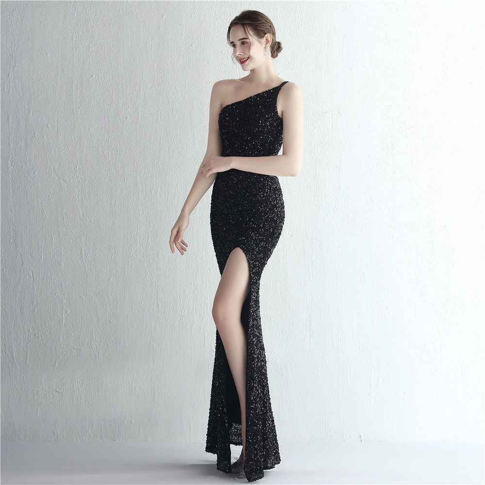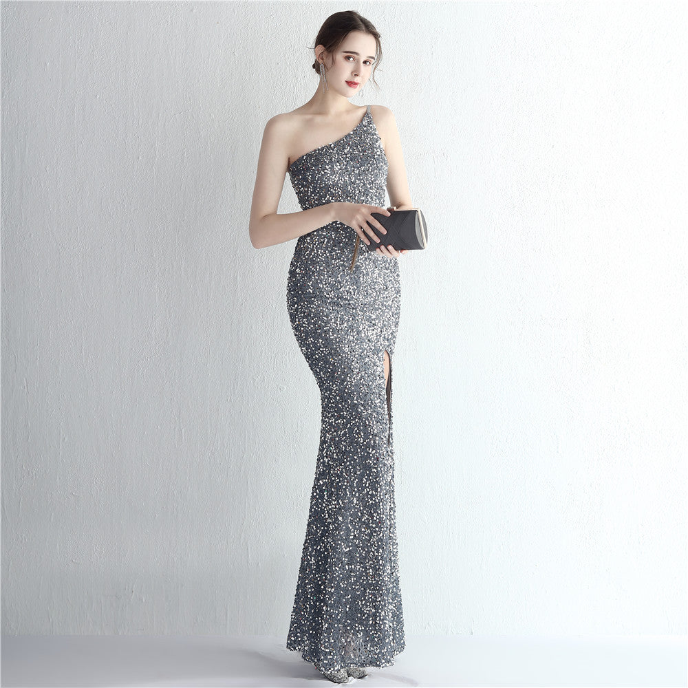 The dress falls to a long, form-skimming maxi with a fishtail hem. An asymmetric one-shoulder neckline pairs with sequins, a high split and a concealed zipper.