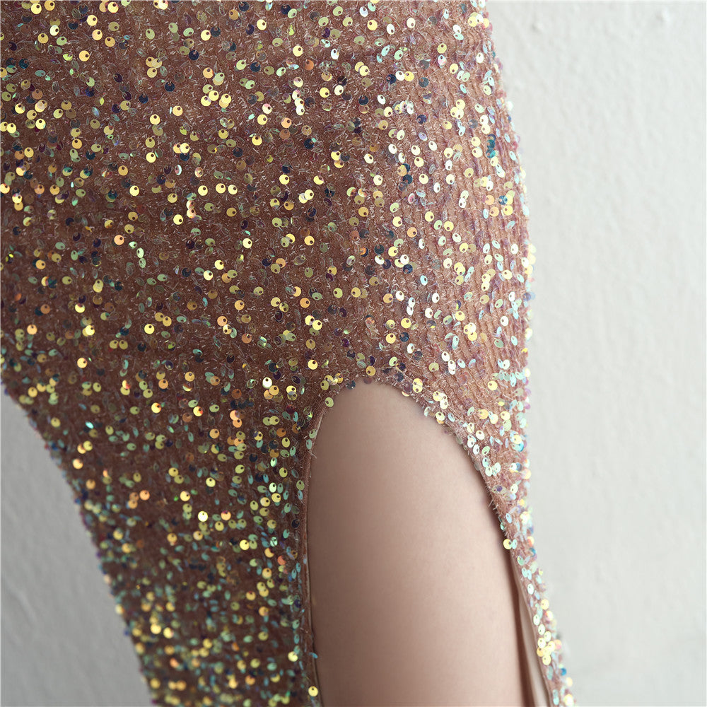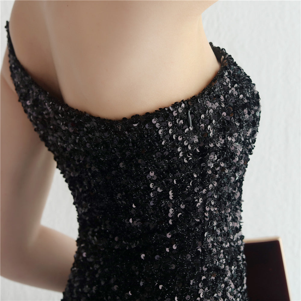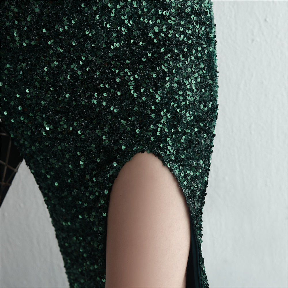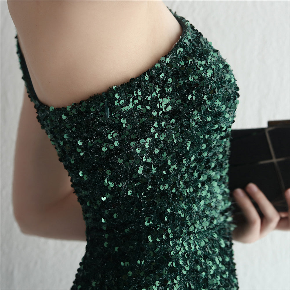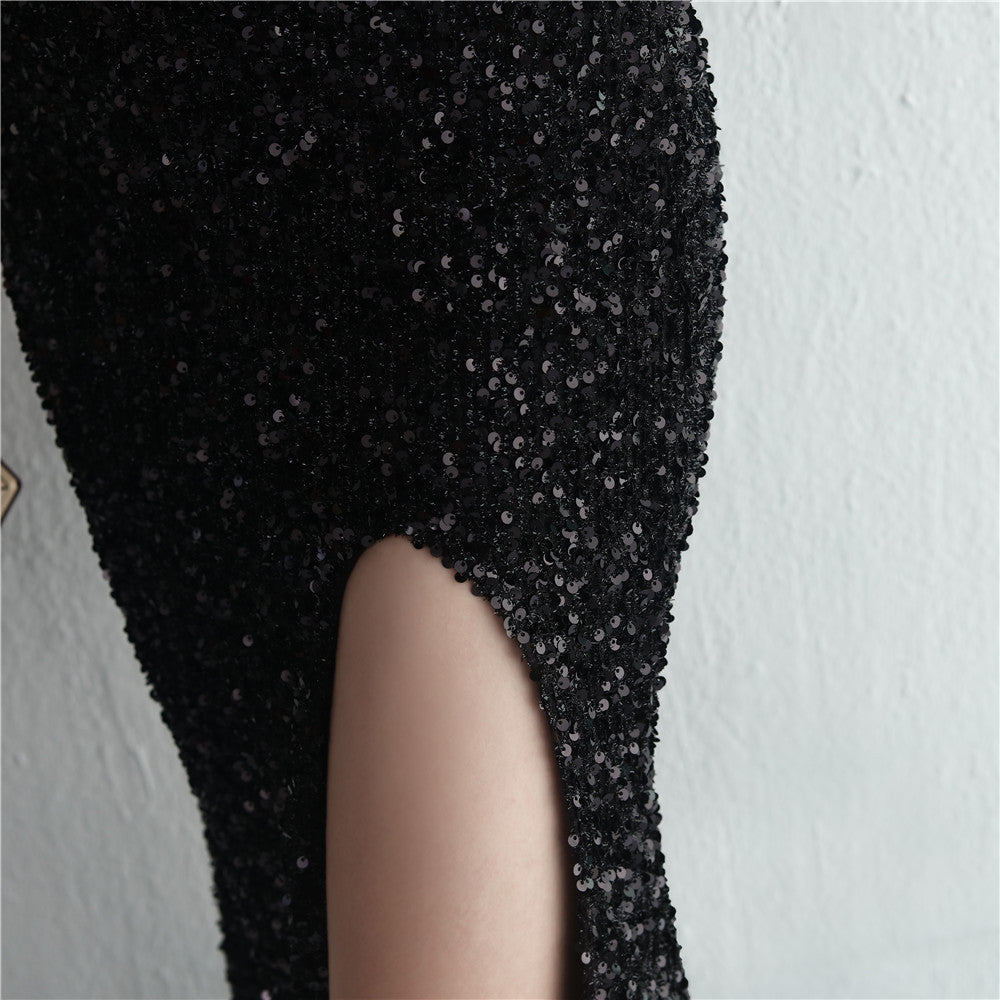 The dress falls to a long, form-skimming maxi with a fishtail hem. An asymmetric one-shoulder neckline pairs with sequins, a high split and a concealed zipper.