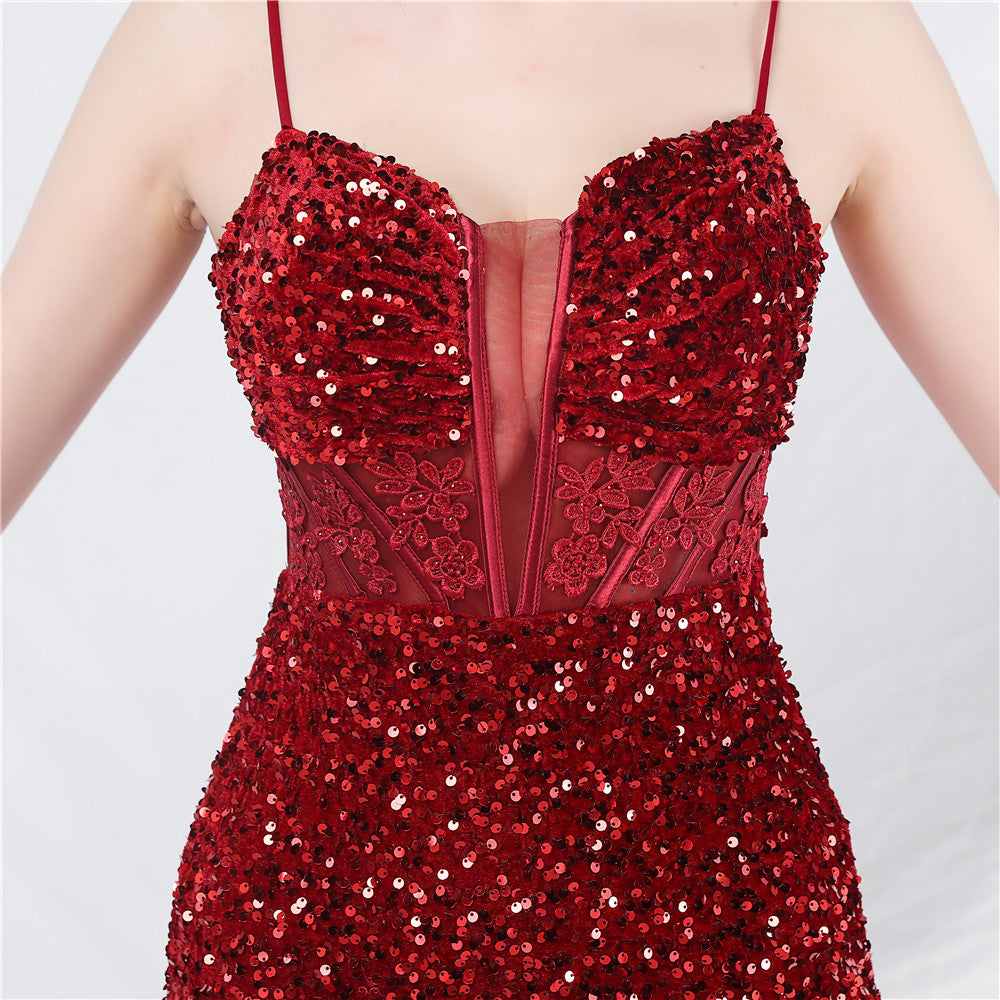 A sleek, V-neck maxi dress with a slim silhouette that skims the figure. Lace-up detailing at the bodice and sequin embellishments add quiet shine.