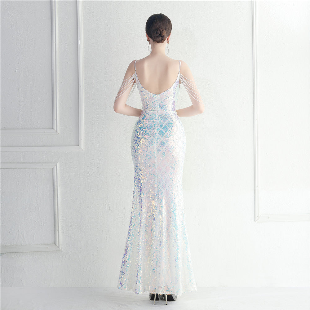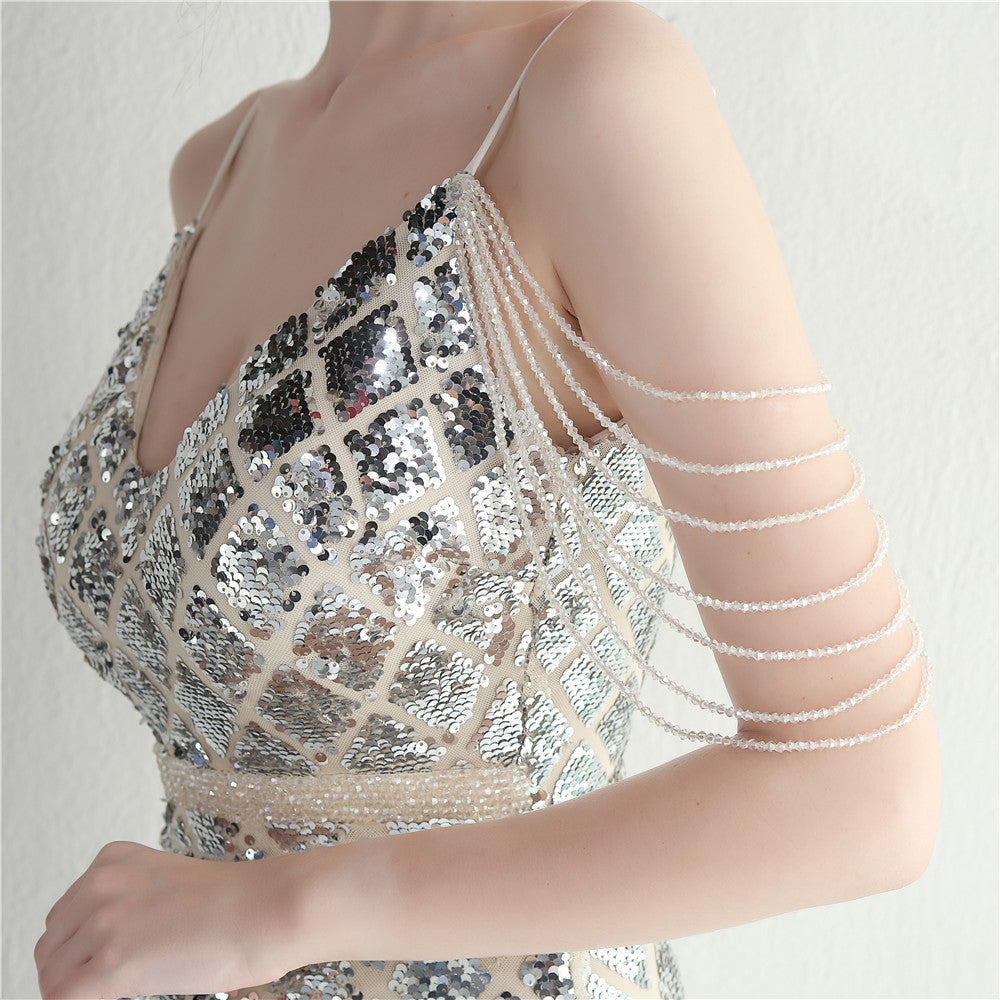 An elegant maxi with a slim silhouette. The V-neckline frames the sequins and a front split adds movement.