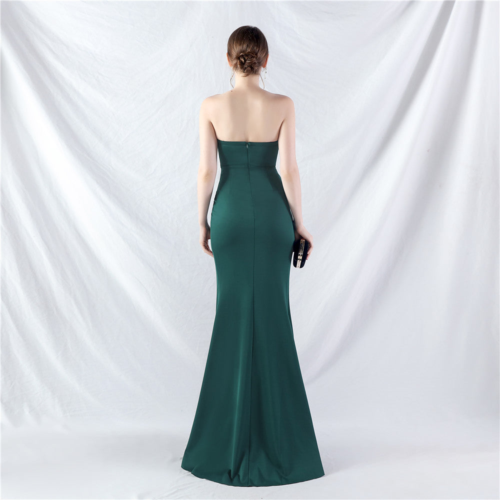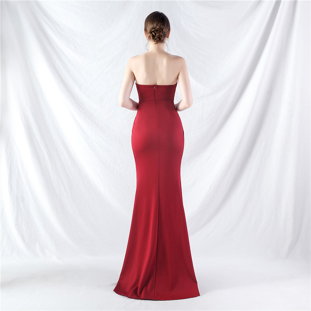 The dress presents a slim, maxi silhouette. The sweetheart neckline frames the bodice, with boning and ruching, a front split and a concealed zipper.