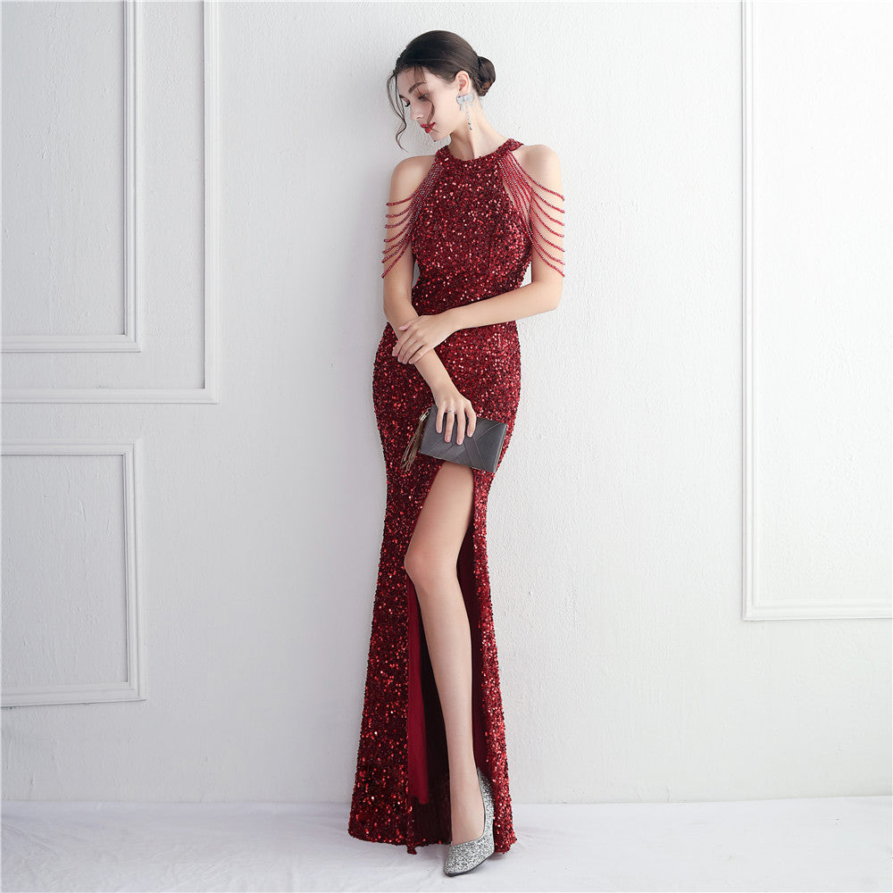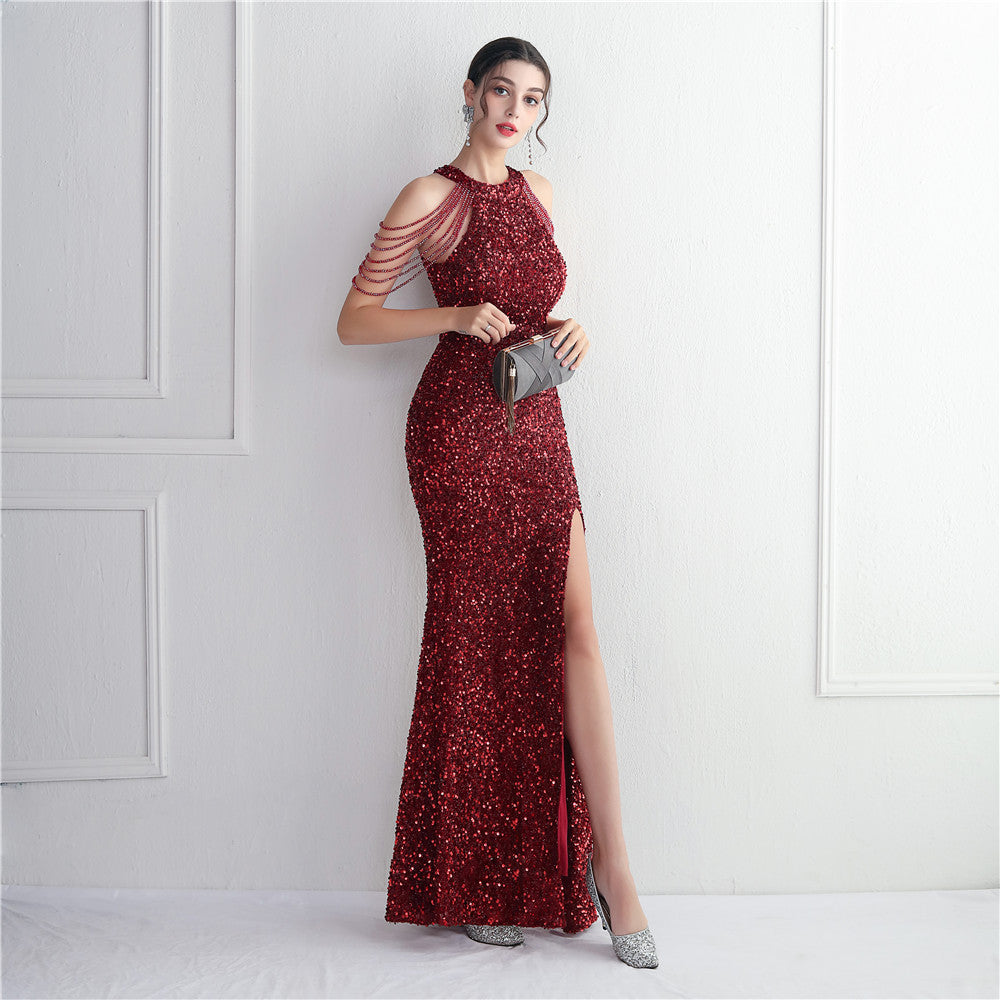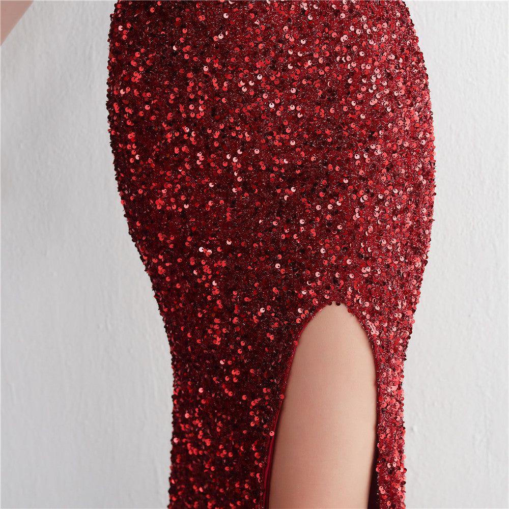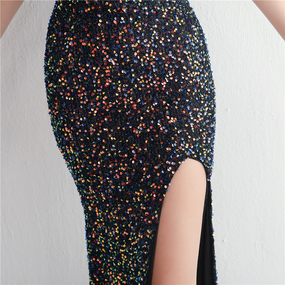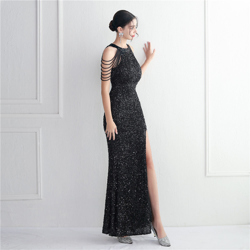 A slim, maxi silhouette with a crew neck. Sequins highlight the surface, and a front split is finished with a discreet zipper.