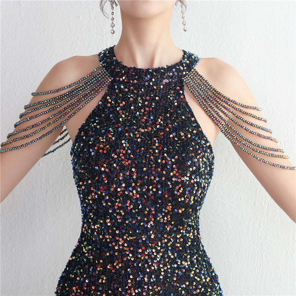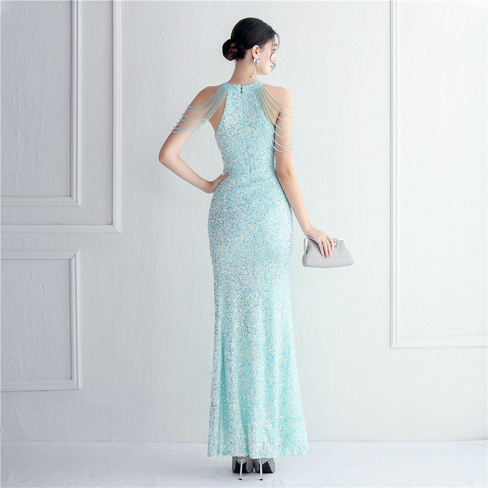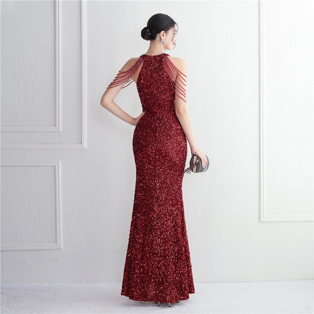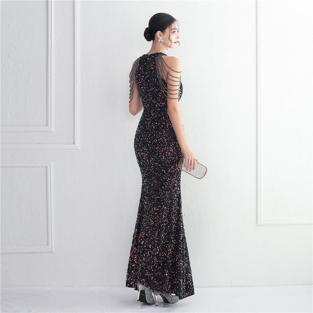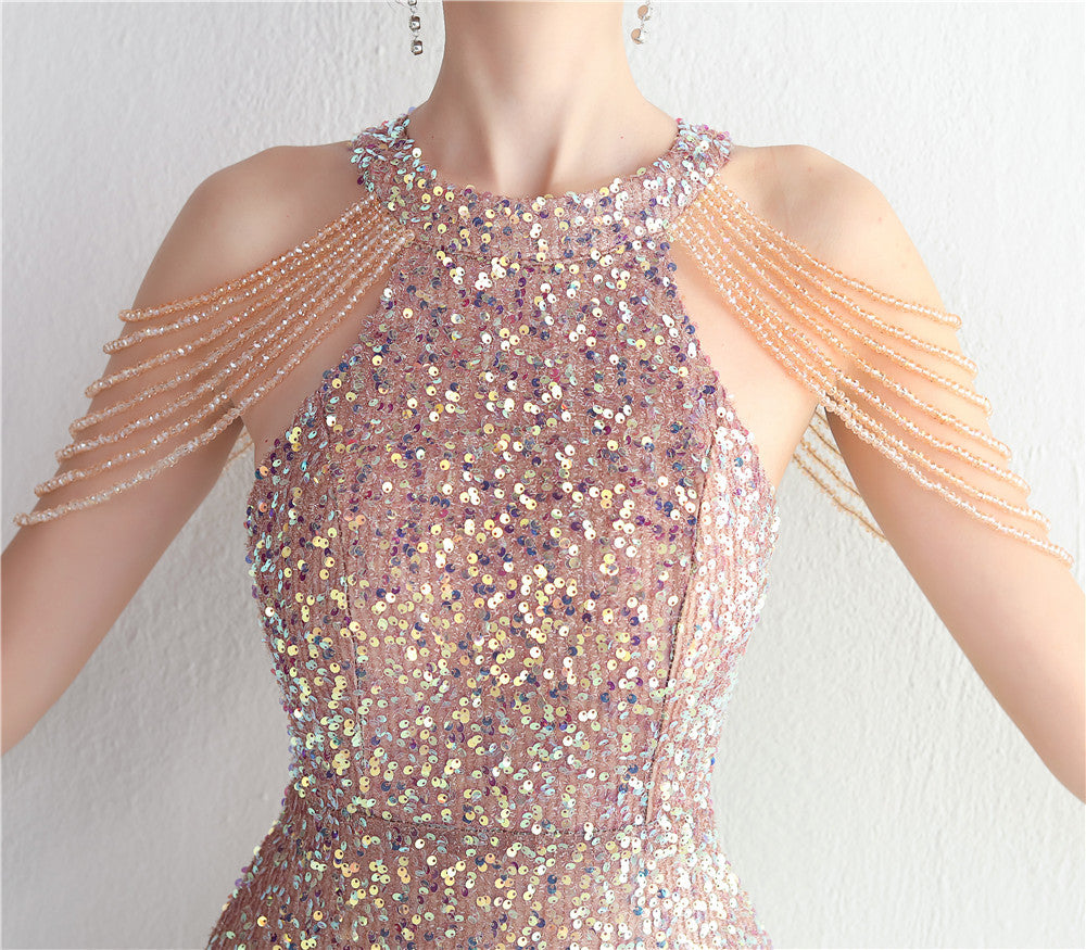 A slim, maxi silhouette with a crew neck. Sequins highlight the surface, and a front split is finished with a discreet zipper.