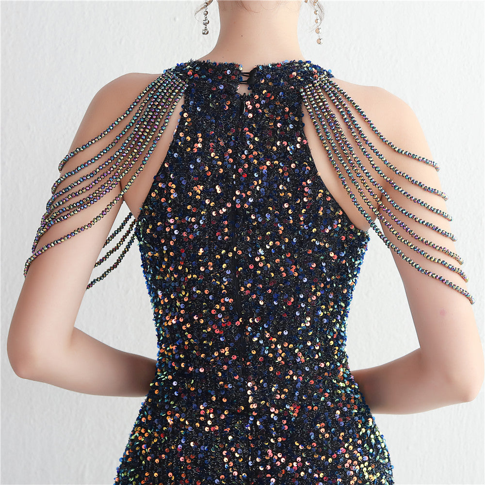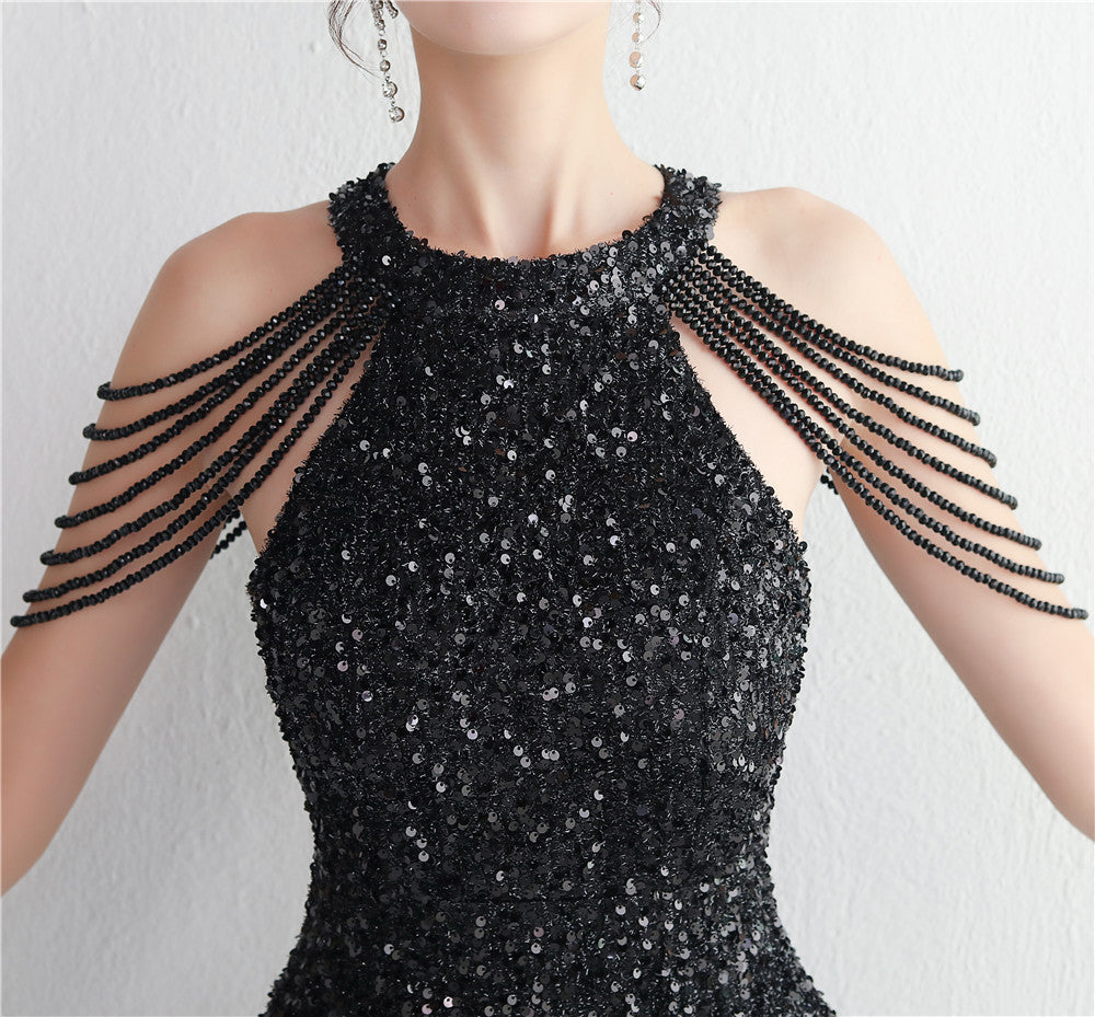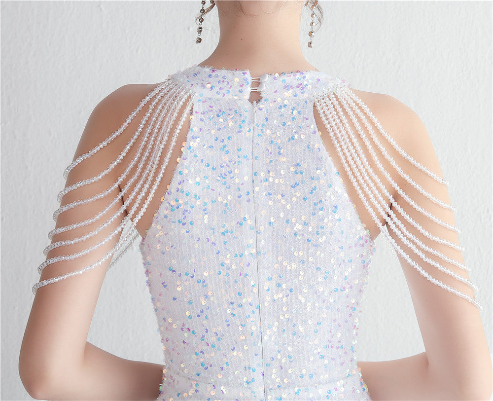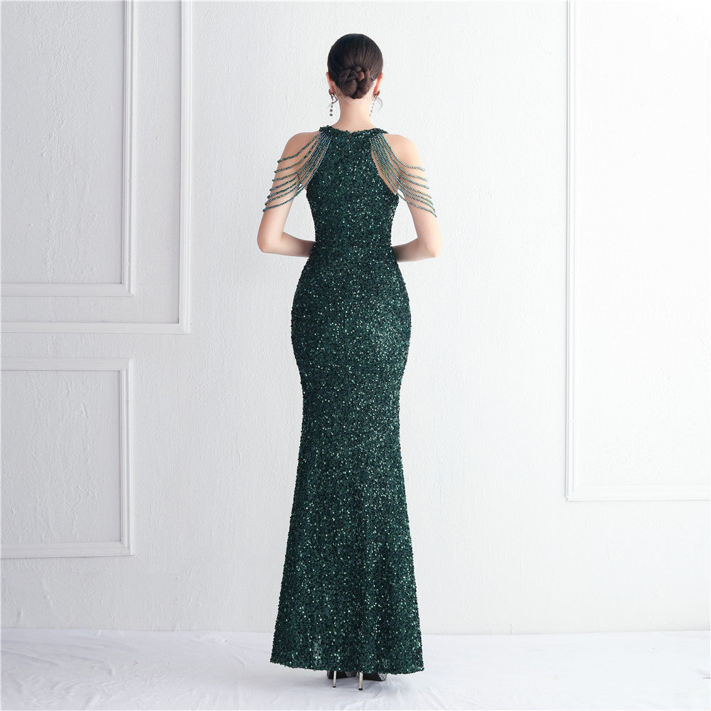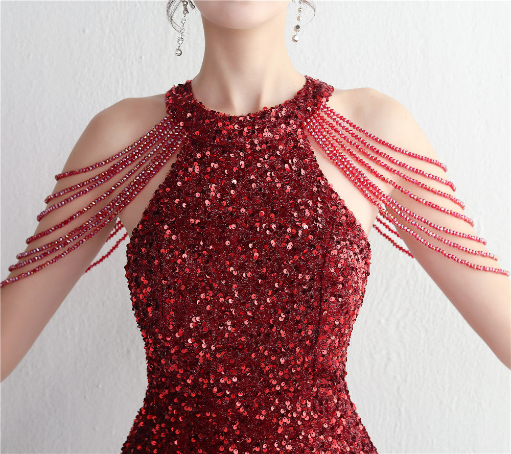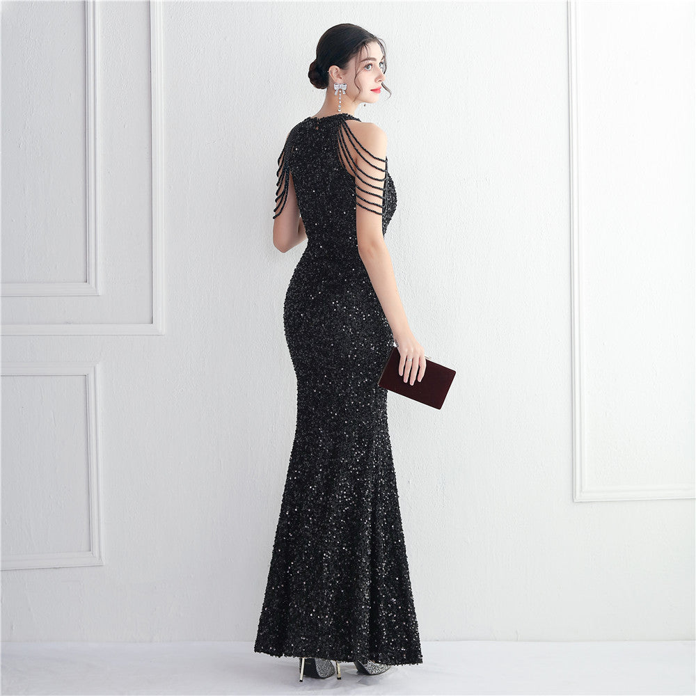 A slim, maxi silhouette with a crew neck. Sequins highlight the surface, and a front split is finished with a discreet zipper.