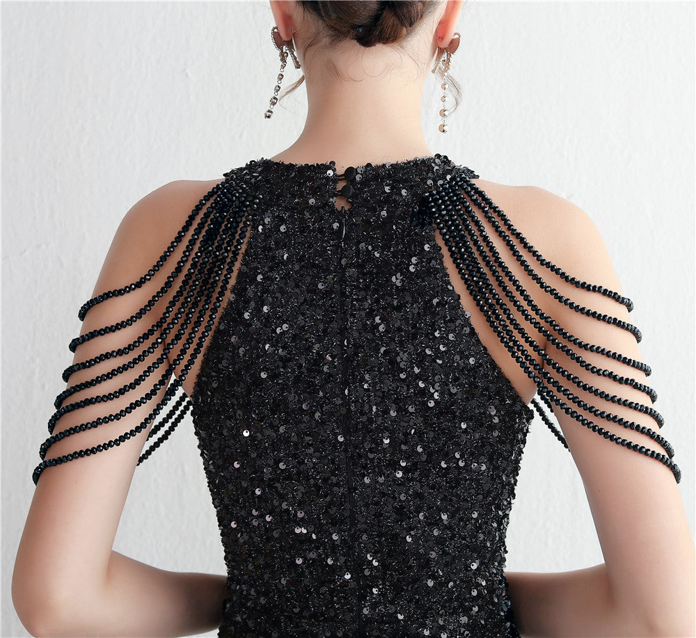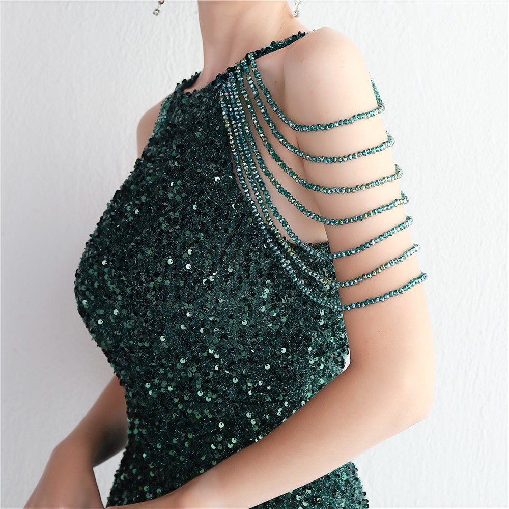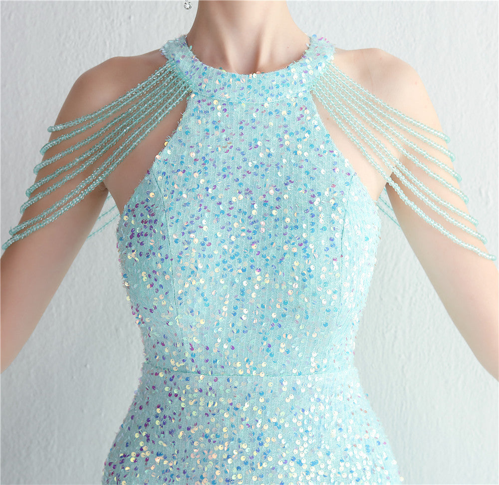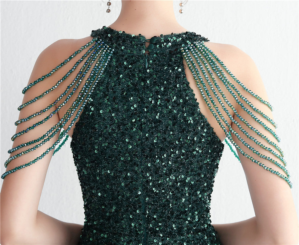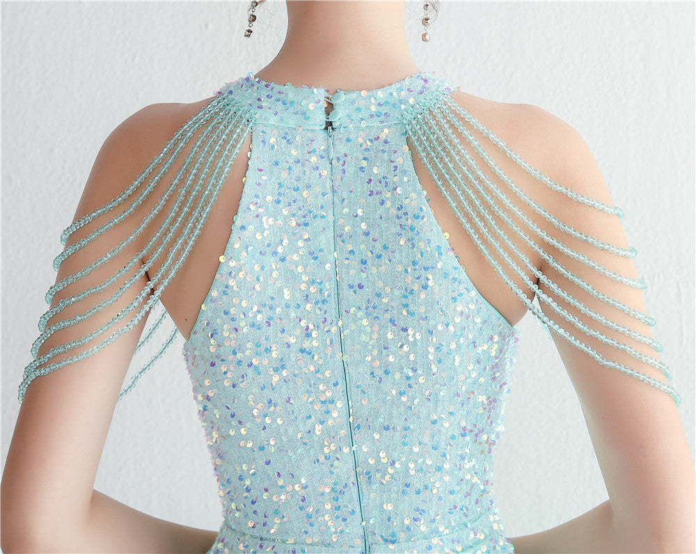A slim, maxi silhouette with a crew neck. Sequins highlight the surface, and a front split is finished with a discreet zipper.