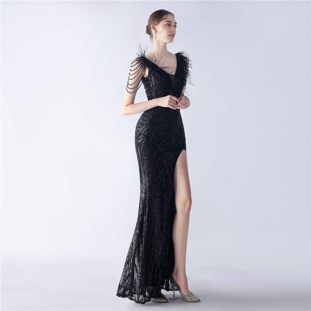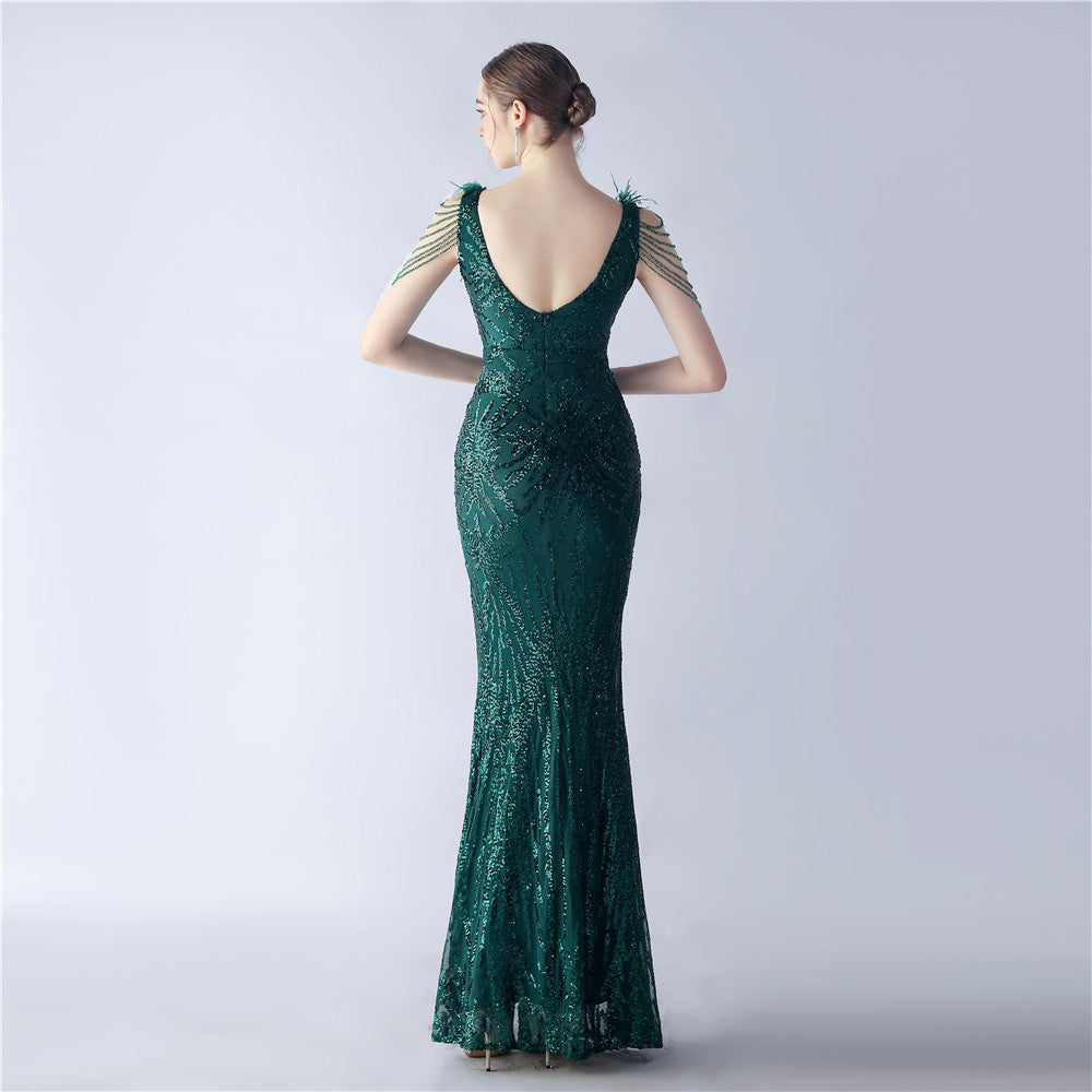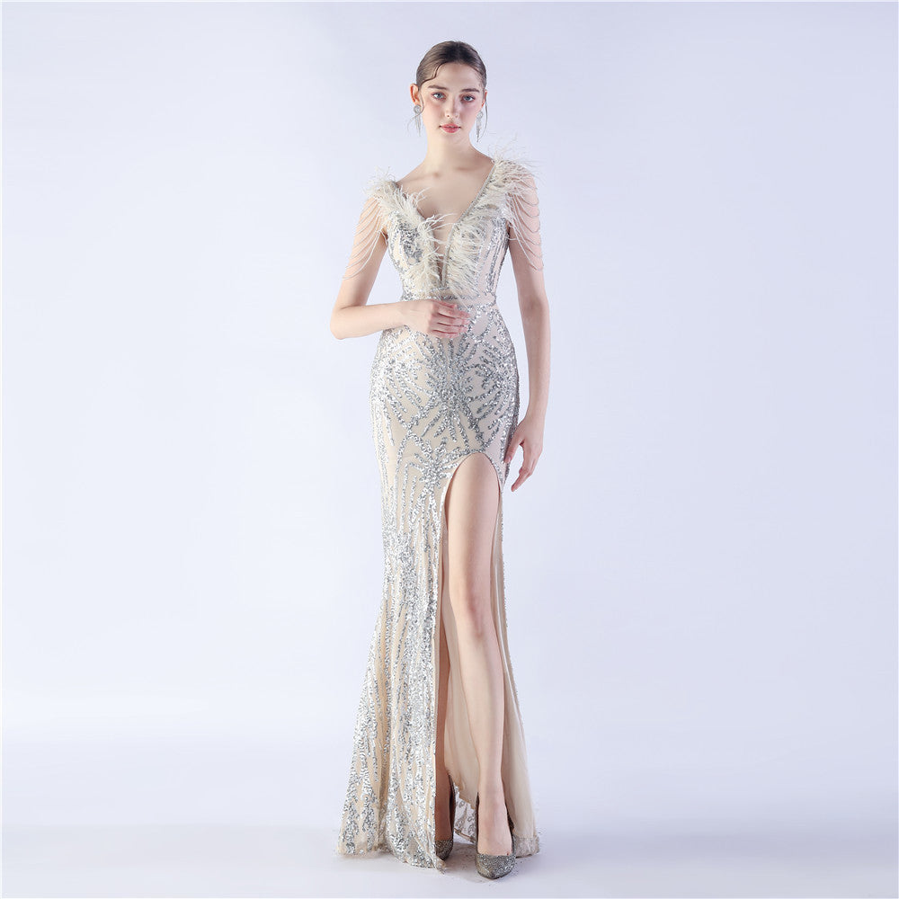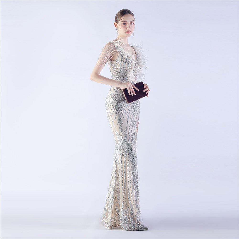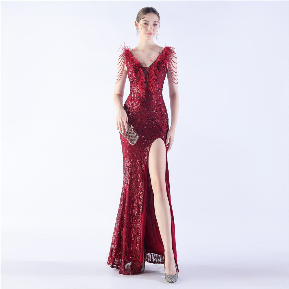 The Ostrich Feather Beaded Maxi Dress offers a slim, floor-skimming silhouette. A V-neckline with feather, bead, and sequin embellishment anchors the front, finished with a center split and a hidden zipper.