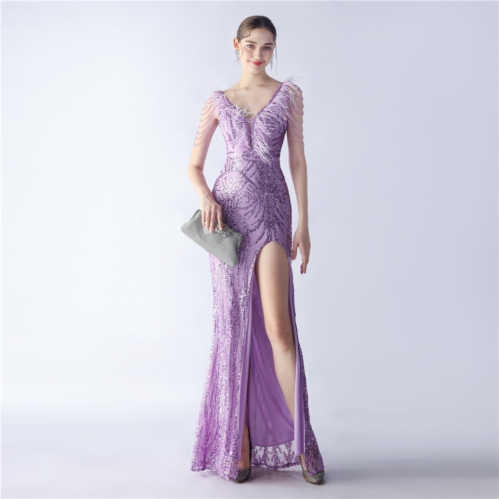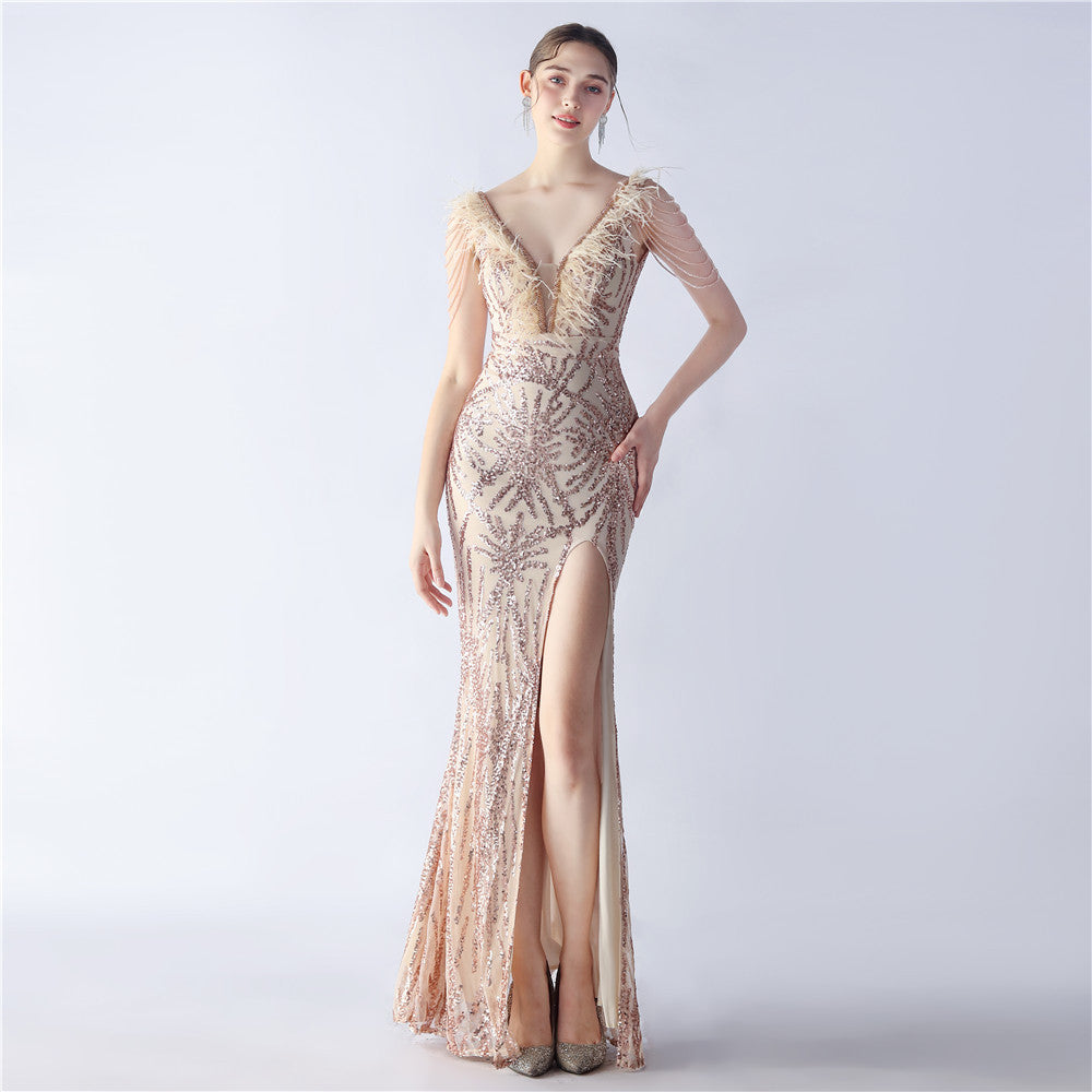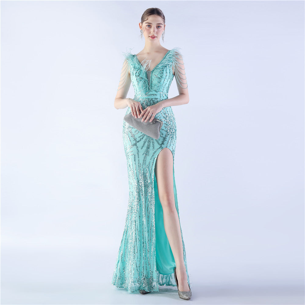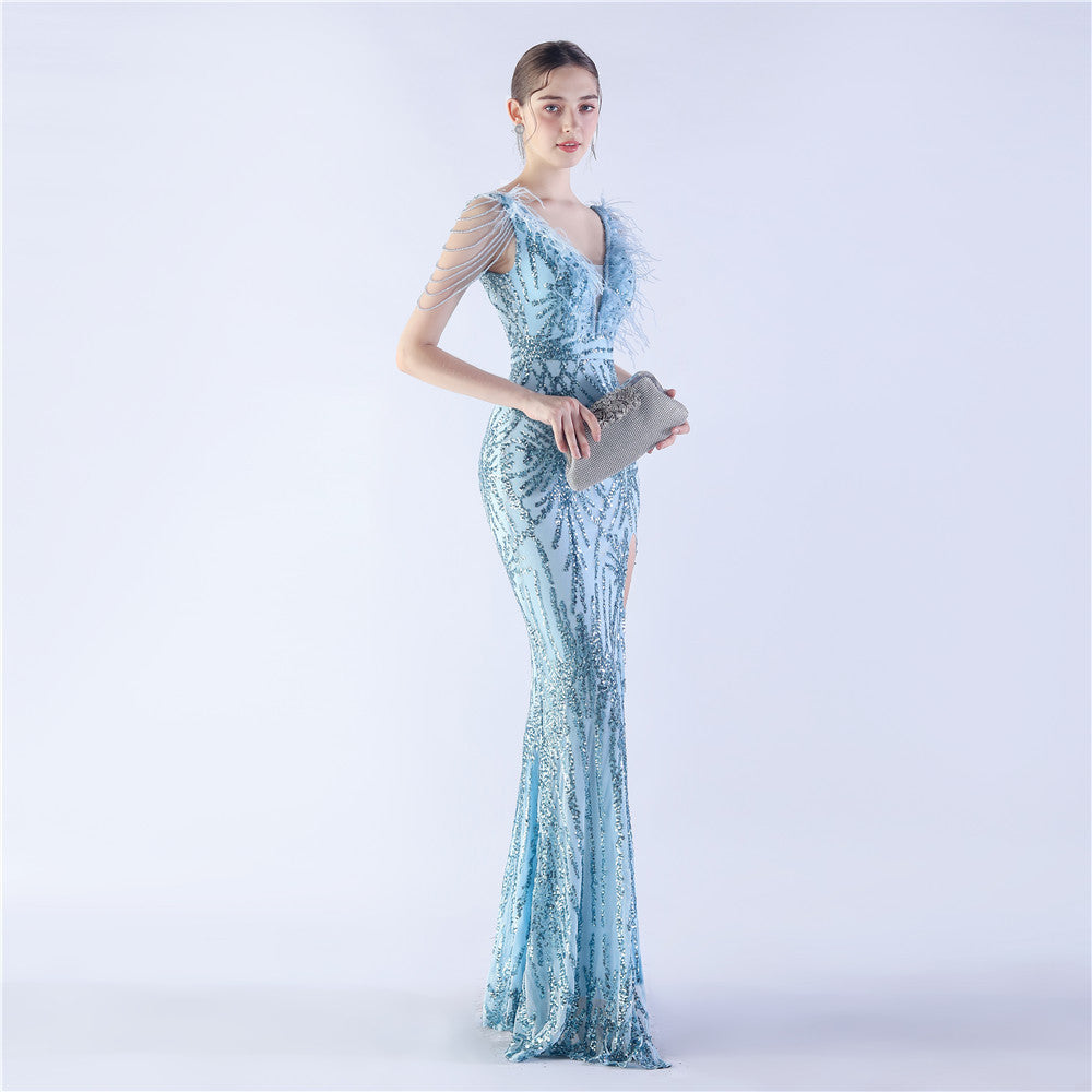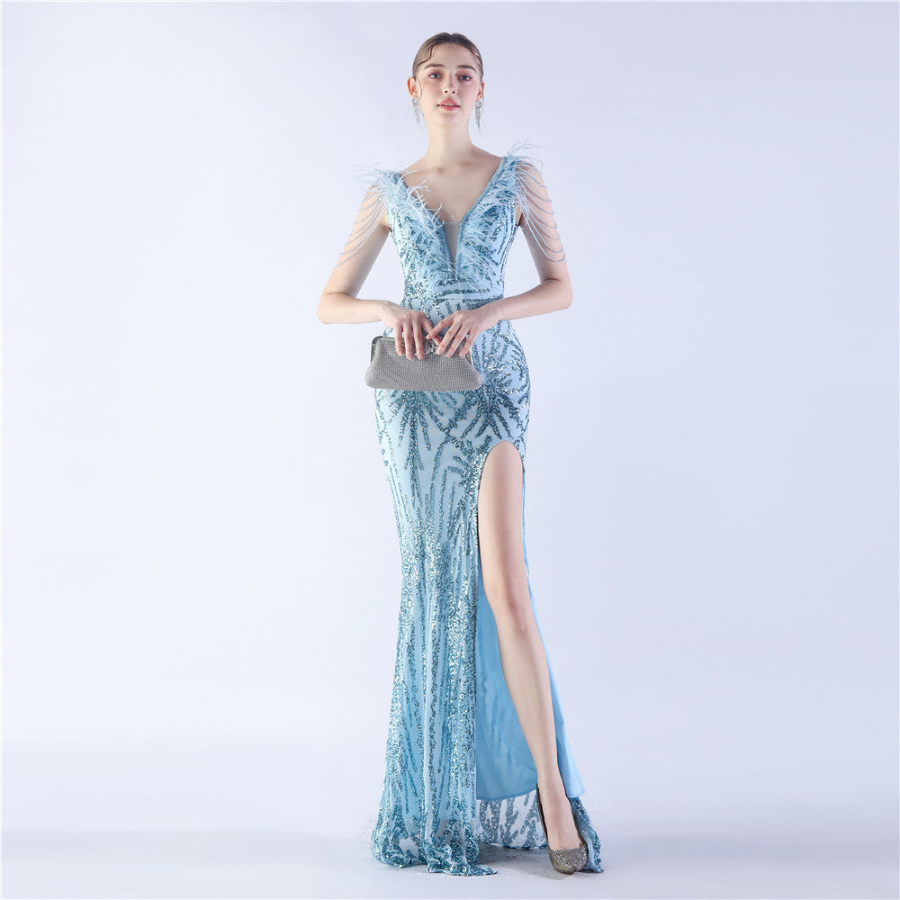 The Ostrich Feather Beaded Maxi Dress offers a slim, floor-skimming silhouette. A V-neckline with feather, bead, and sequin embellishment anchors the front, finished with a center split and a hidden zipper.