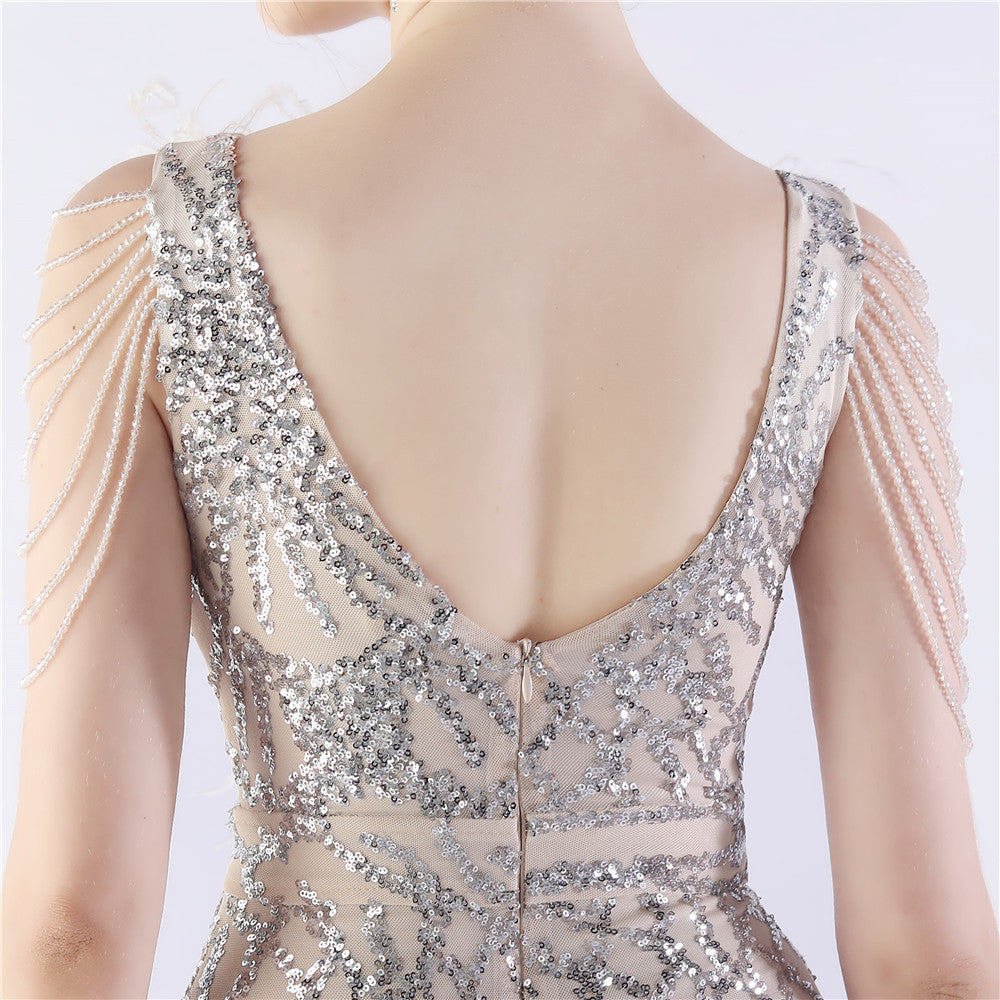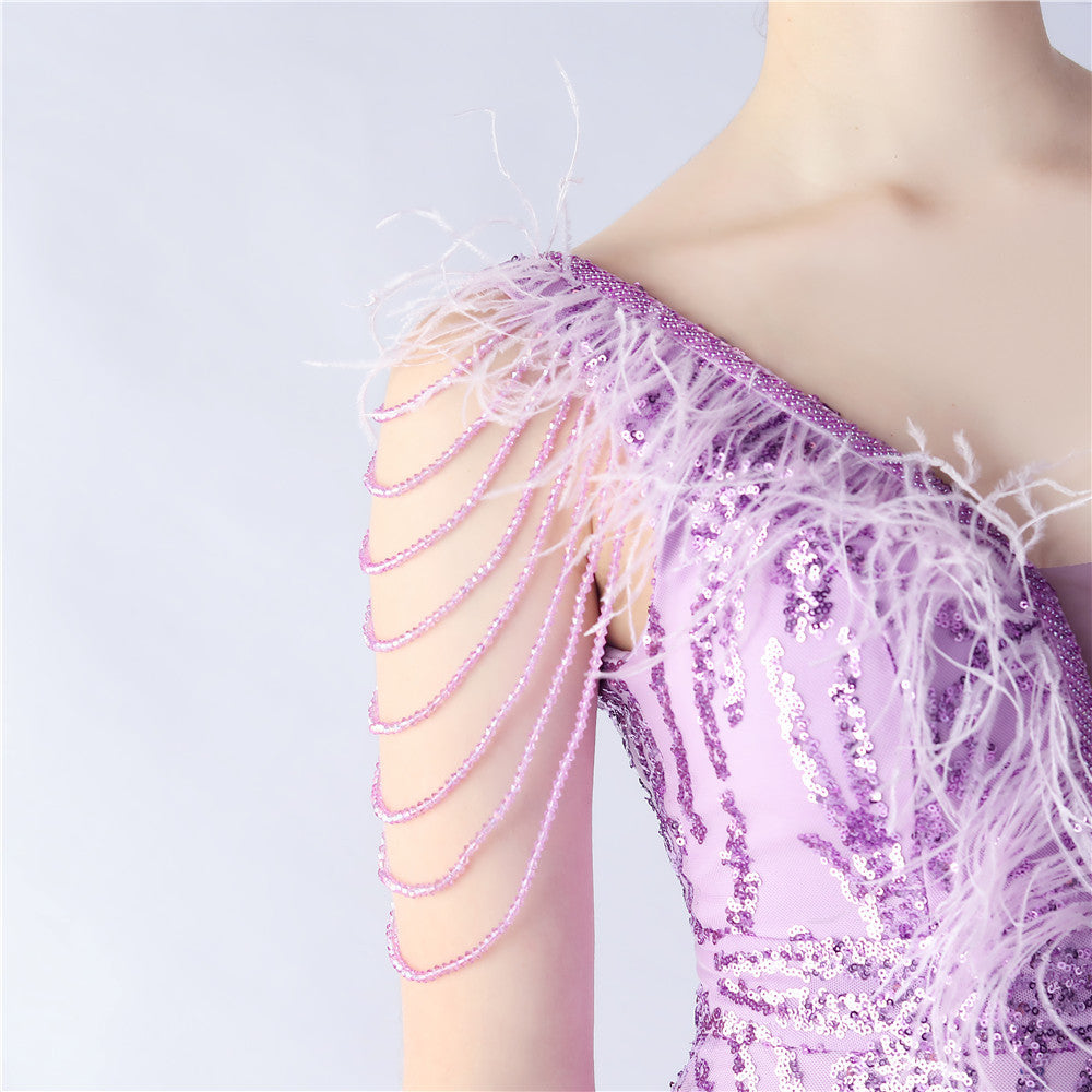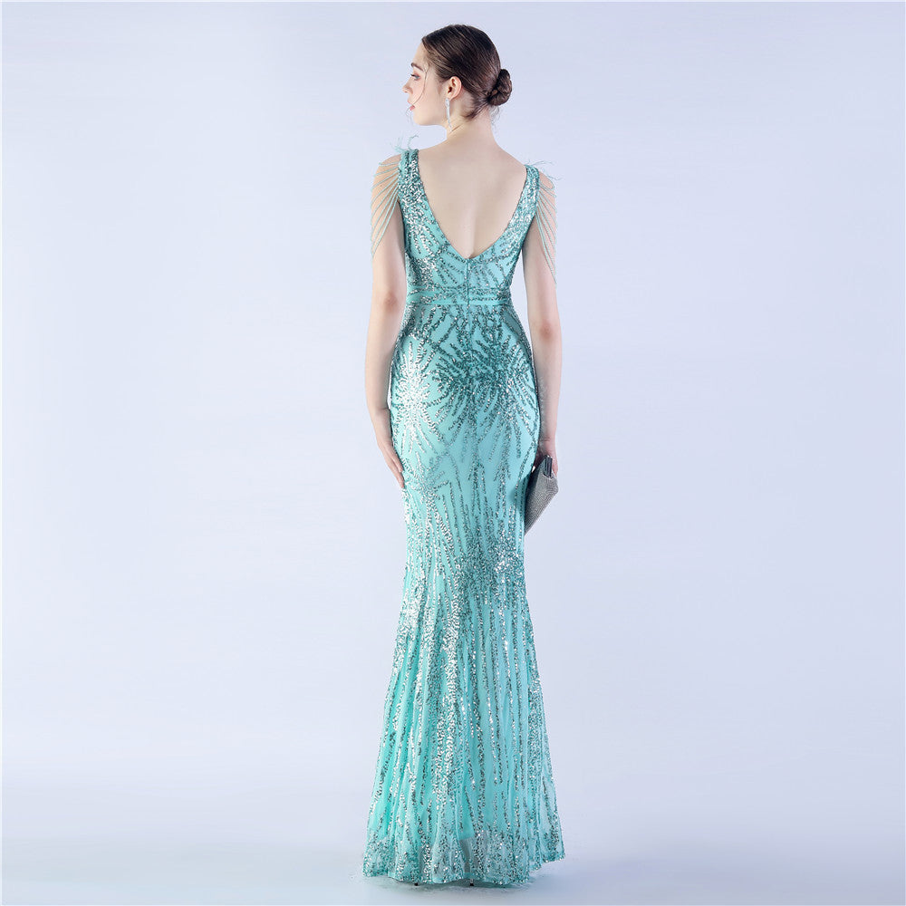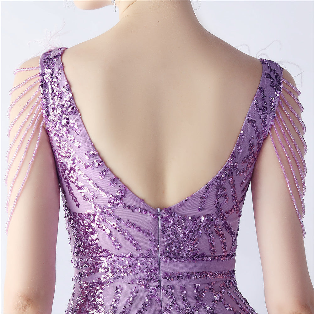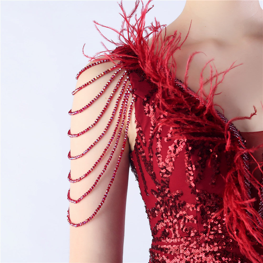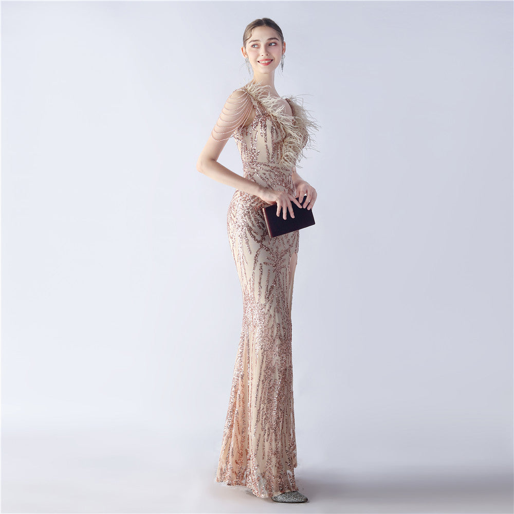 The Ostrich Feather Beaded Maxi Dress offers a slim, floor-skimming silhouette. A V-neckline with feather, bead, and sequin embellishment anchors the front, finished with a center split and a hidden zipper.