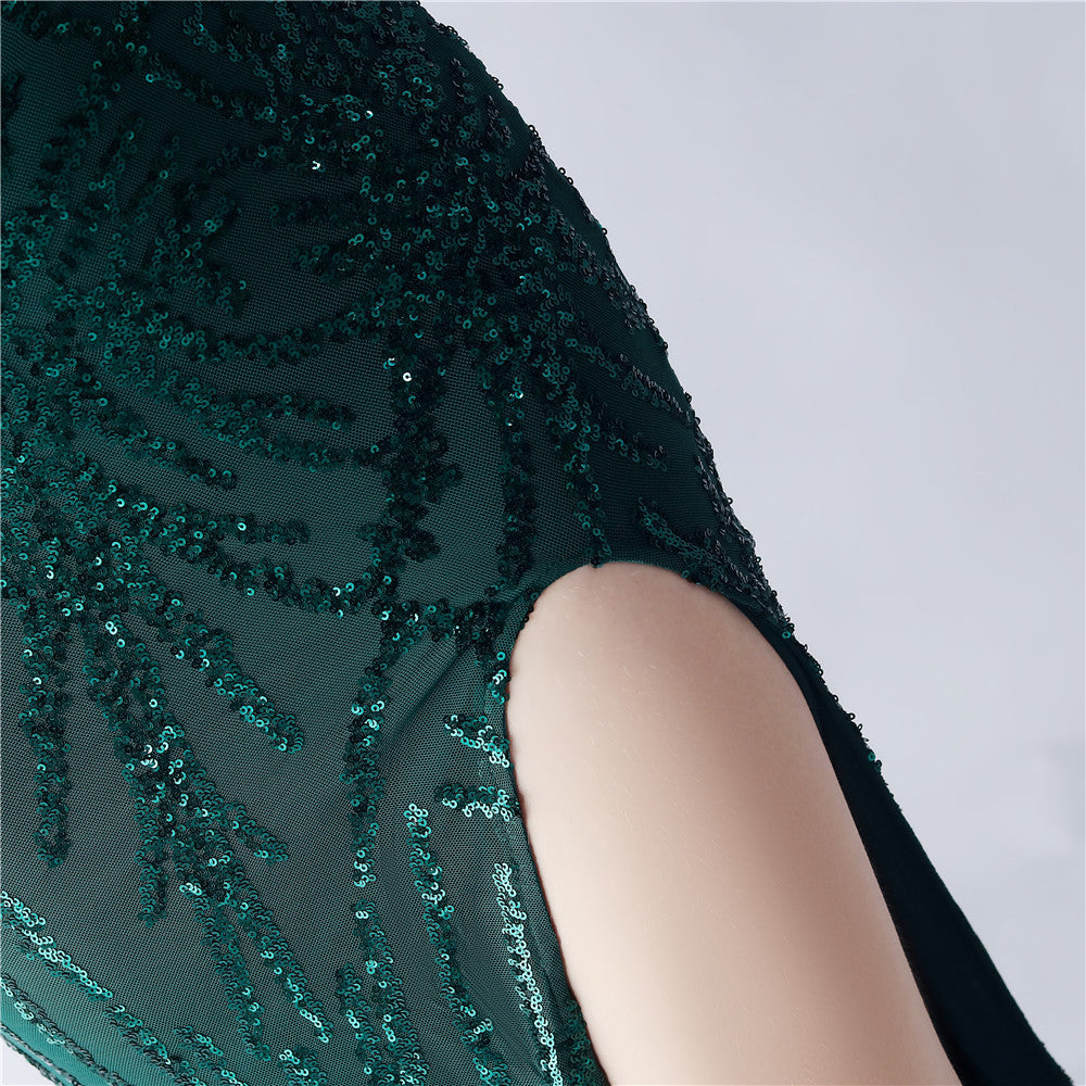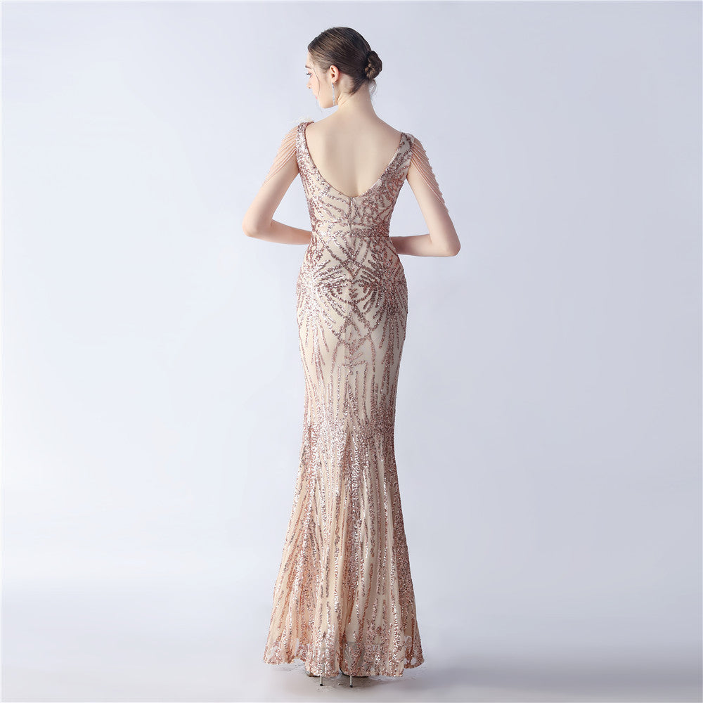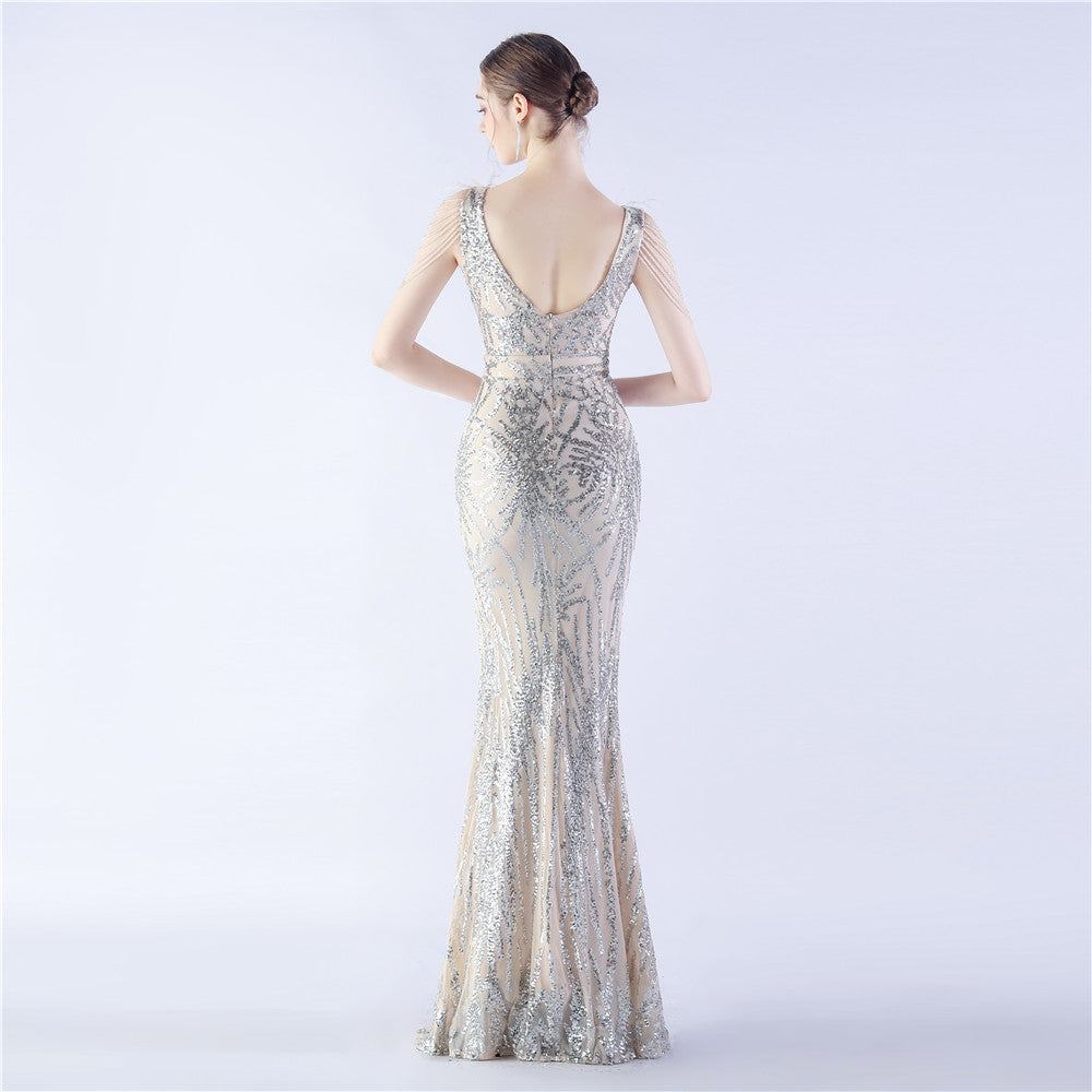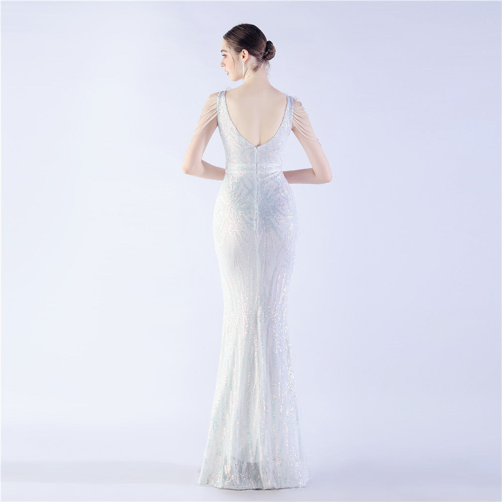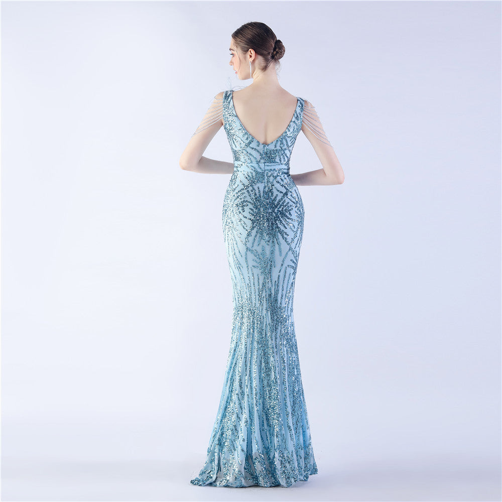 The Ostrich Feather Beaded Maxi Dress offers a slim, floor-skimming silhouette. A V-neckline with feather, bead, and sequin embellishment anchors the front, finished with a center split and a hidden zipper.