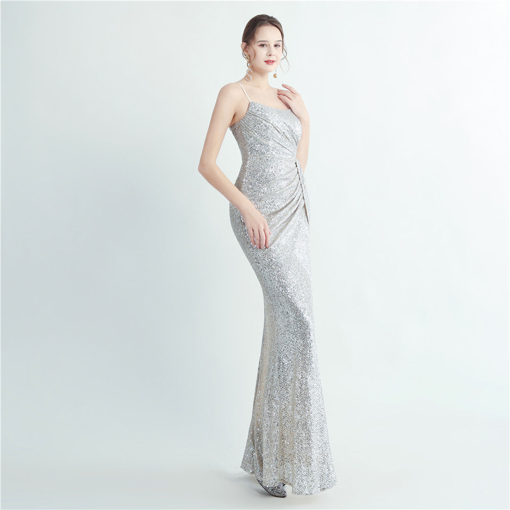 A maxi dress with a slim profile and flowing pleats. Spaghetti straps frame the neckline, while ruched sequins and a side slit add subtle detail.