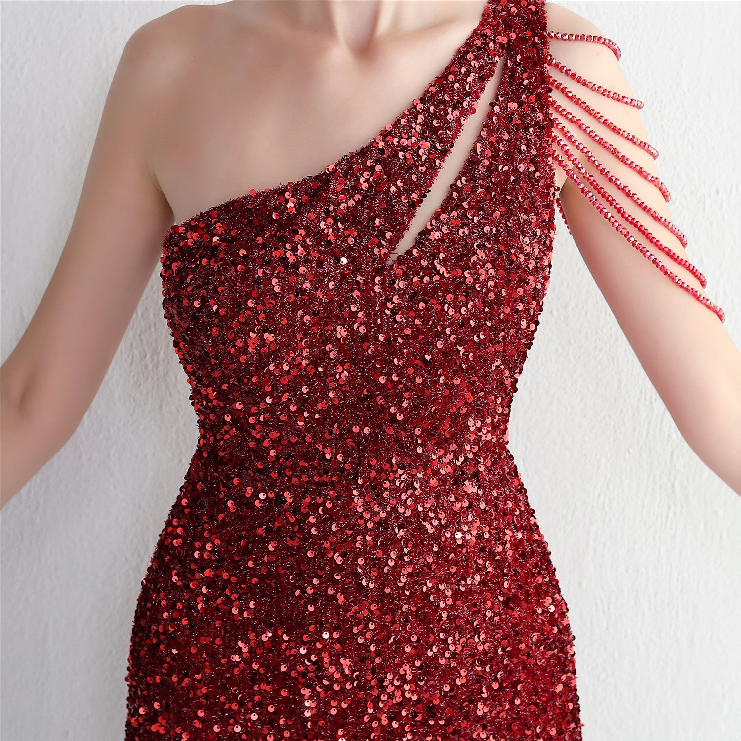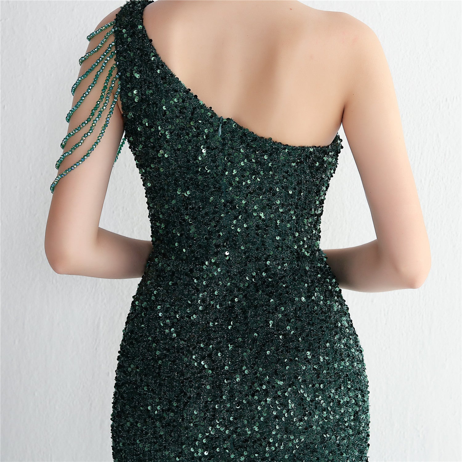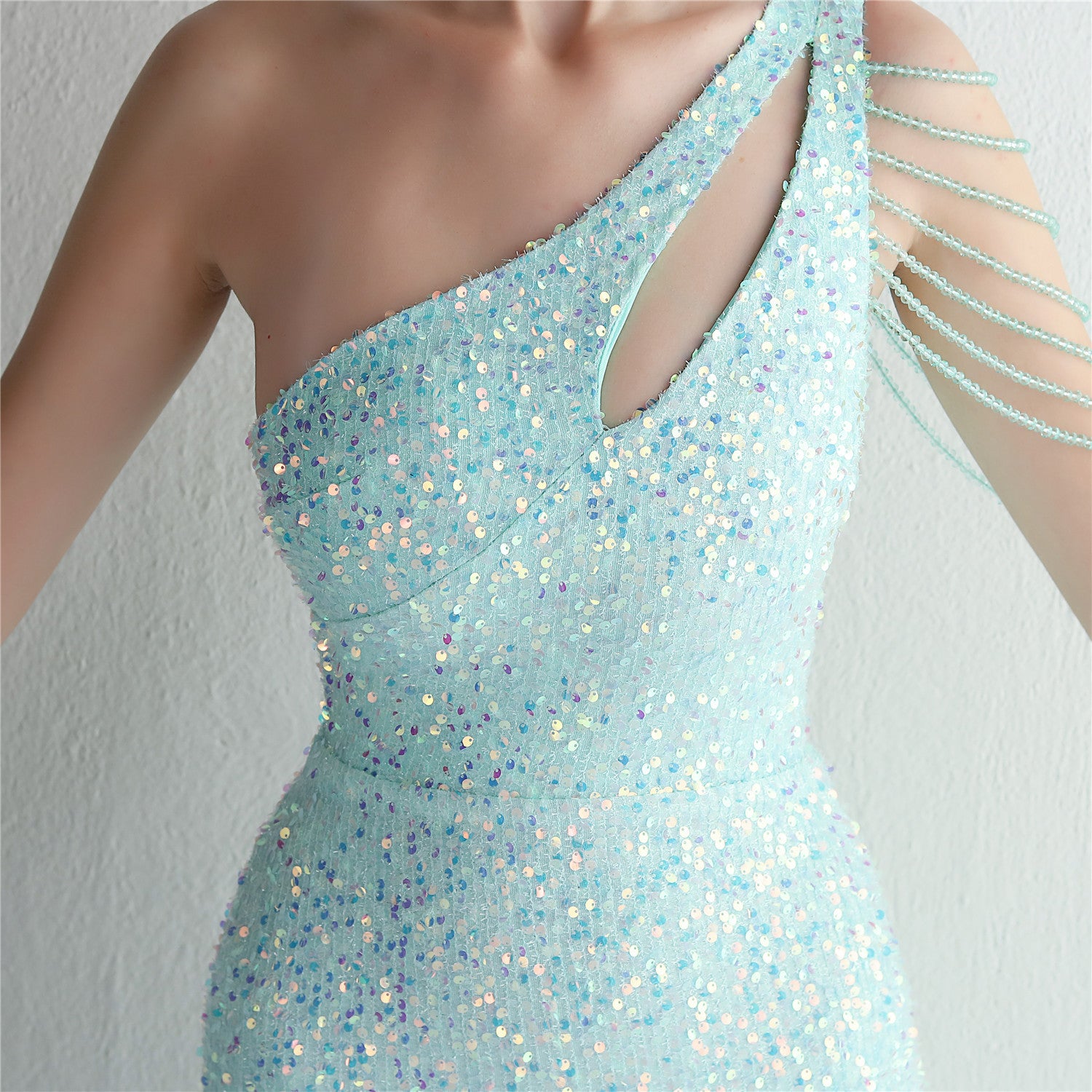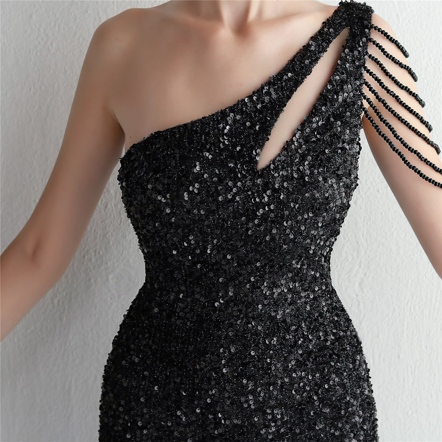 A sleek one-shoulder maxi with a fishtail silhouette. Sequins and beads embellish the bodice, with an asymmetric cutout and a subtle front split.