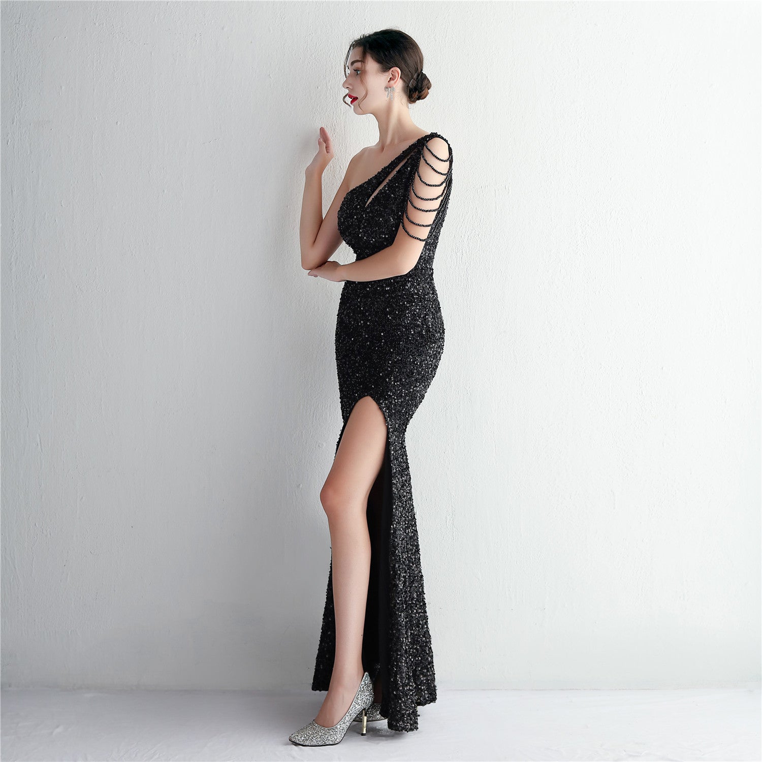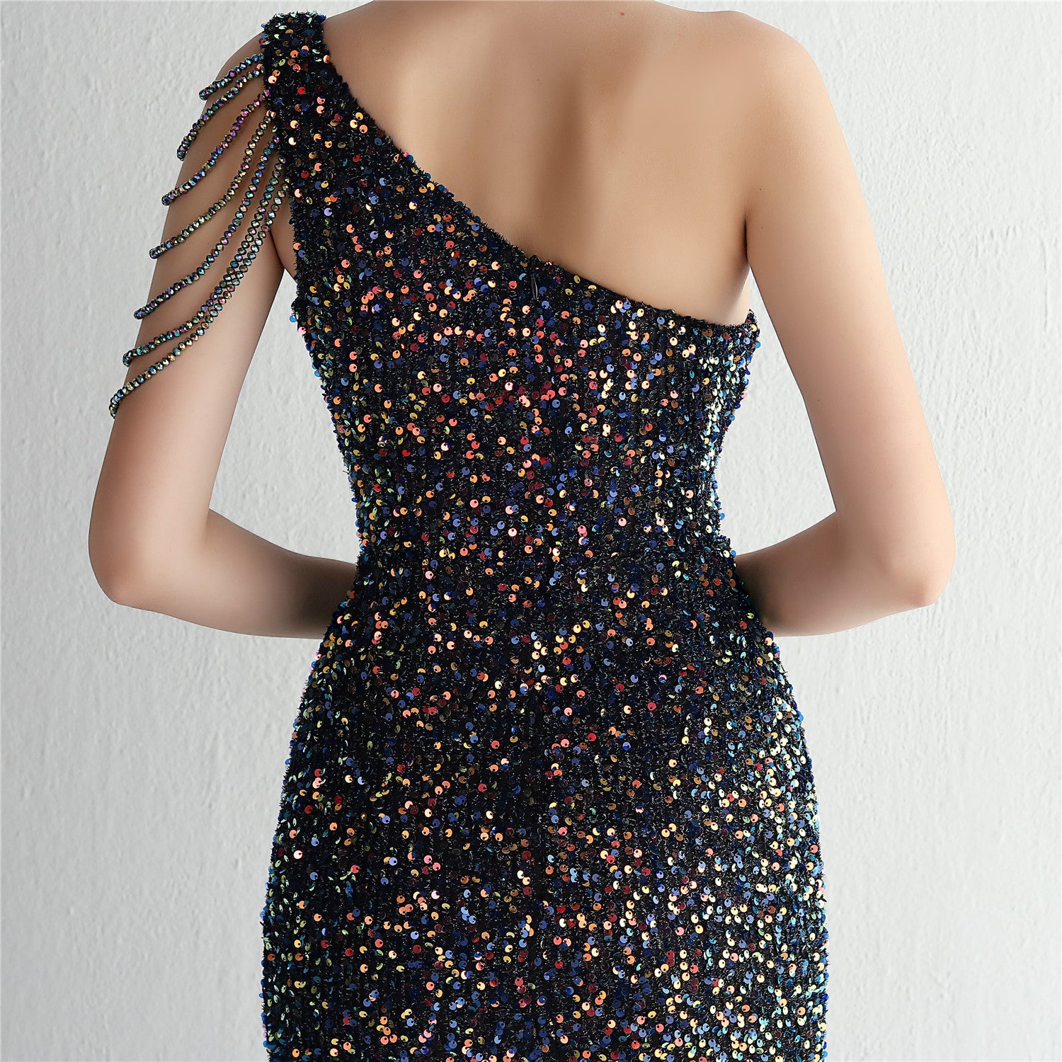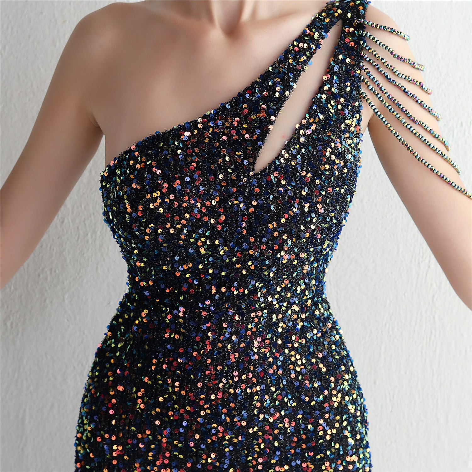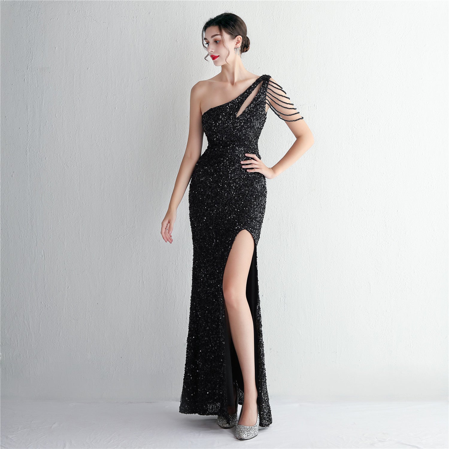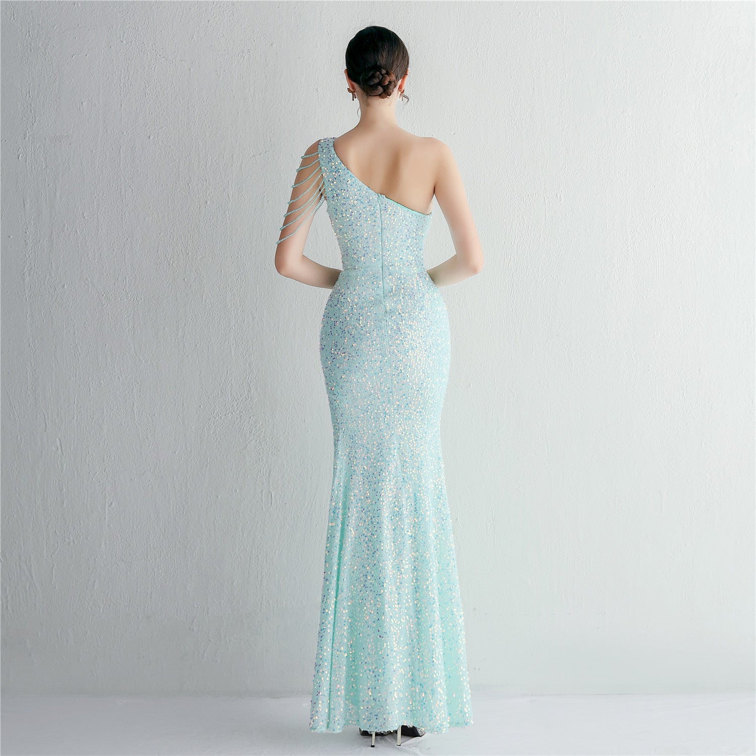 A sleek one-shoulder maxi with a fishtail silhouette. Sequins and beads embellish the bodice, with an asymmetric cutout and a subtle front split.