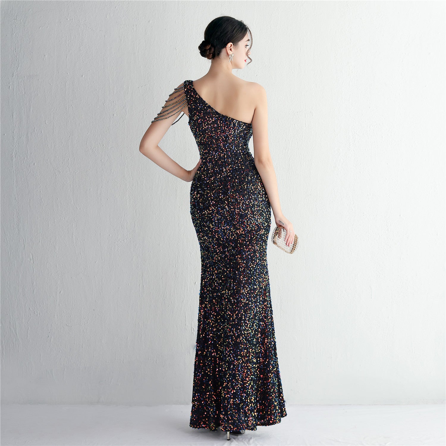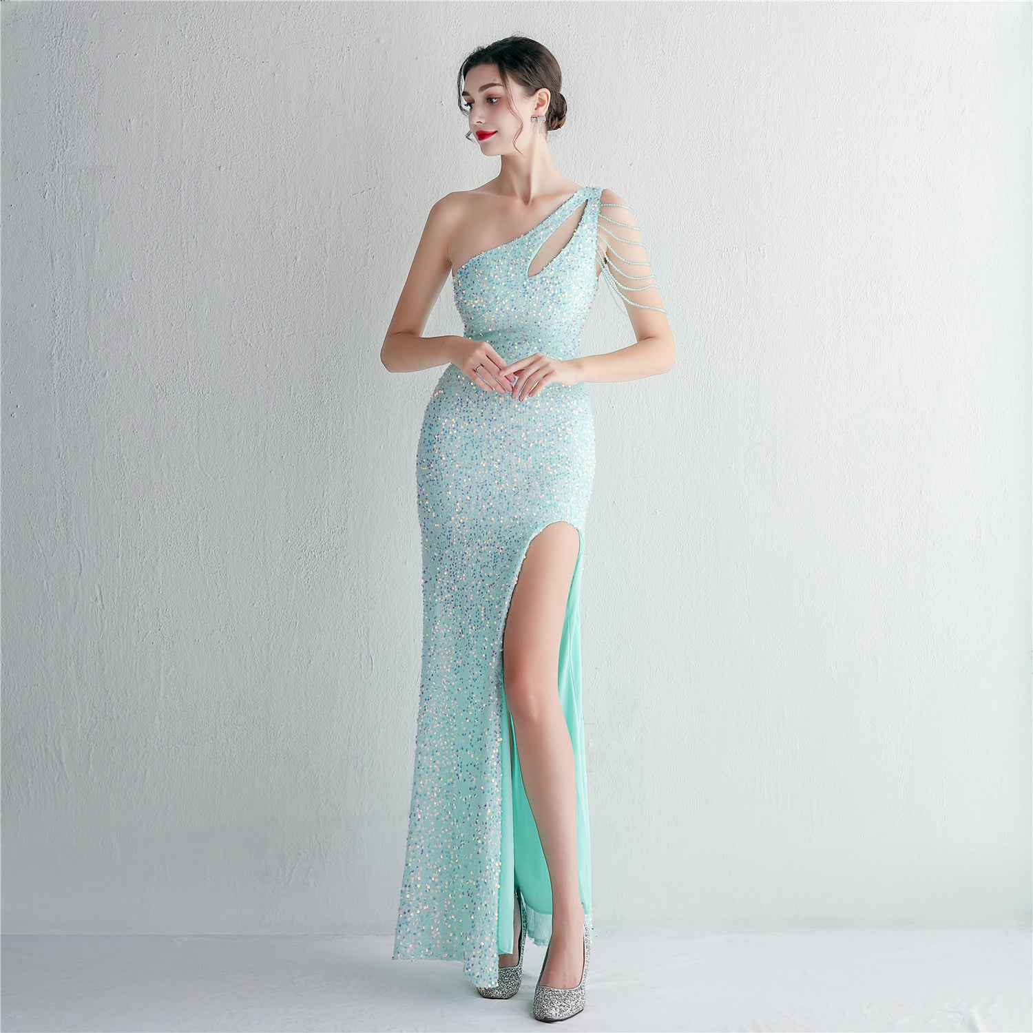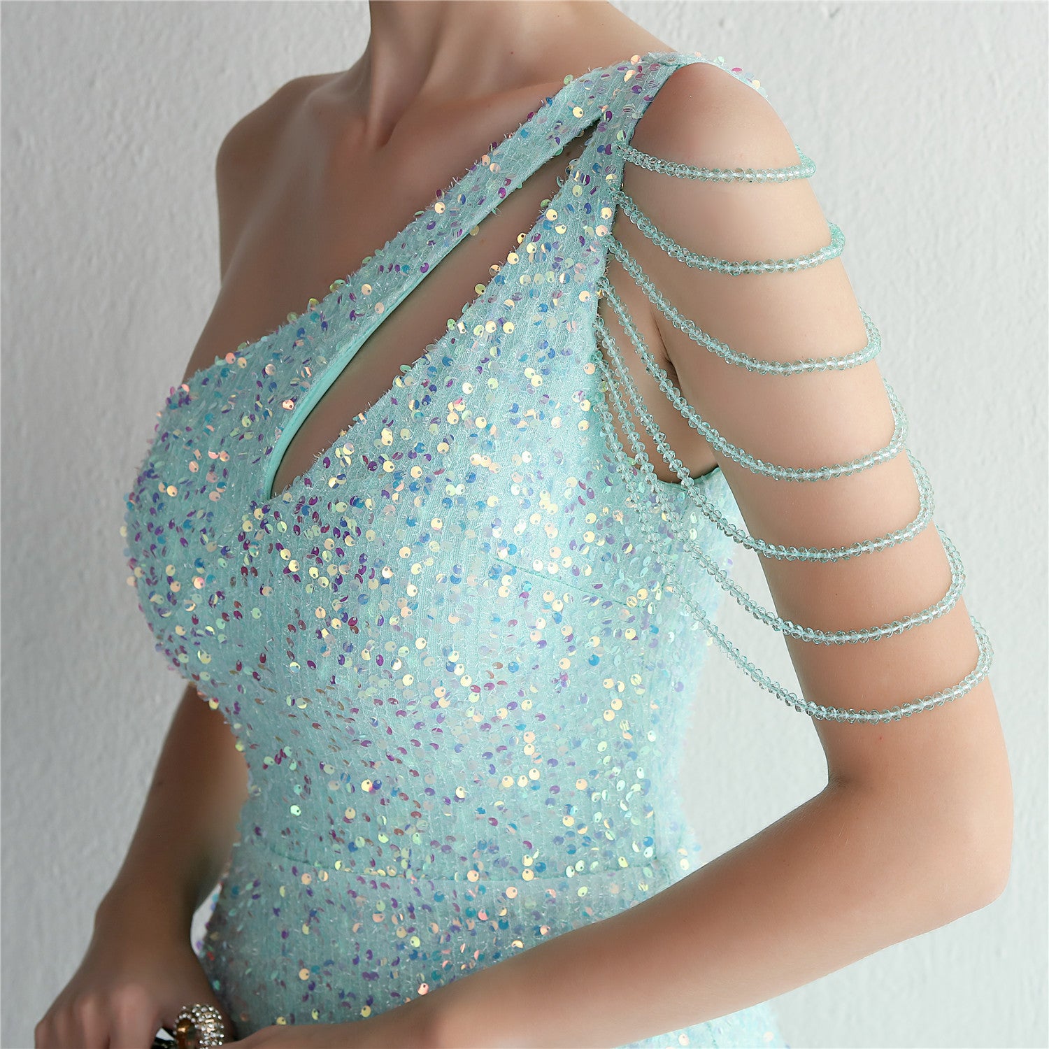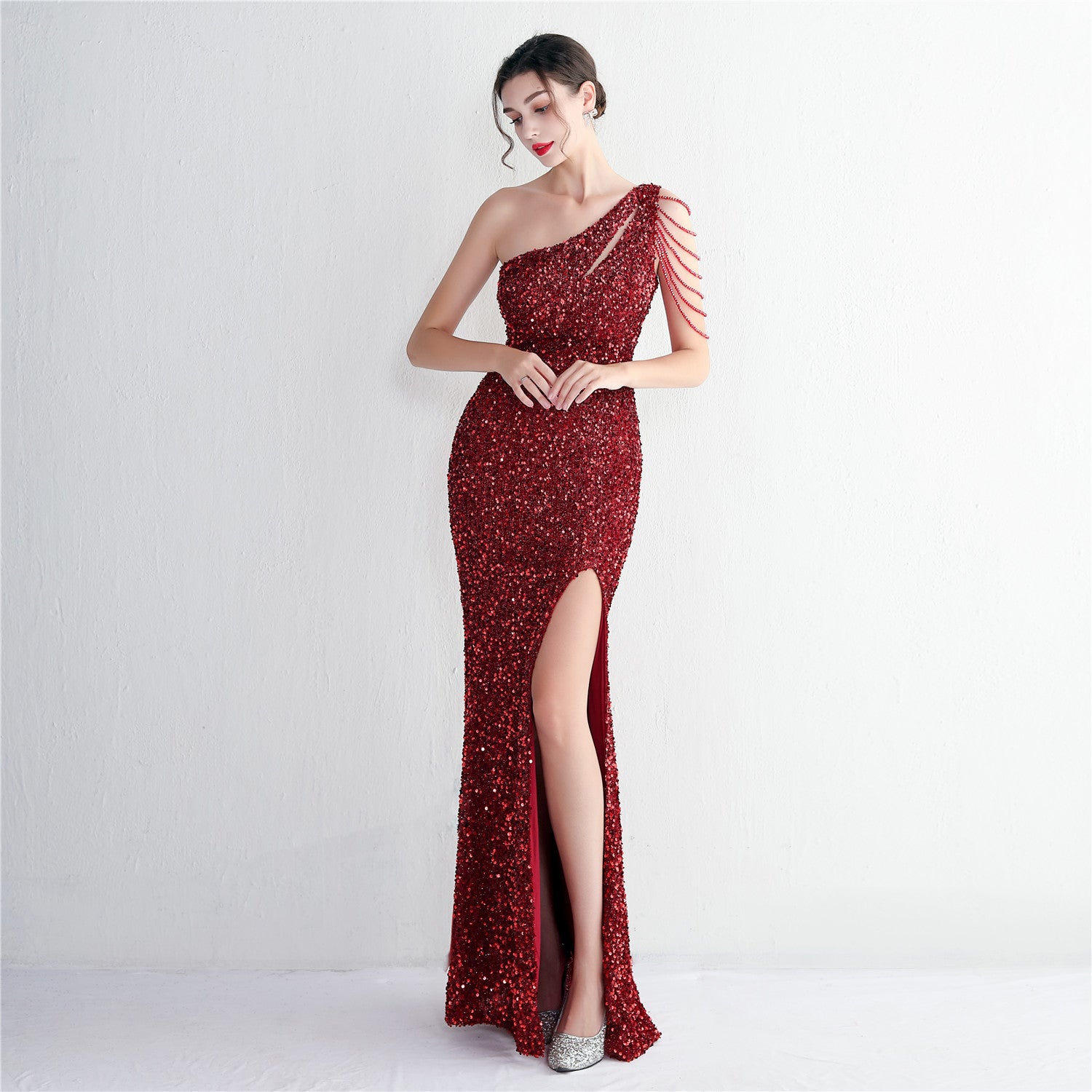 A sleek one-shoulder maxi with a fishtail silhouette. Sequins and beads embellish the bodice, with an asymmetric cutout and a subtle front split.