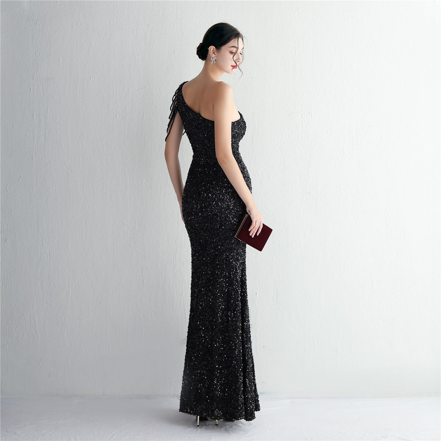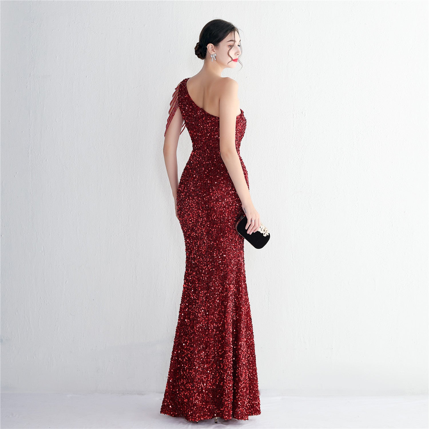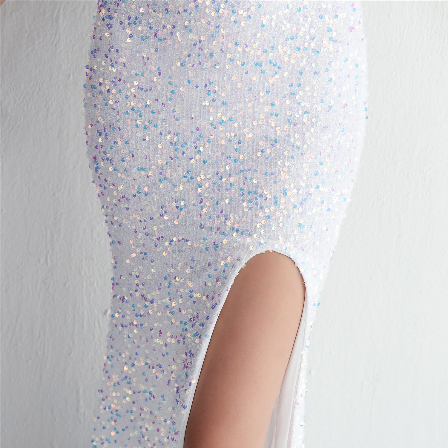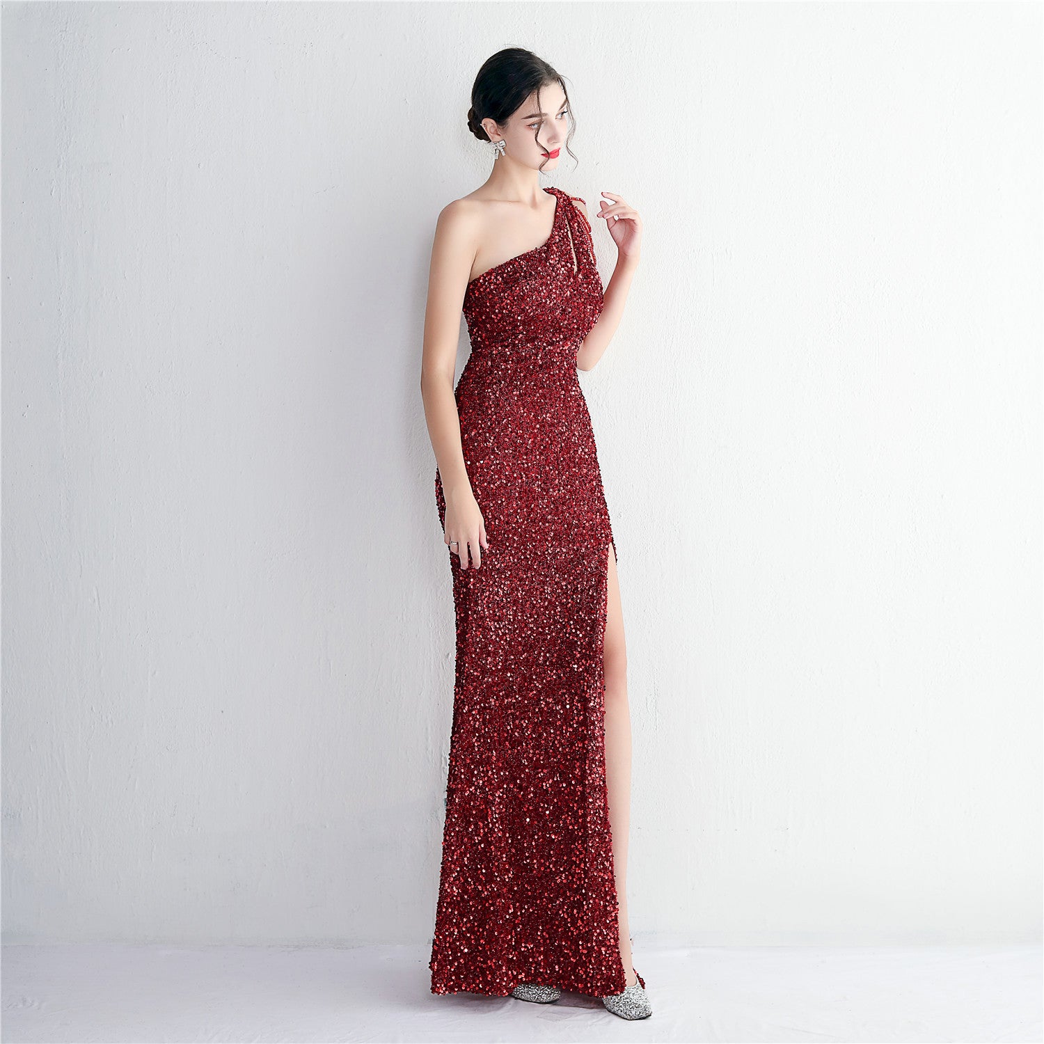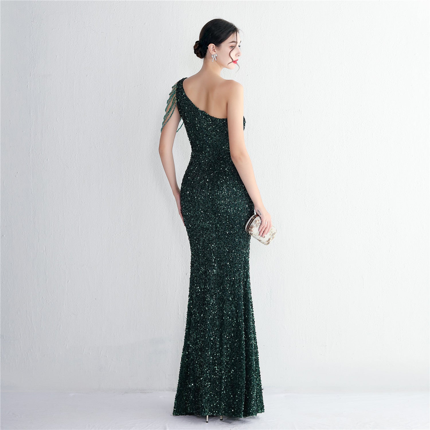 A sleek one-shoulder maxi with a fishtail silhouette. Sequins and beads embellish the bodice, with an asymmetric cutout and a subtle front split.