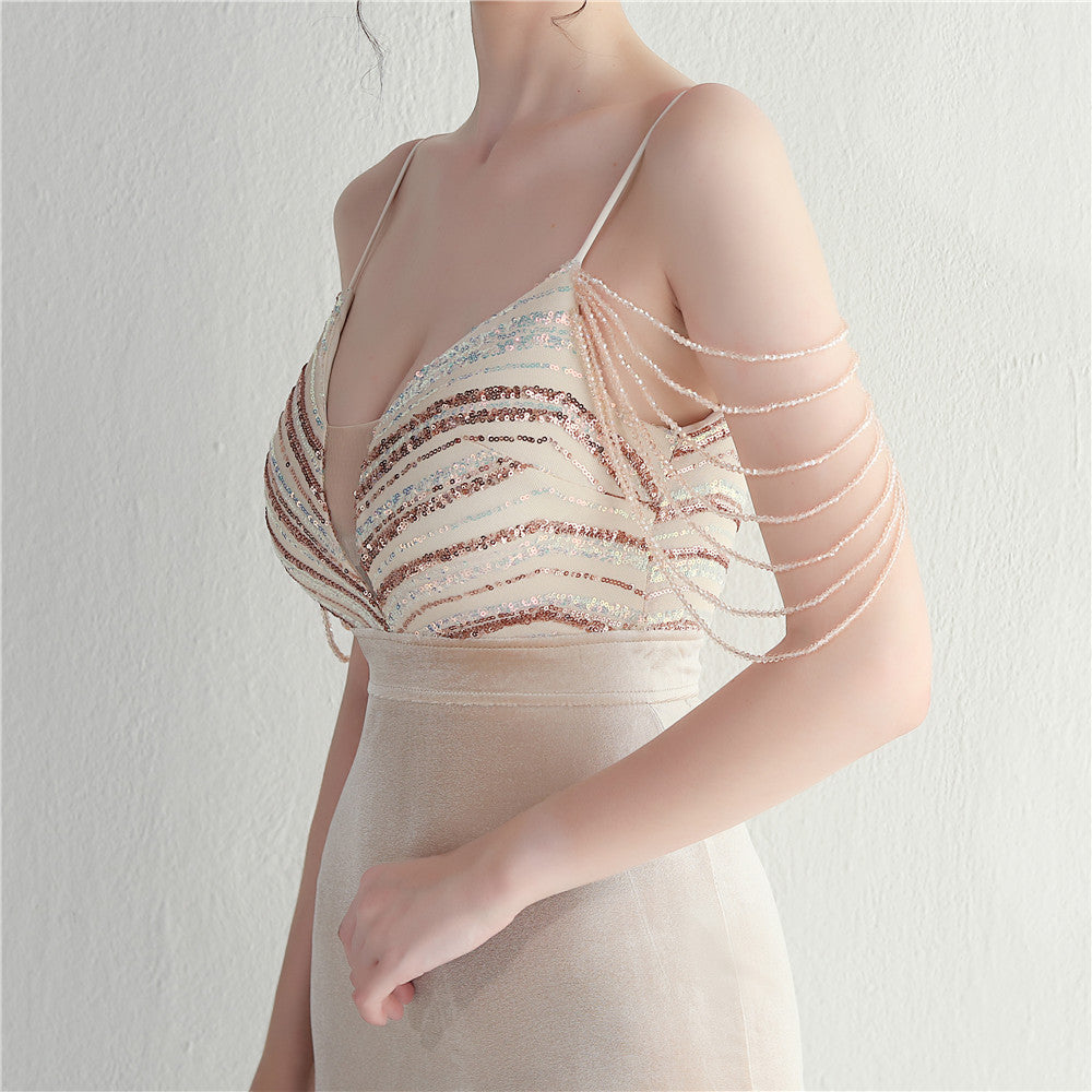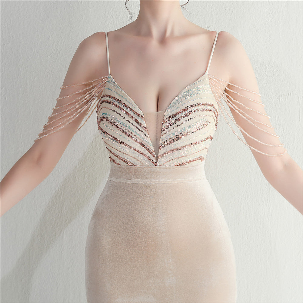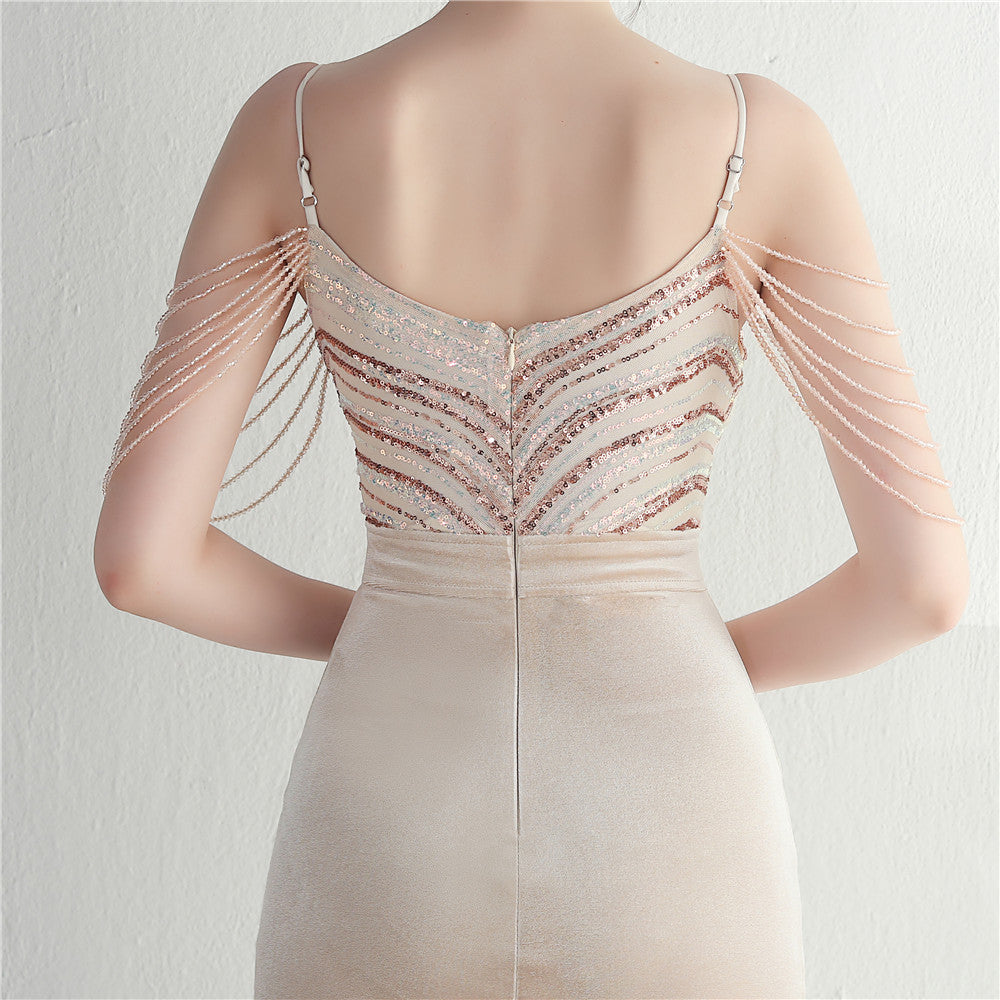 A sleek maxi dress with a slim silhouette. It features a V-neck, a side split, and sequin embellishments for understated shine.