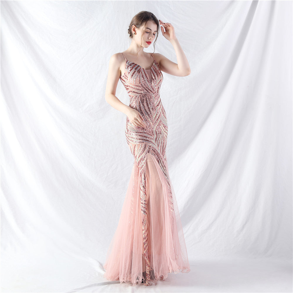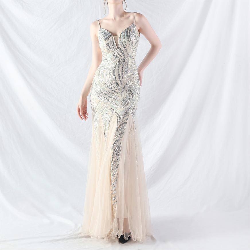 A slim, maxi silhouette defines the dress. A V-neckline and sleeveless mesh overlay, sequined throughout, pair with a concealed back zipper.