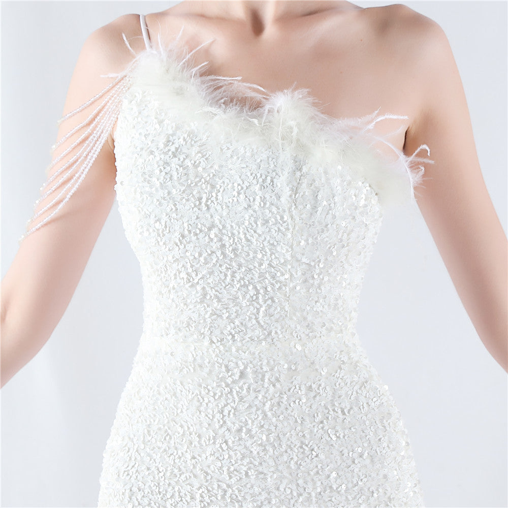 A one-shoulder maxi dress with a slim, streamlined silhouette. Feathers and sequins trace the asymmetric line, finished with a discreet zipper.