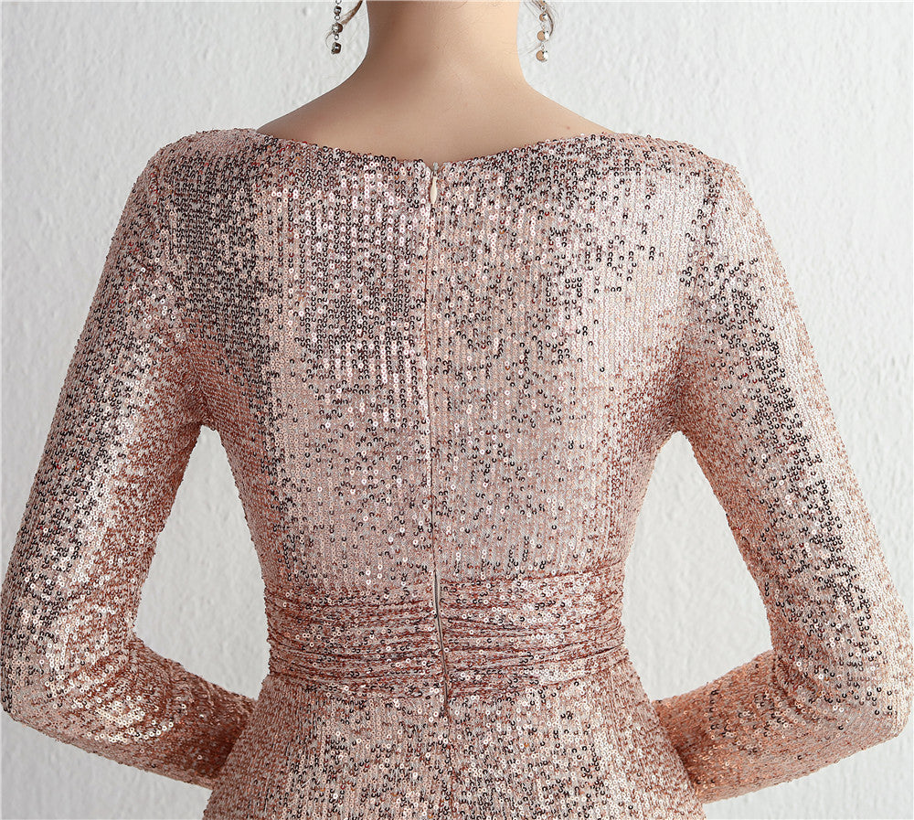 Sequined elegance in a slim, long-line silhouette. The crew-neck, long-sleeve maxi features a fishtail hem with a subtle side split.
