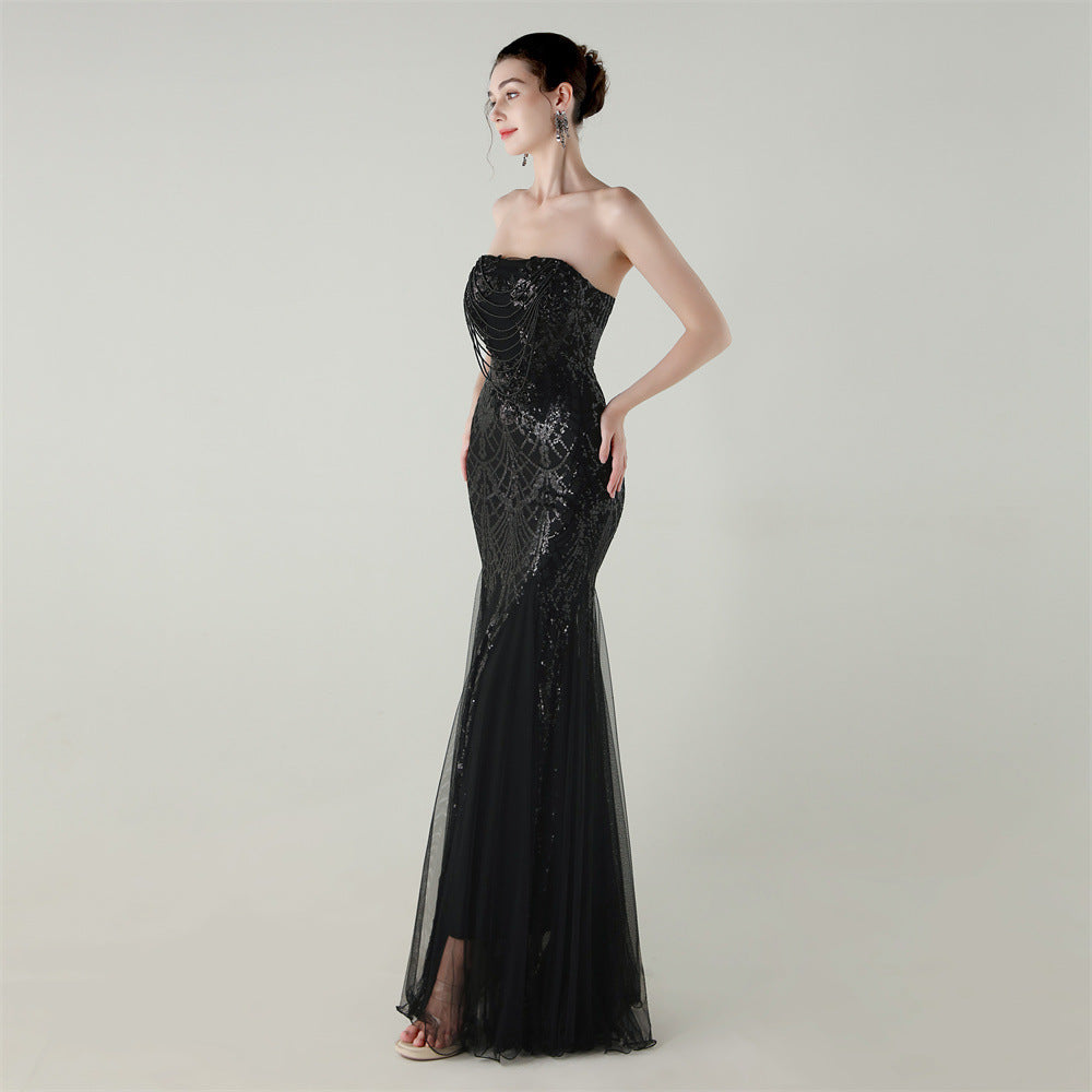 A slim fishtail maxi with a strapless neckline. Backless with beadwork and sequin embellishment and a hidden back zipper.