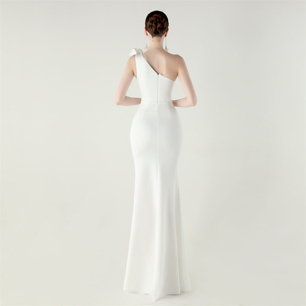 This one-shoulder maxi dress offers a clean, sculpted silhouette. An asymmetric neckline with 3D floral detail and a front split anchors the look.