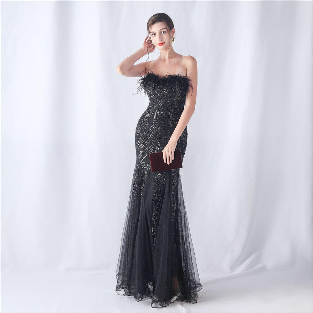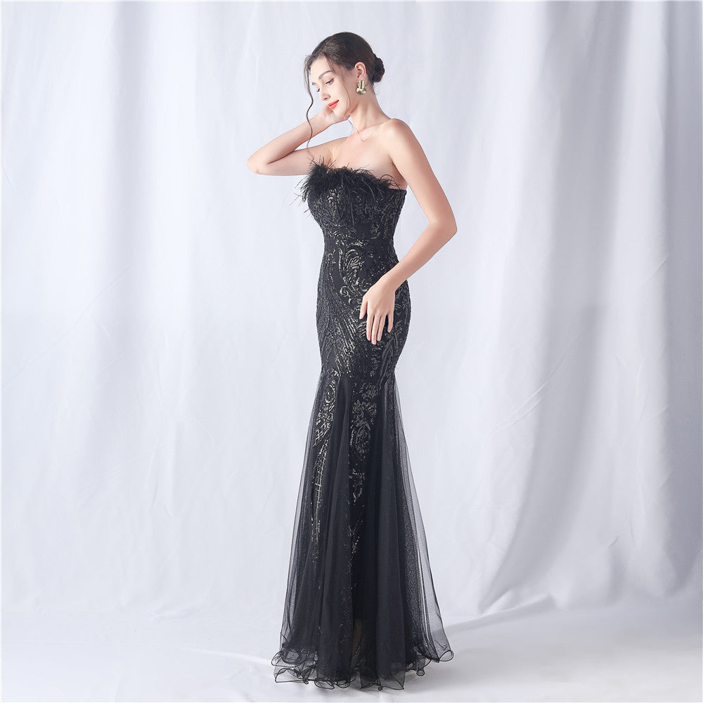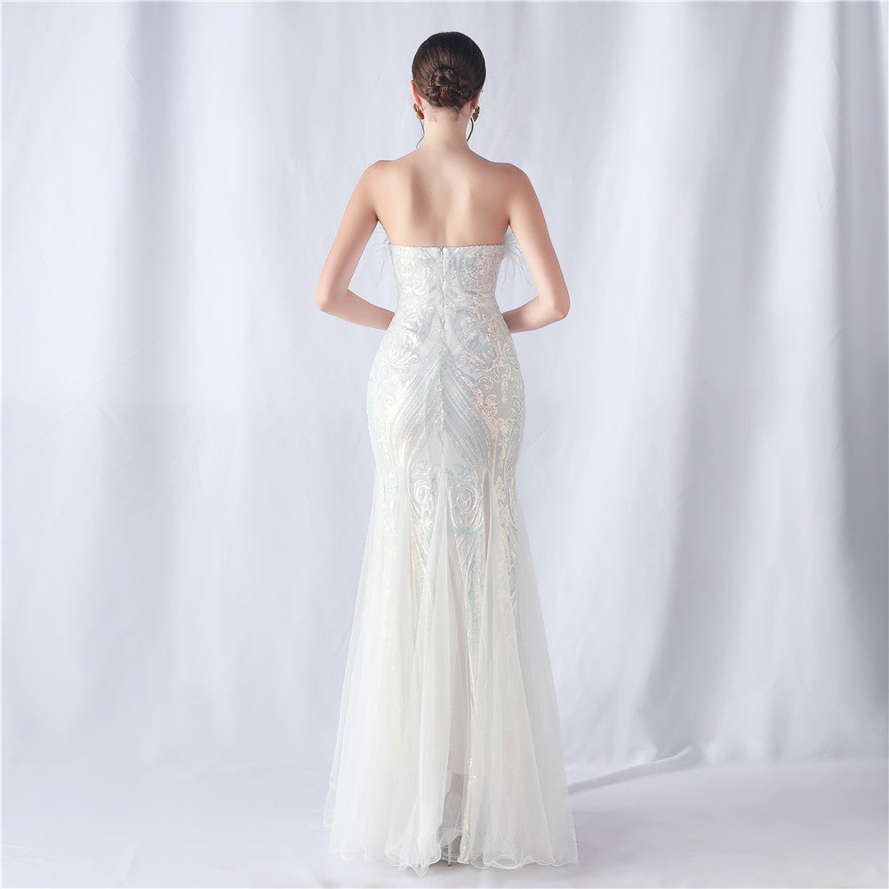 This strapless maxi dress features a slim, fishtail silhouette. Feathers and sequins provide refined embellishment with subtle lace/tulle texture along the length.