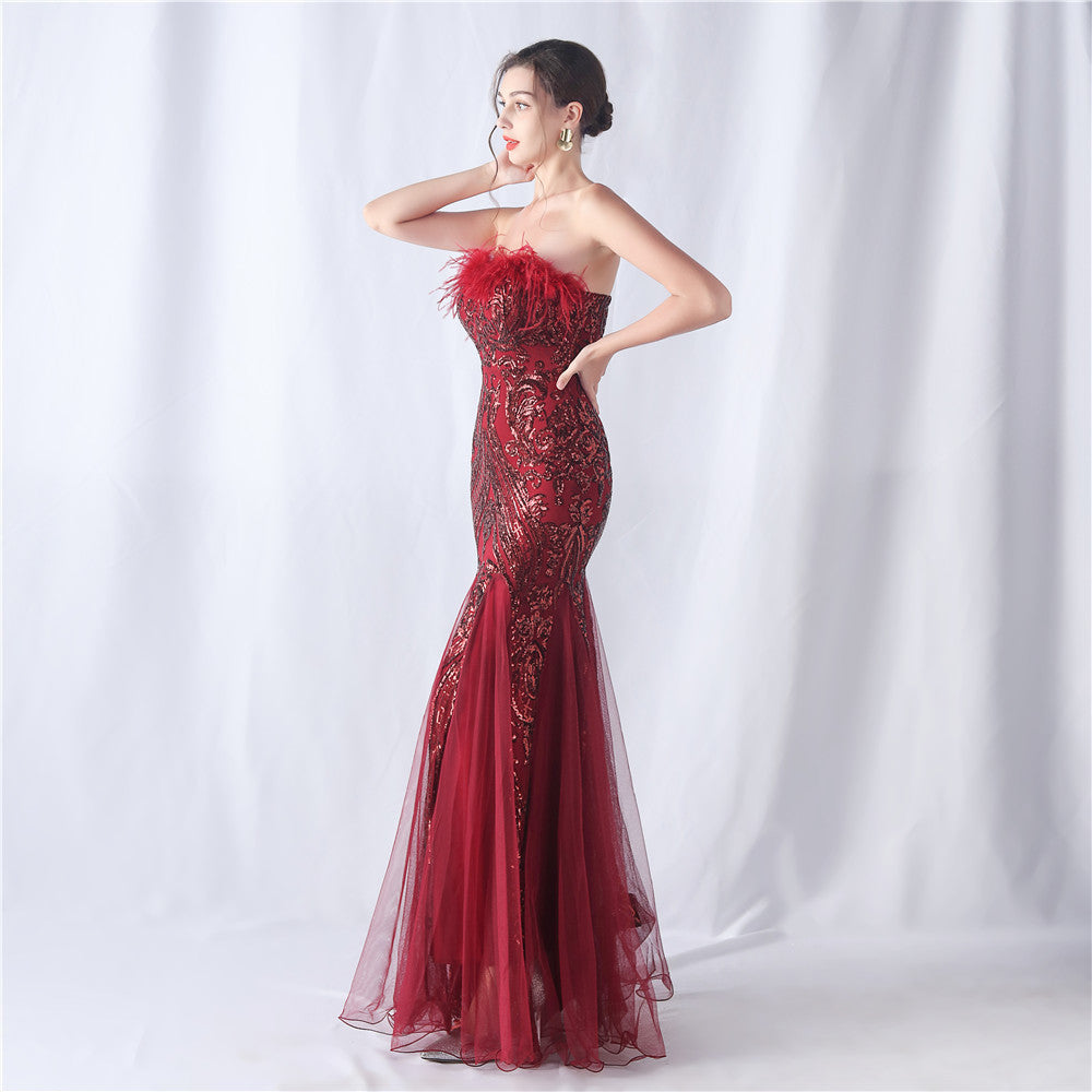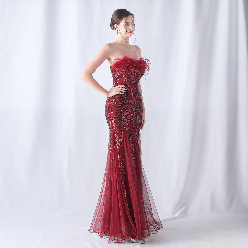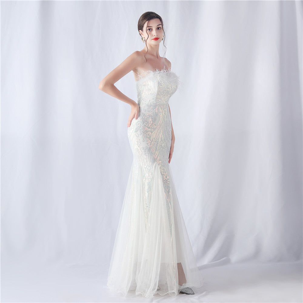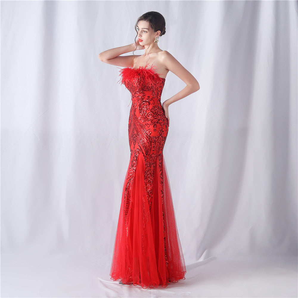This strapless maxi dress features a slim, fishtail silhouette. Feathers and sequins provide refined embellishment with subtle lace/tulle texture along the length.