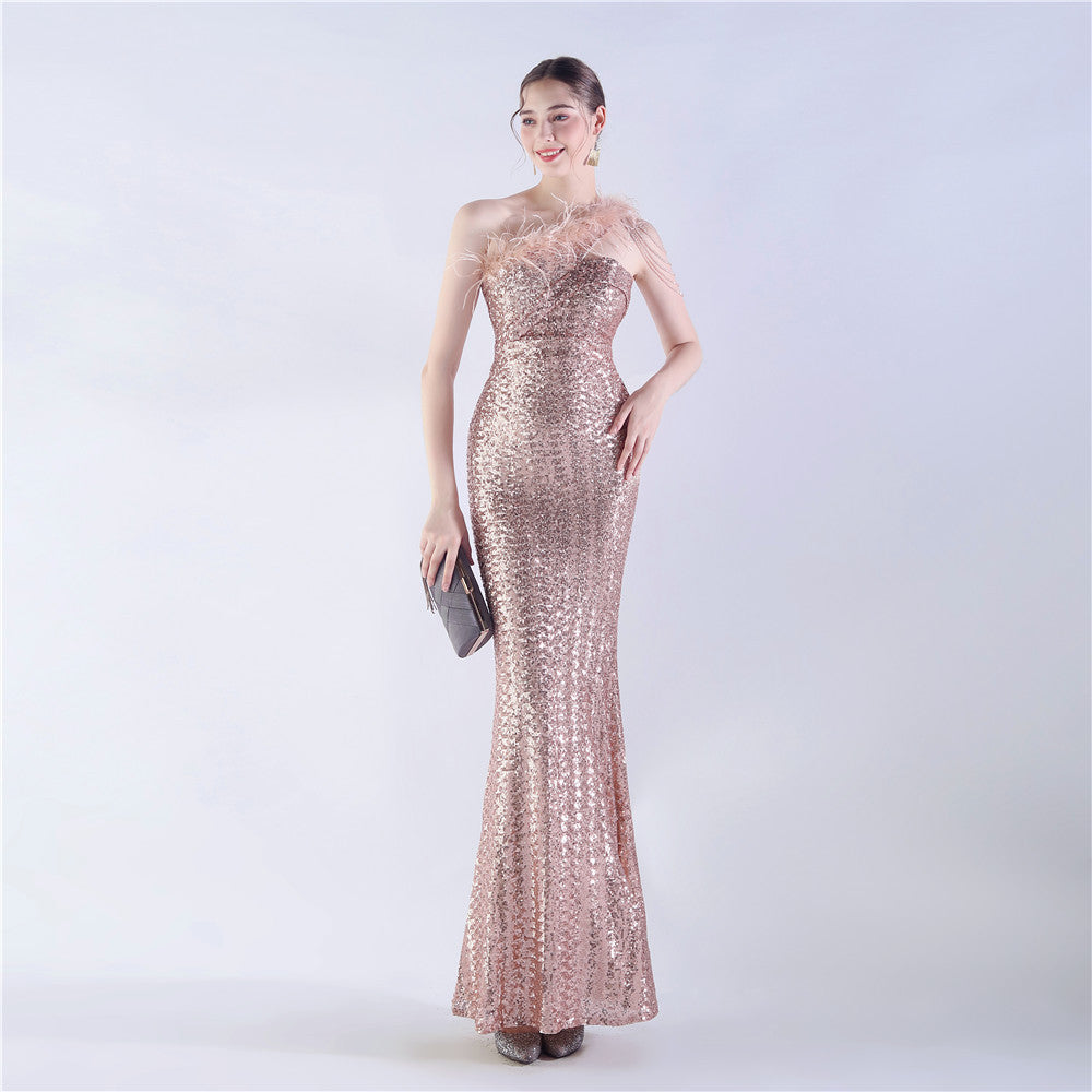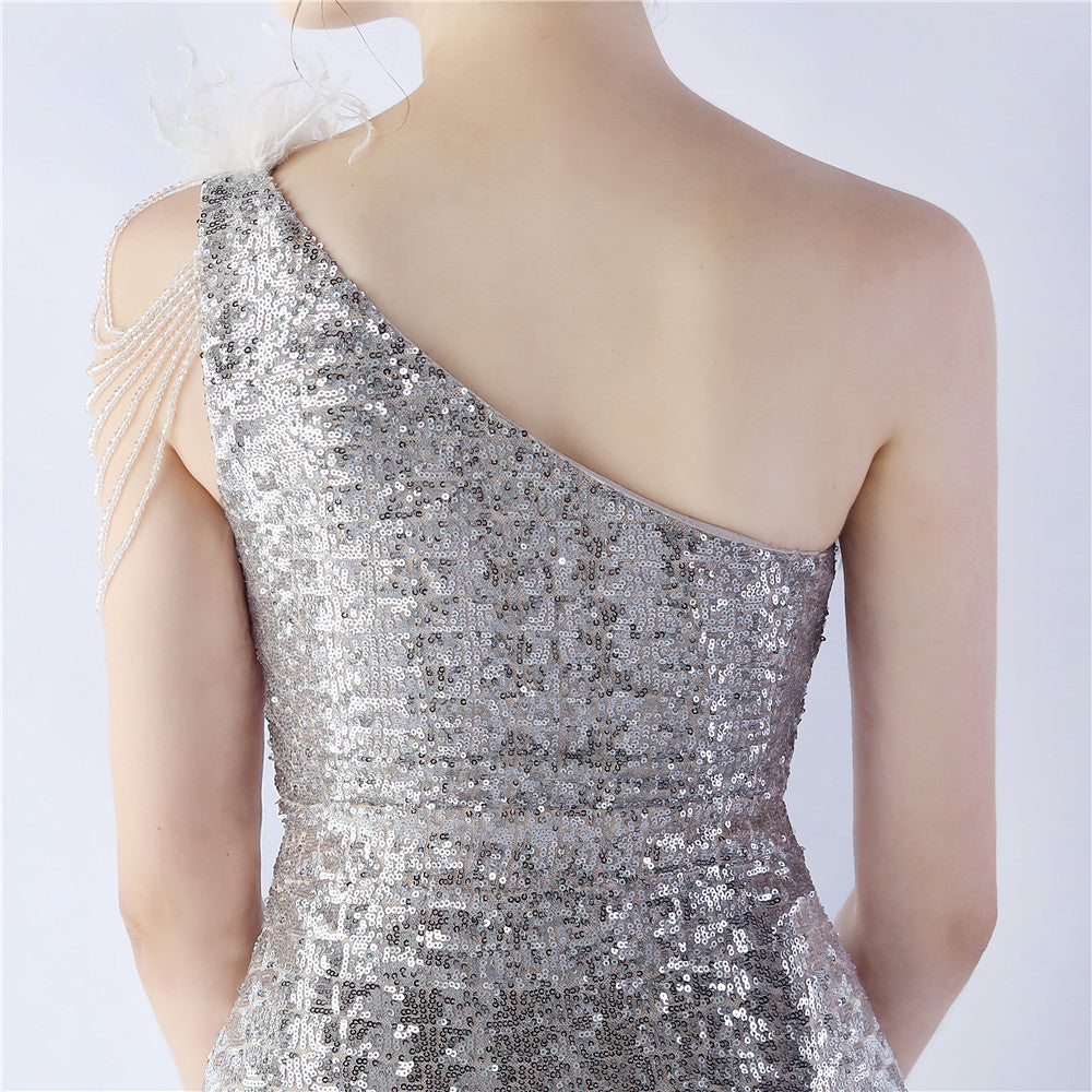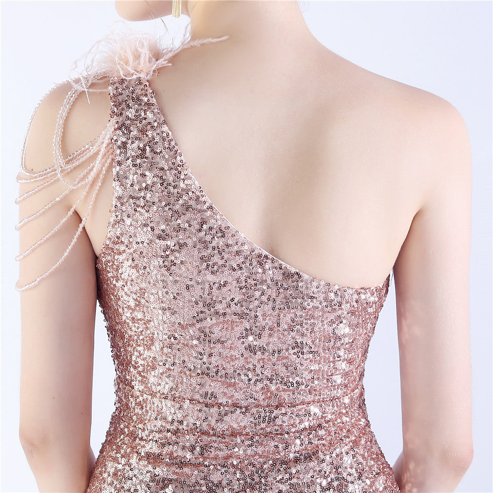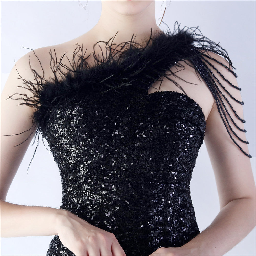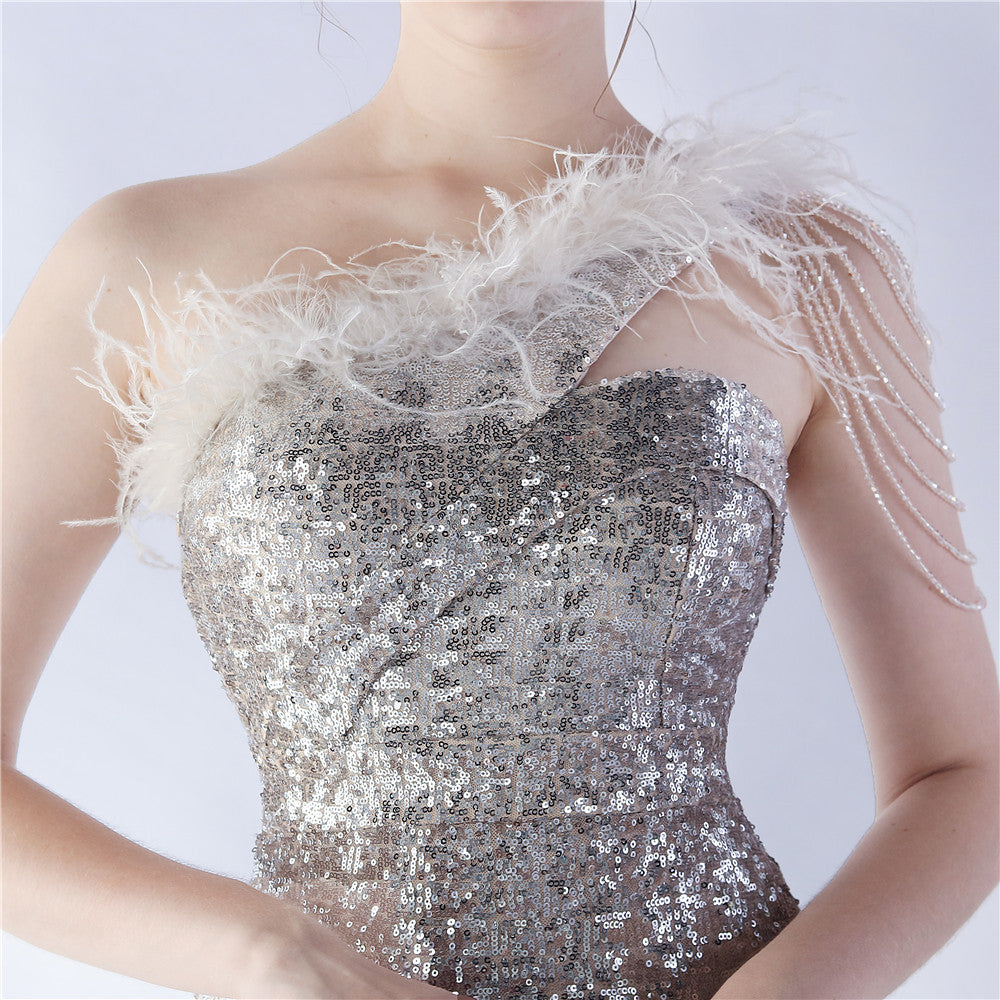 The dress presents a streamlined sequin maxi with a one-shoulder neckline and asymmetric feather accents. The silhouette is slim through the body with a long, floor-length hem.