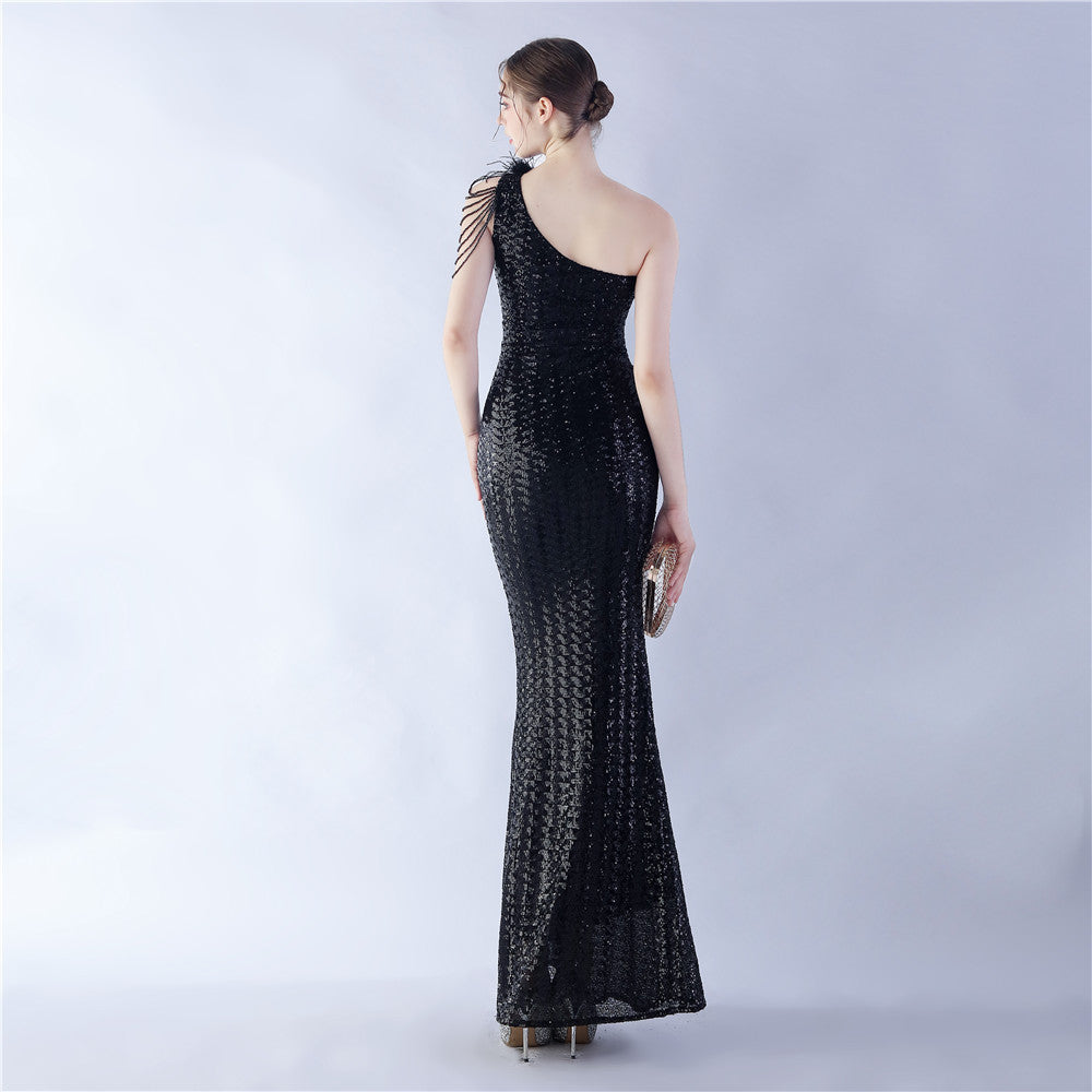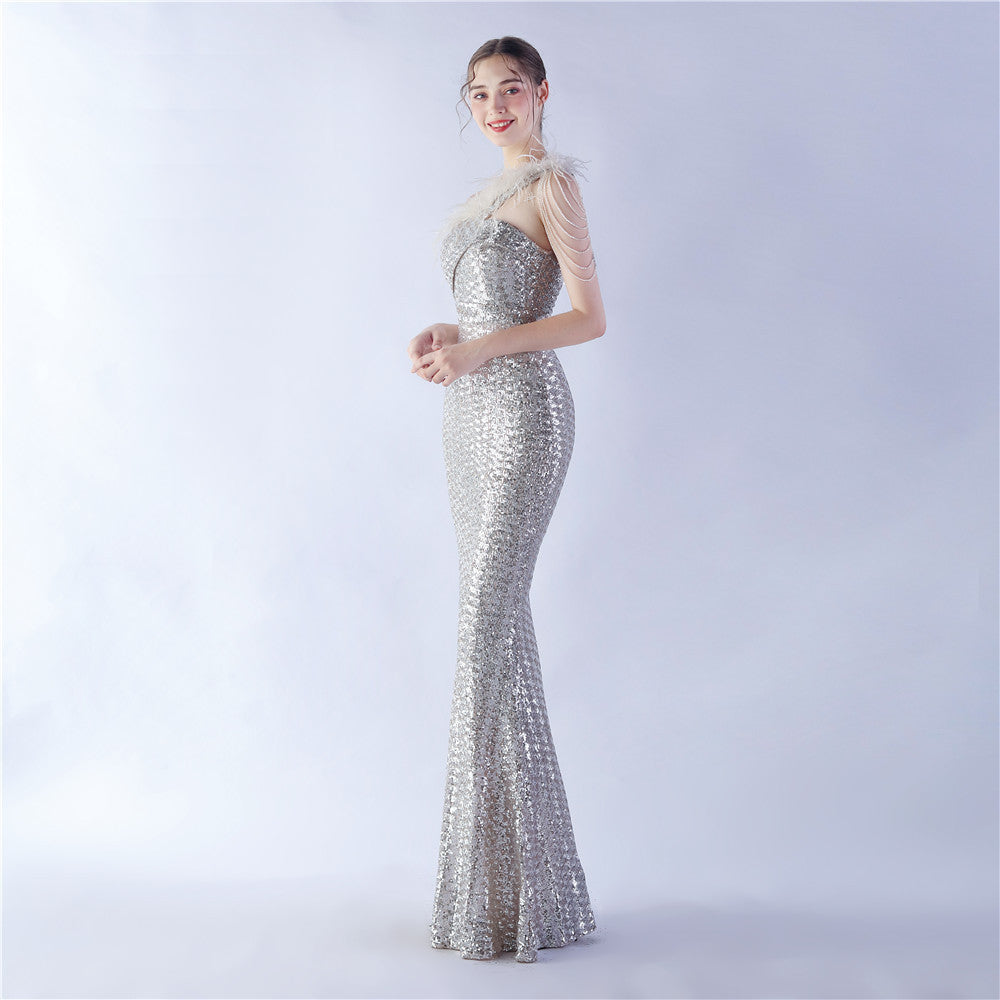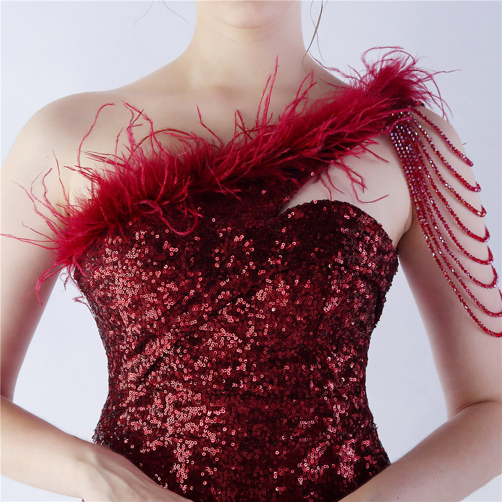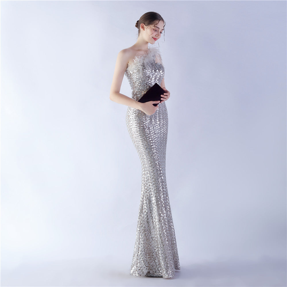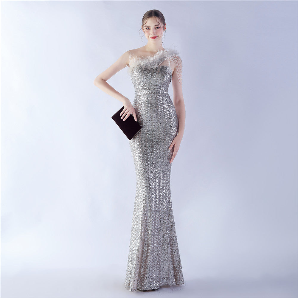 The dress presents a streamlined sequin maxi with a one-shoulder neckline and asymmetric feather accents. The silhouette is slim through the body with a long, floor-length hem.