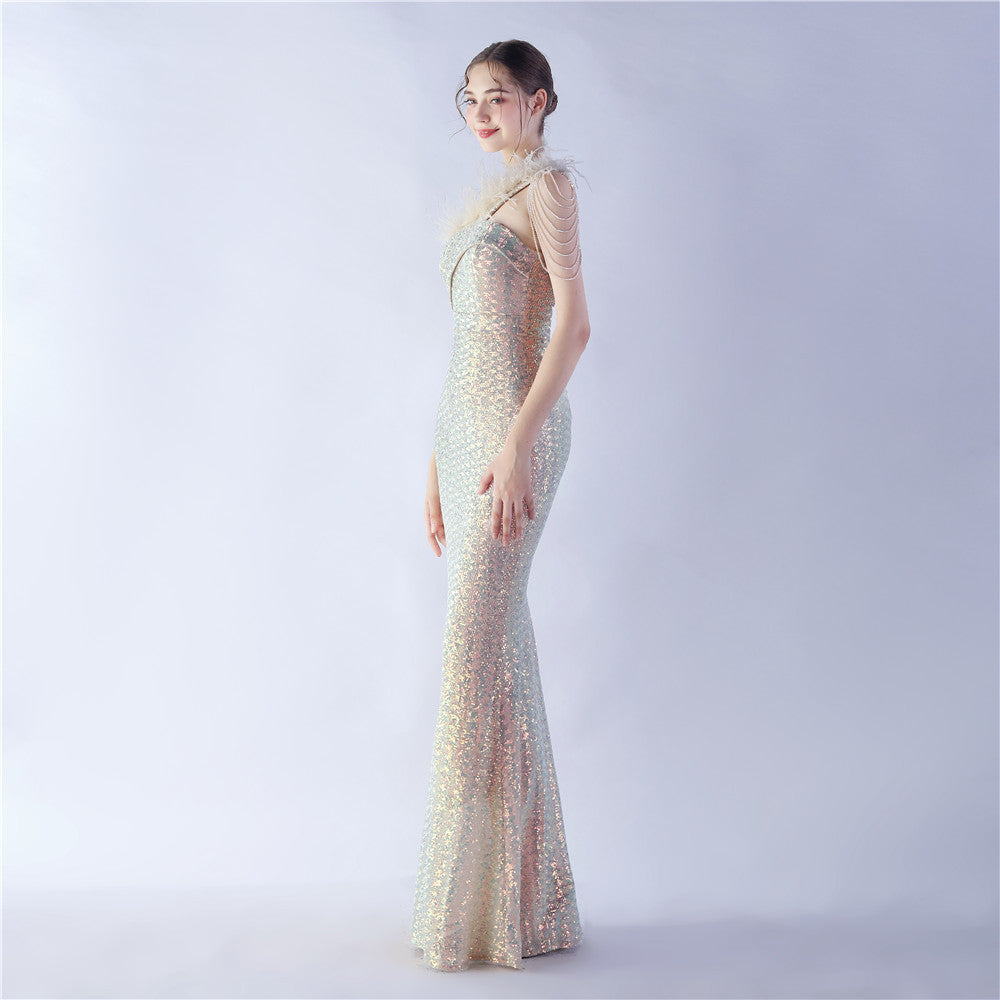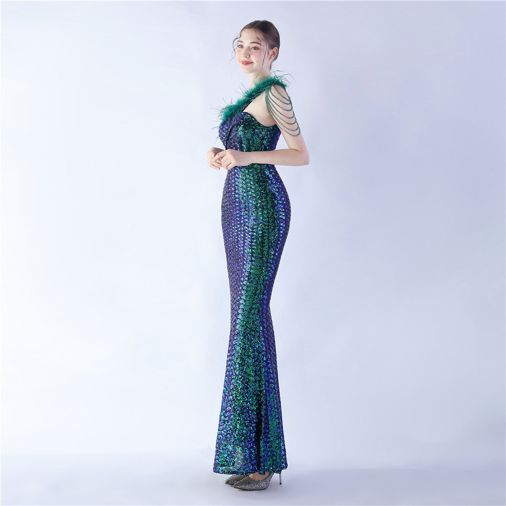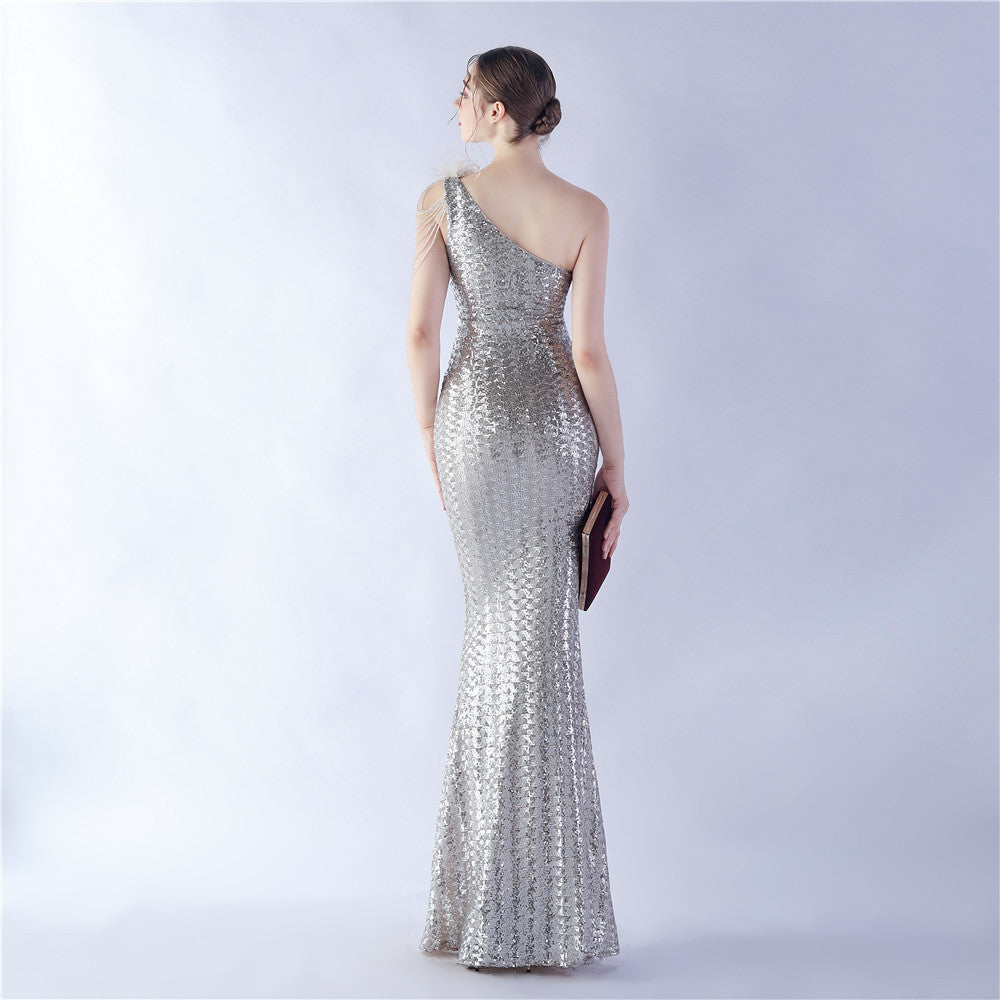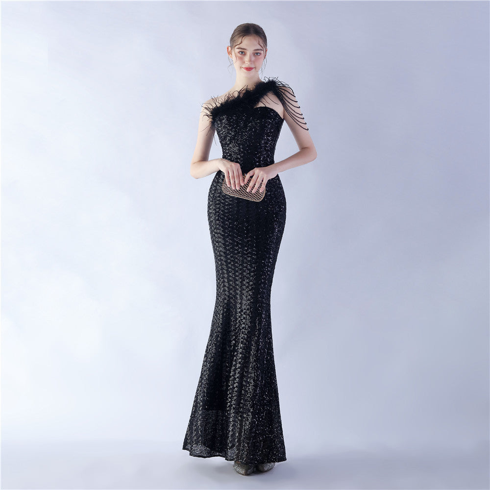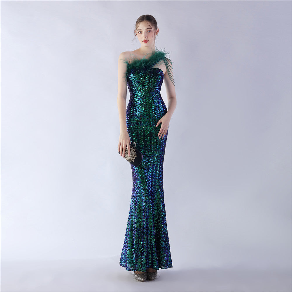 The dress presents a streamlined sequin maxi with a one-shoulder neckline and asymmetric feather accents. The silhouette is slim through the body with a long, floor-length hem.