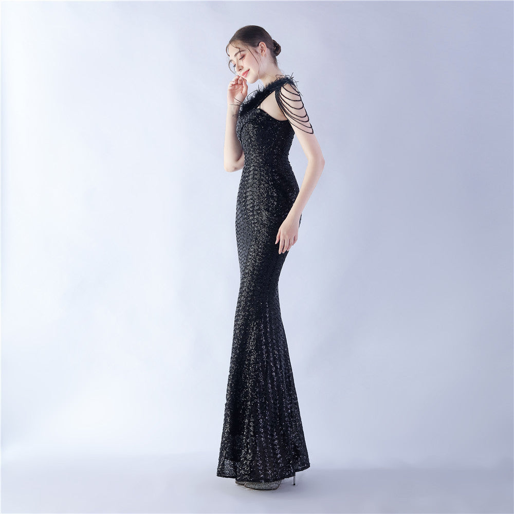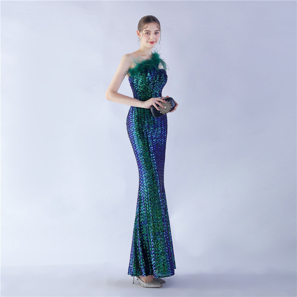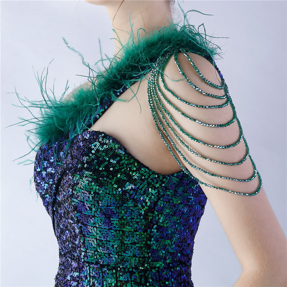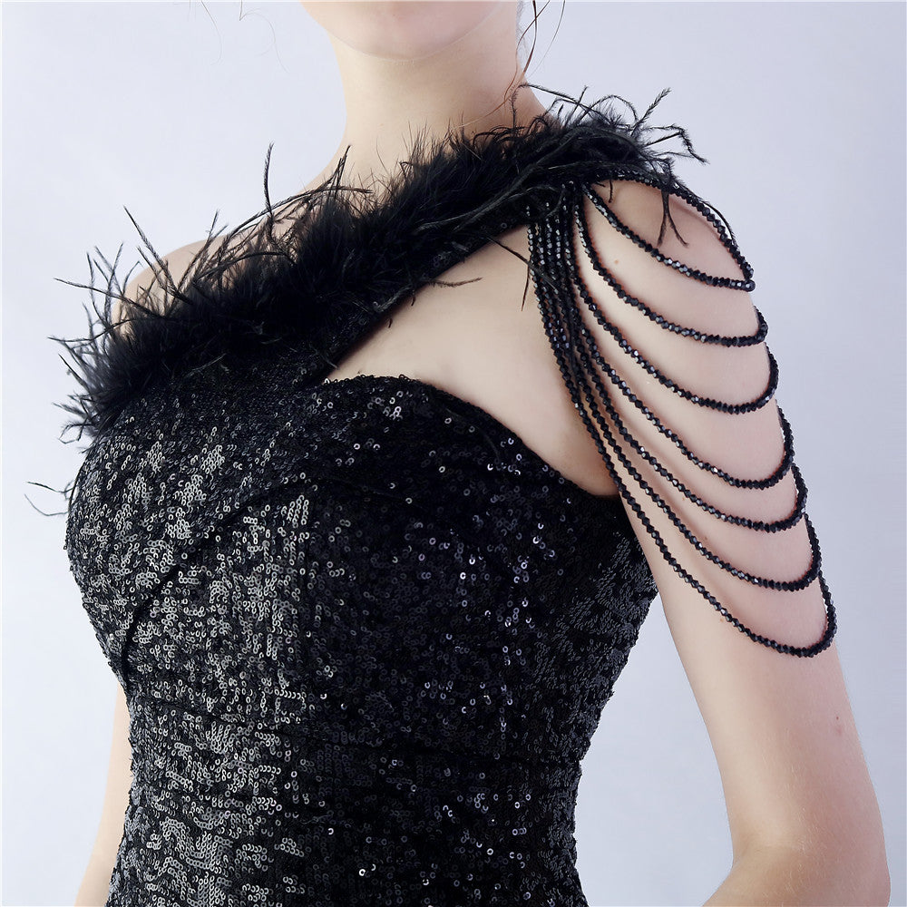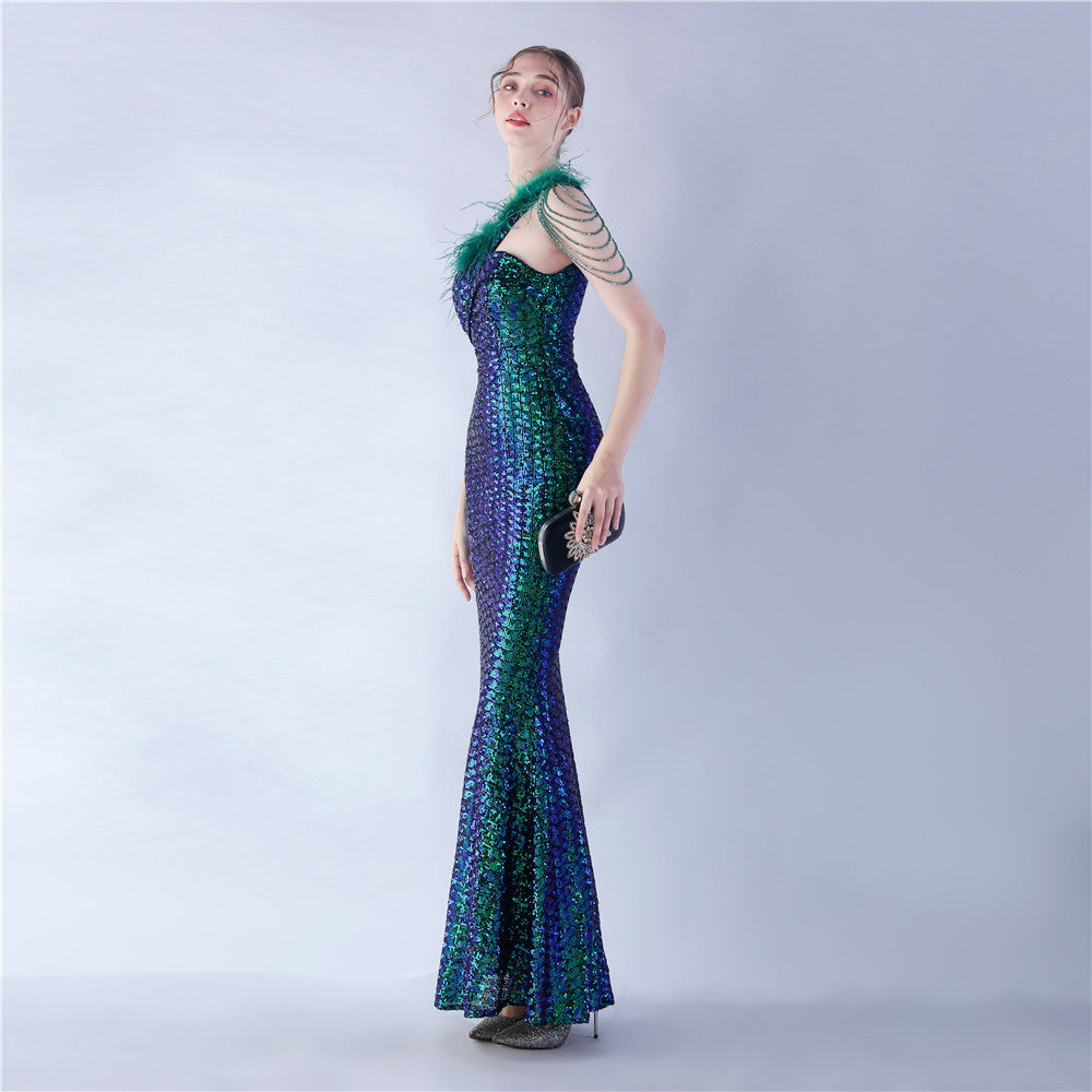 The dress presents a streamlined sequin maxi with a one-shoulder neckline and asymmetric feather accents. The silhouette is slim through the body with a long, floor-length hem.