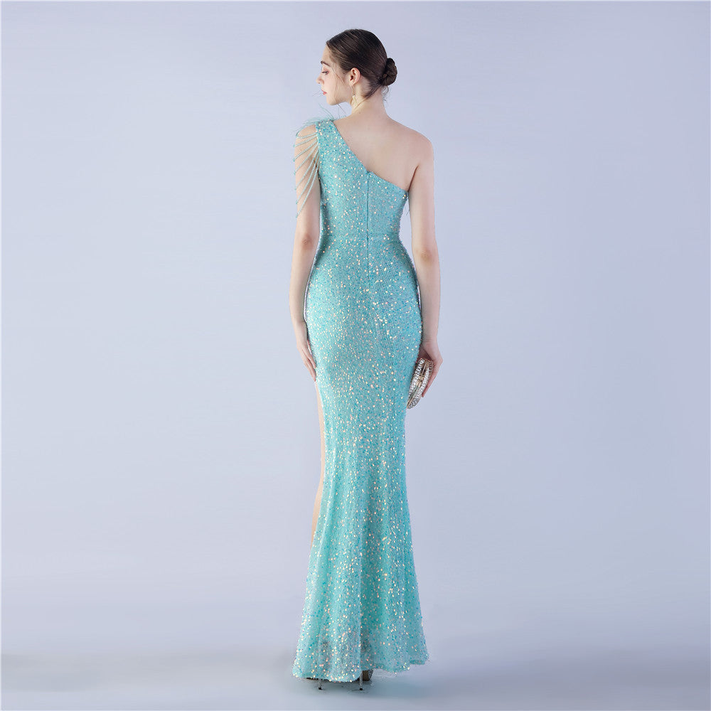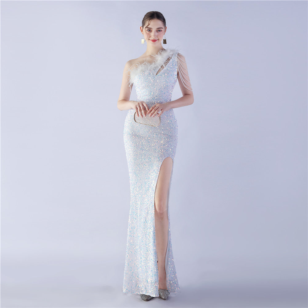 The dress presents a sleek maxi silhouette with a one-shoulder neckline. Ostrich hair texture accents the drape, with an asymmetric line and a side split.